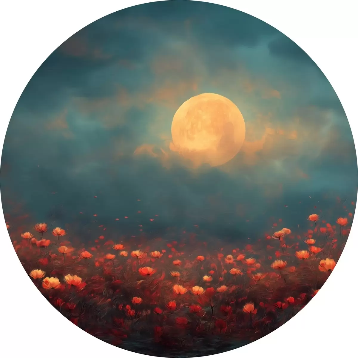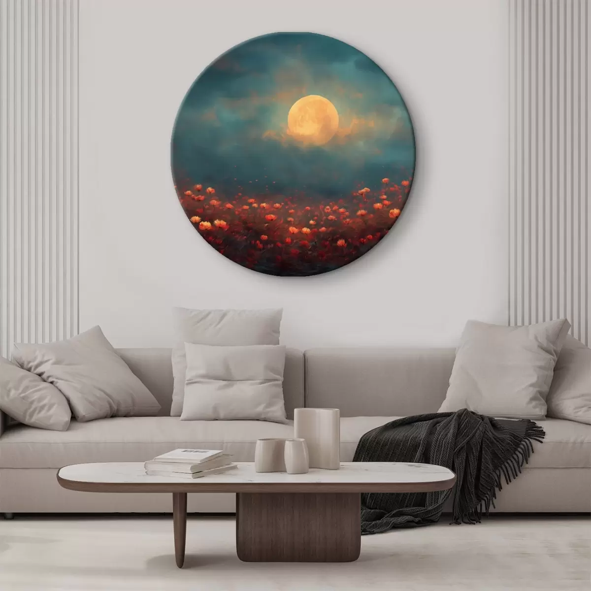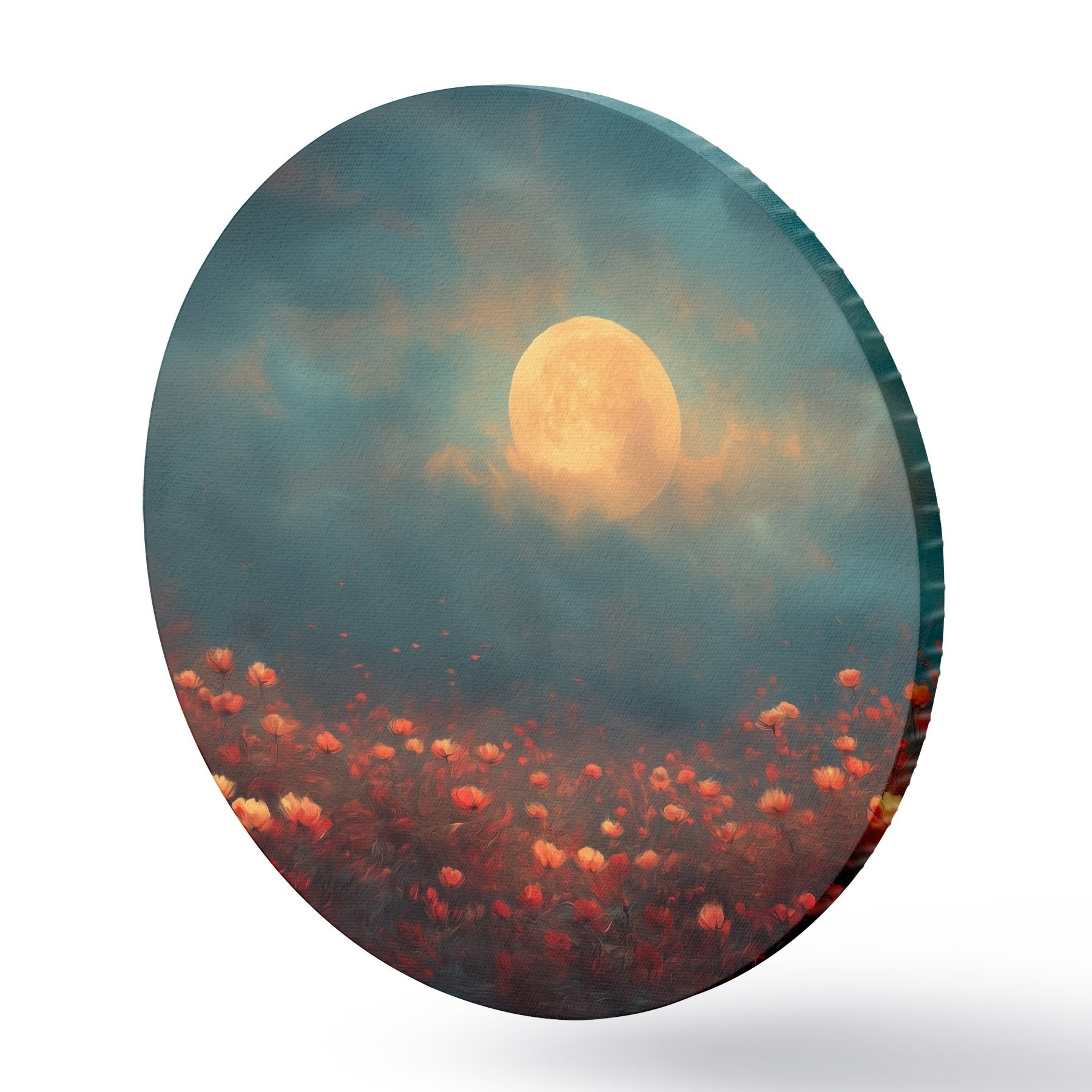 Runde Gemälde Mond über einem Feld voller roter Blumen an einem nebligen Abendhimmel r46167