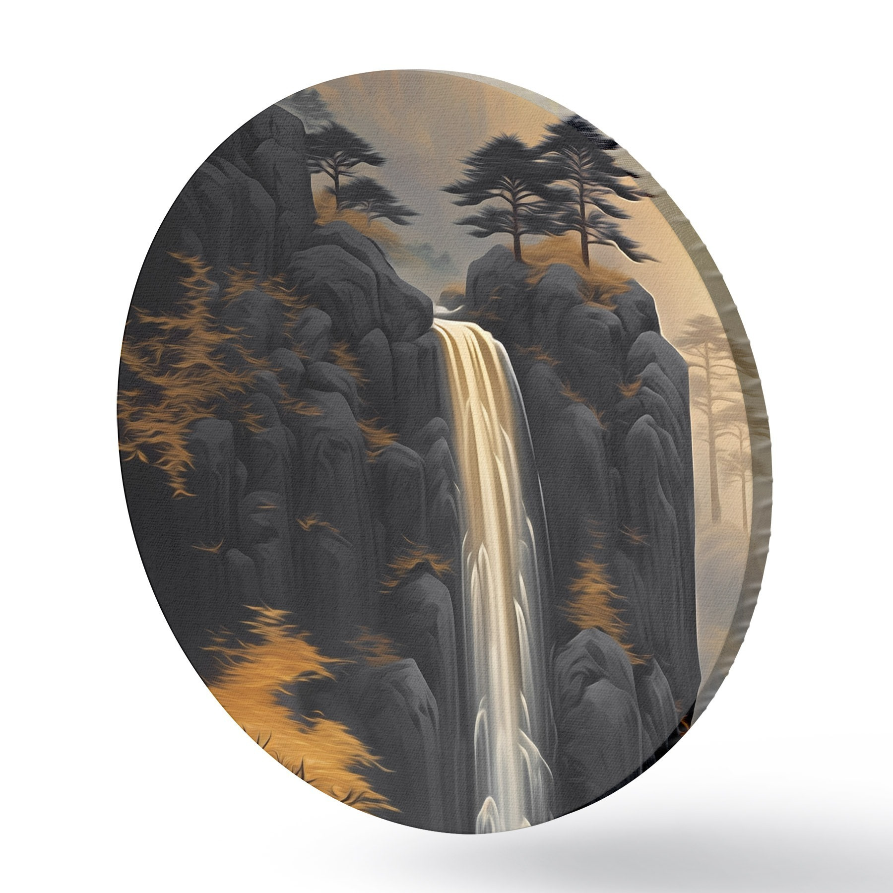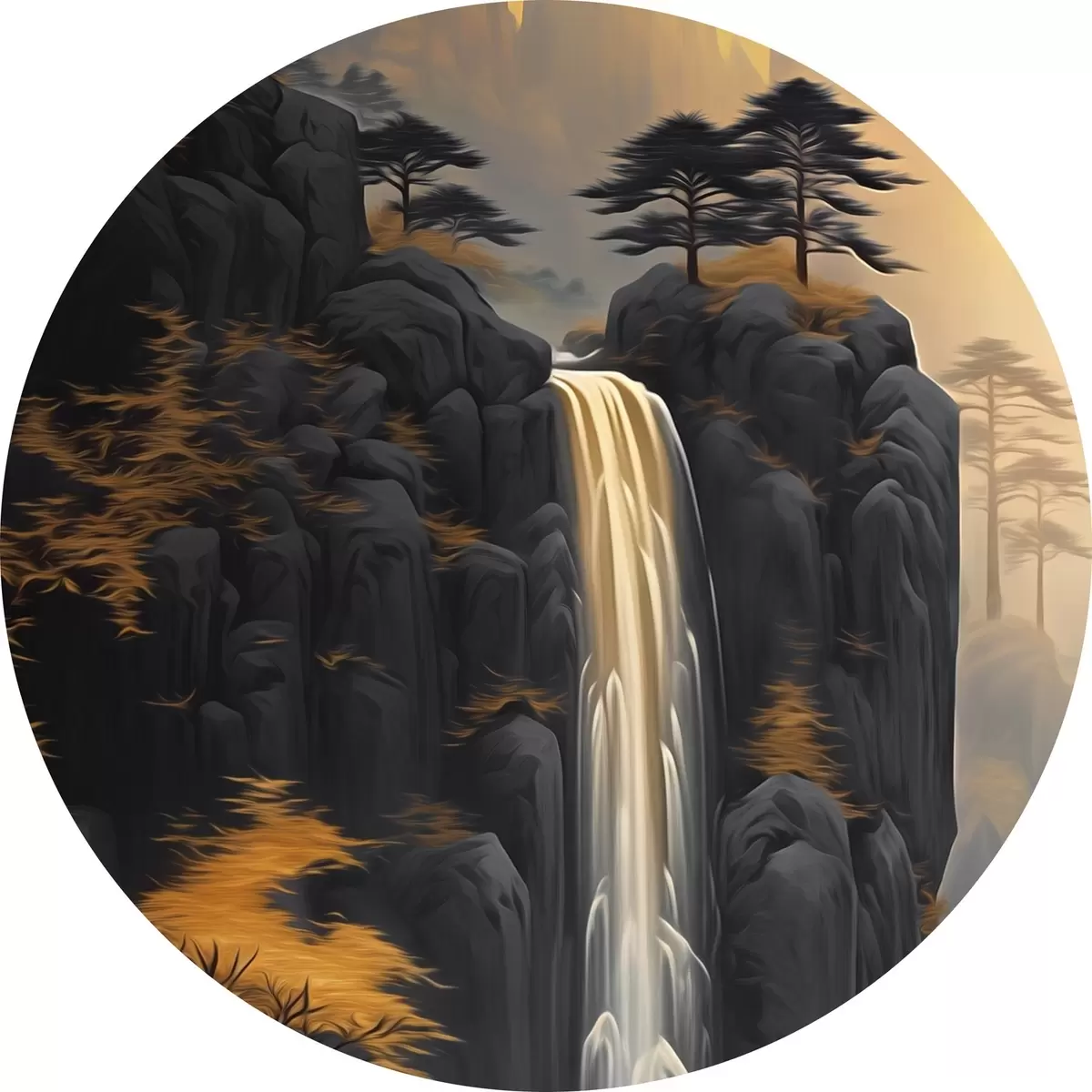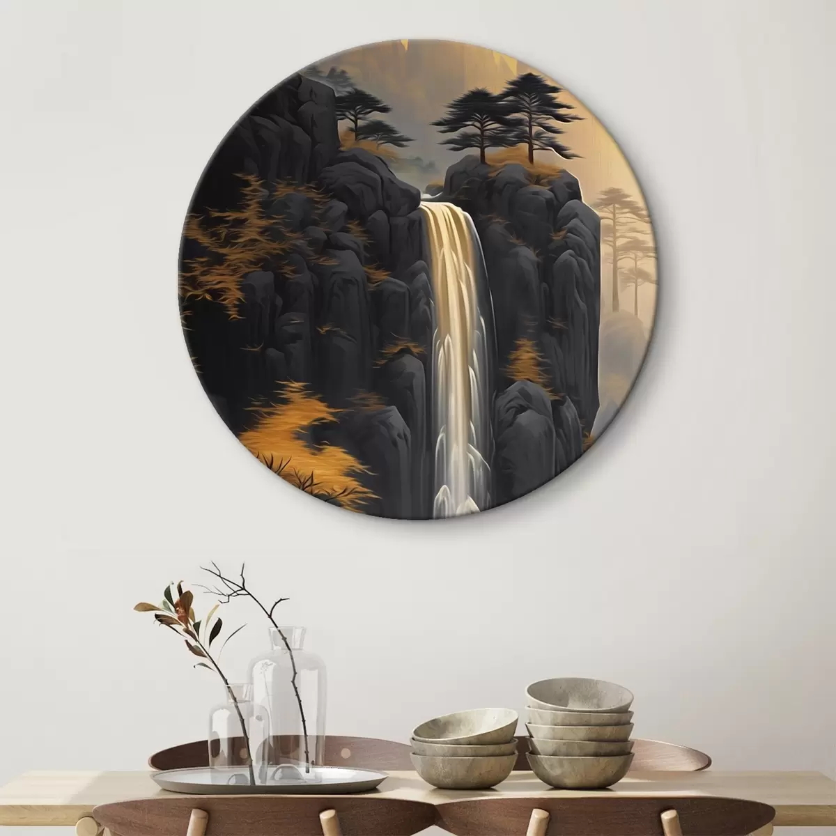 Runde Gemälde Felsige Landschaft mit einem Wasserfall in warmen Sonnenuntergangsfarben r46177