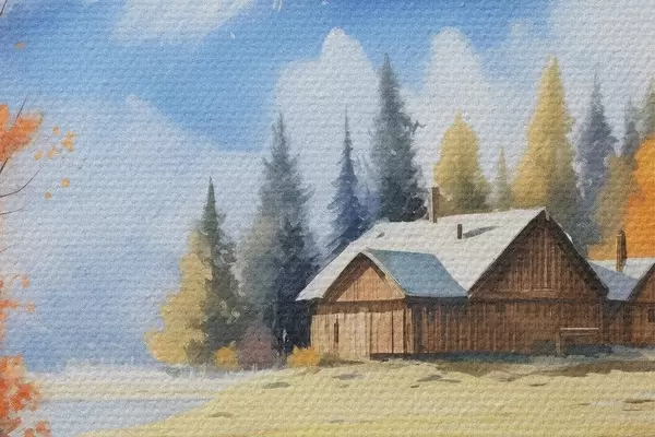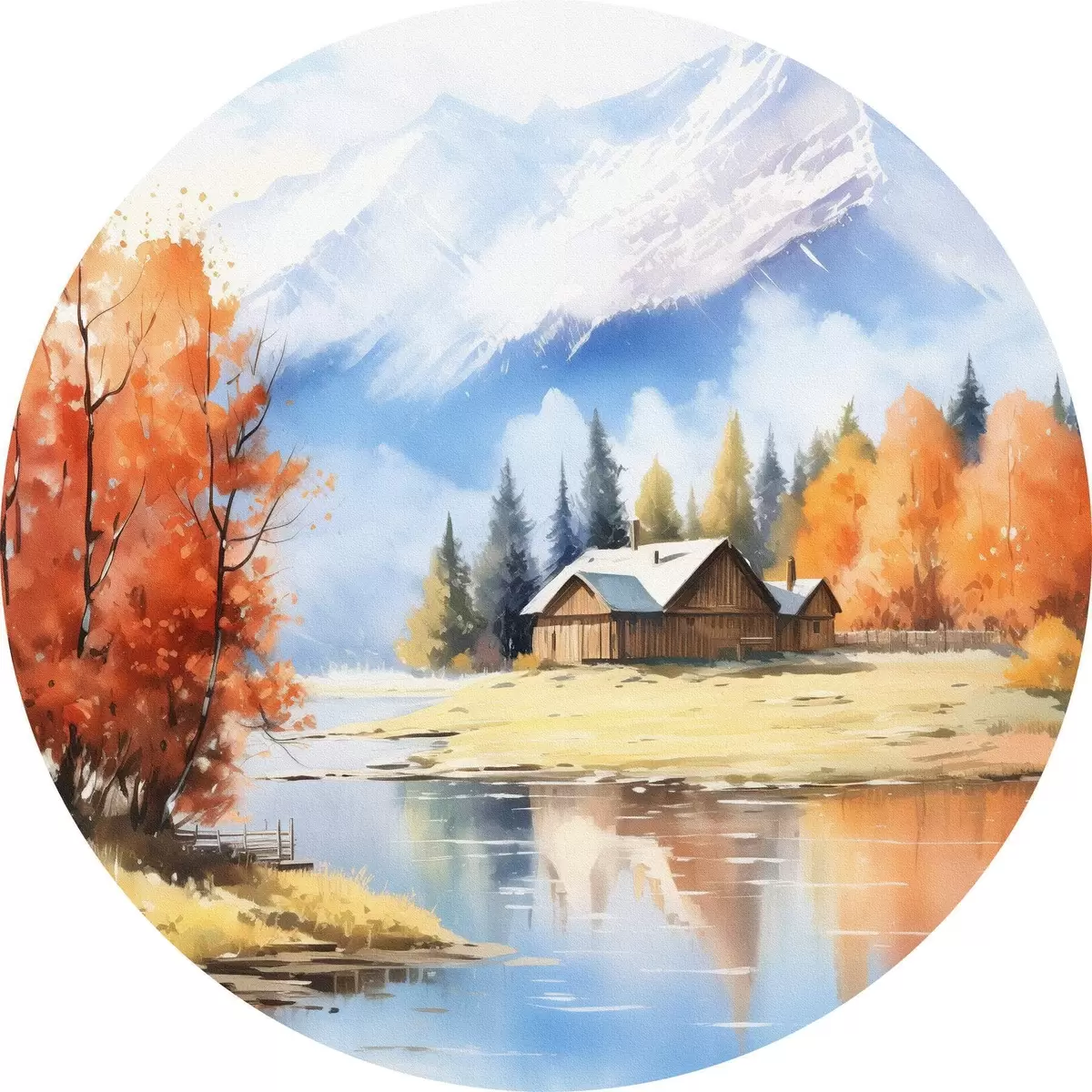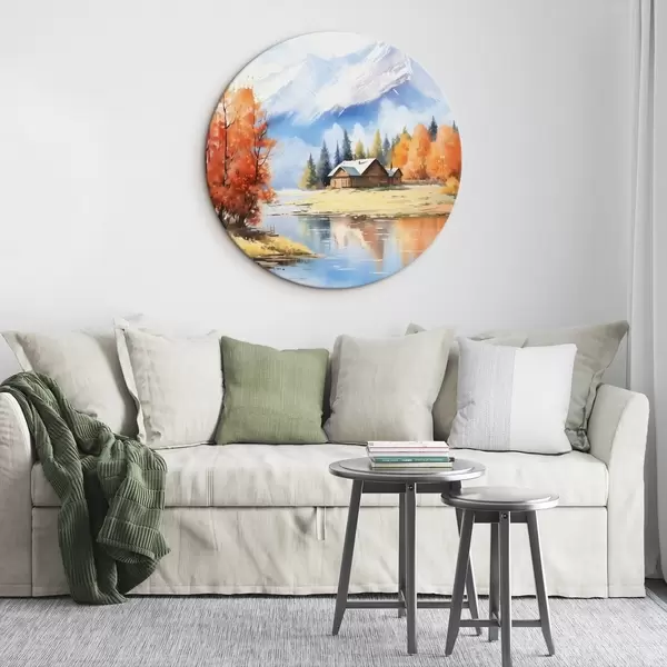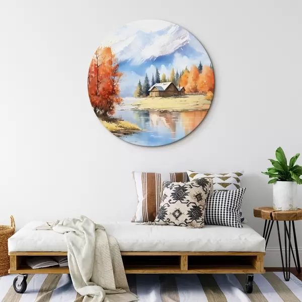 Runde Gemälde Herbstlandschaft am See mit einem Haus und Bergen r46184