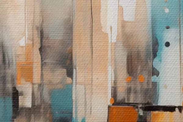 Bild Abstrakte Stadtlandschaft mit orangefarbenen, blaugrünen und braunen vertikalen Pinselstrichen und geometrischen Formen Nr r46266