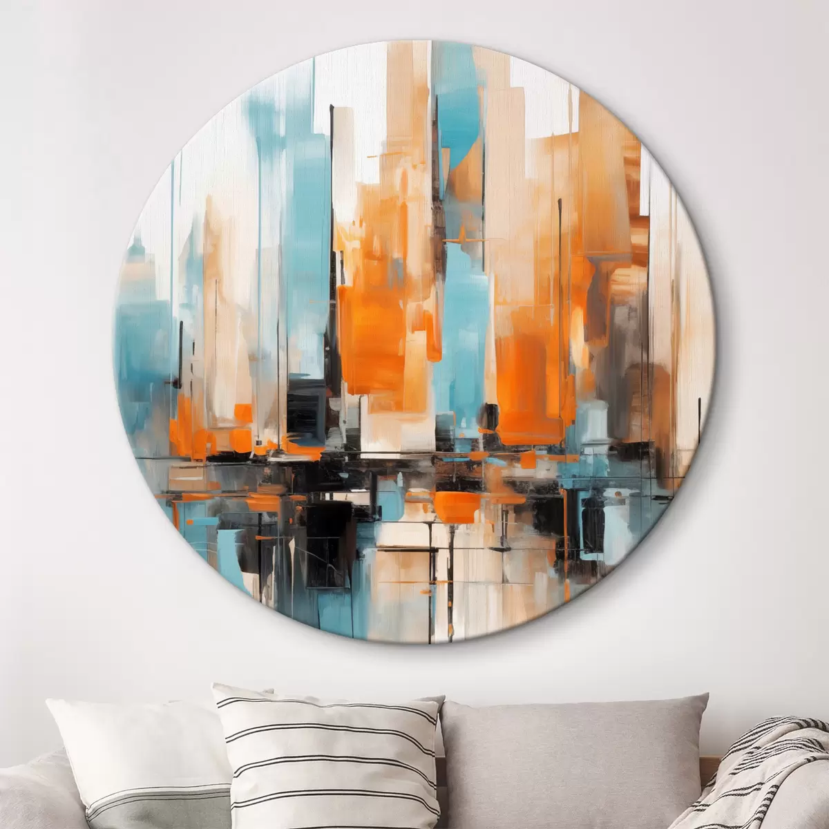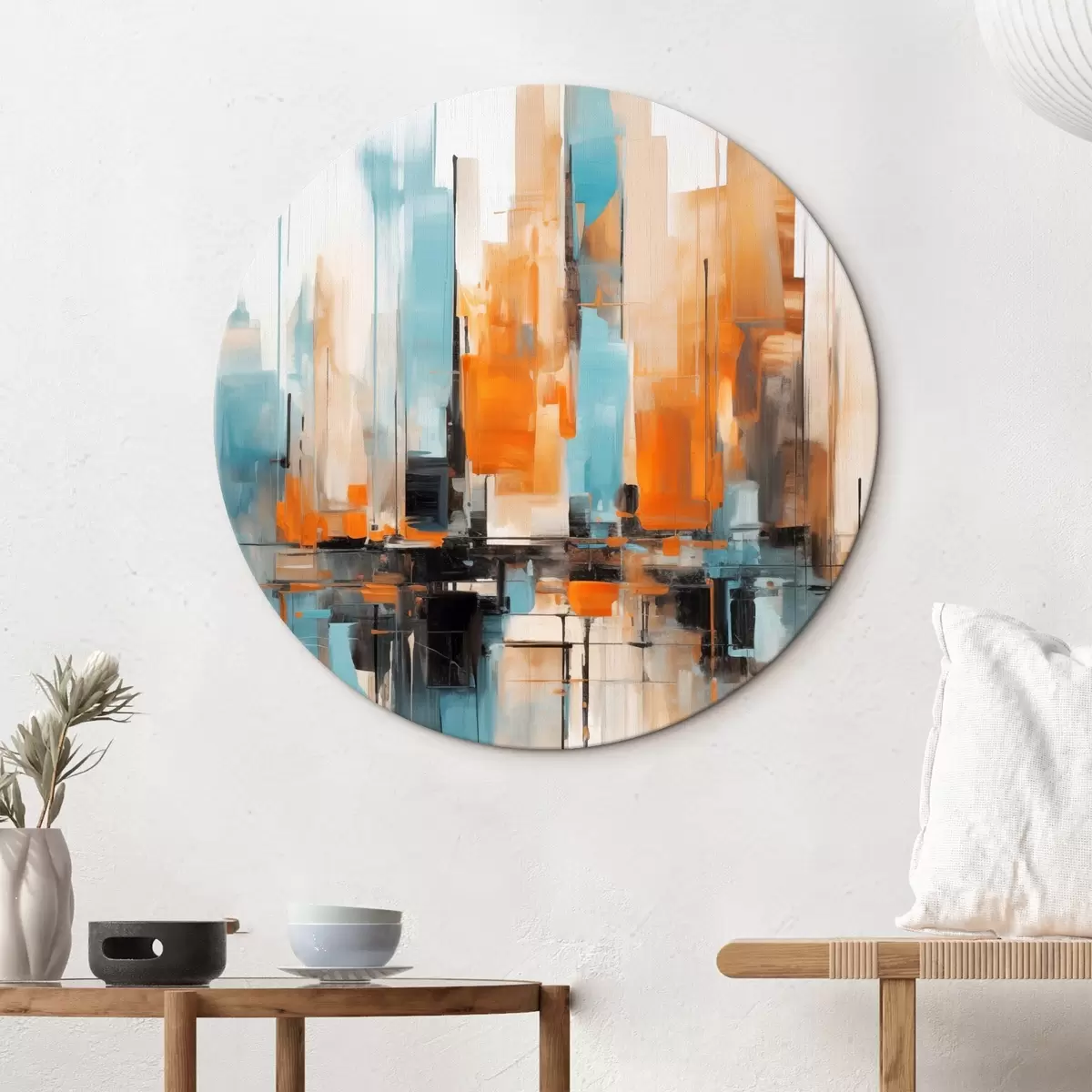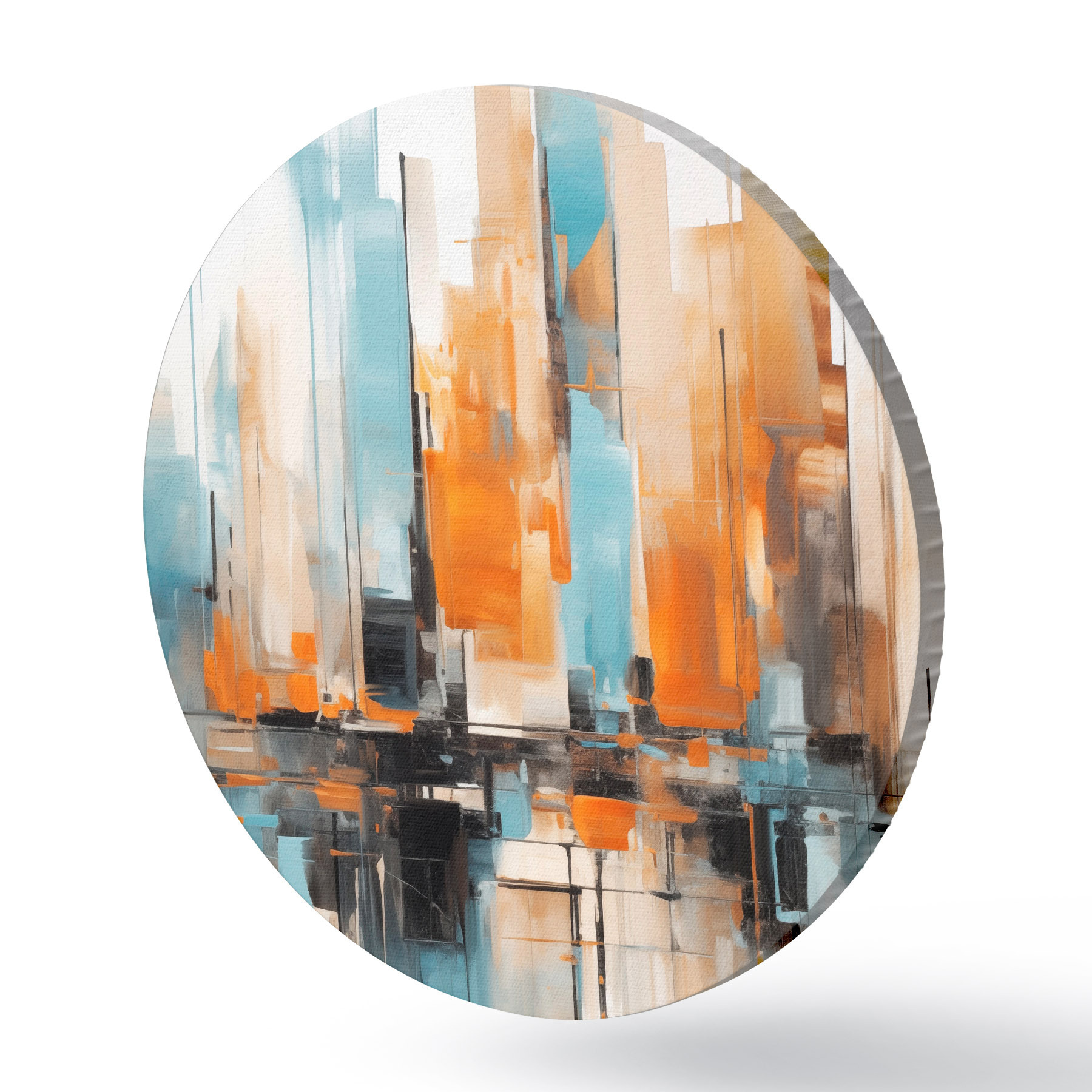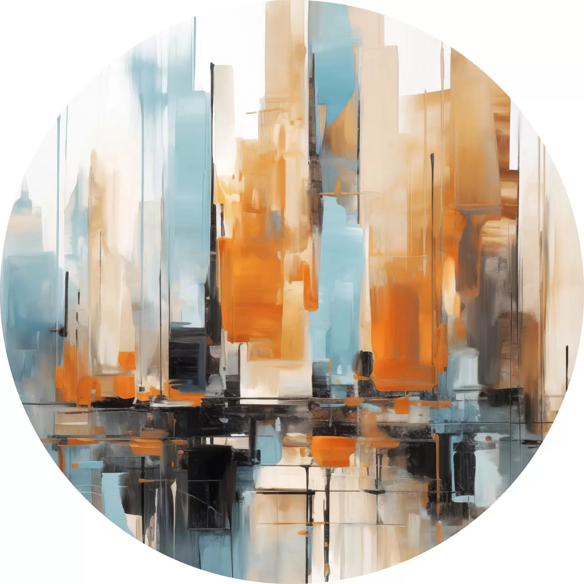 Runde Gemälde Abstrakte Stadtlandschaft mit vertikalen Pinselstrichen in Orange-, Blau- und Weißtönen, Malstil r46267