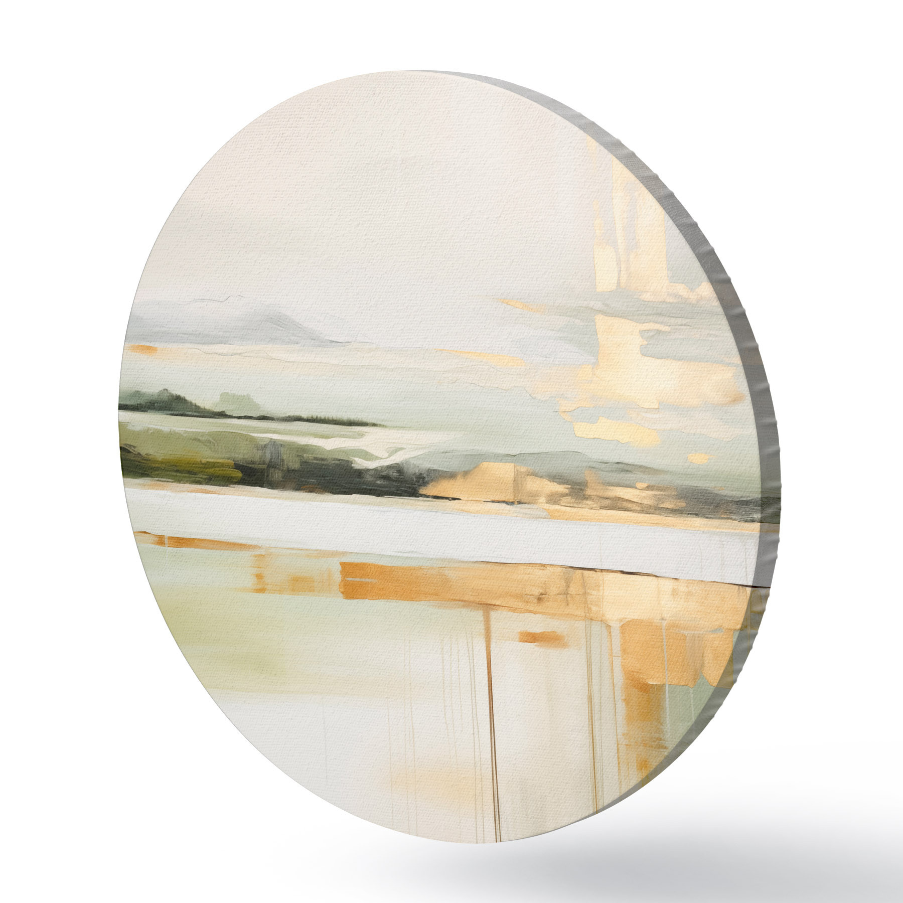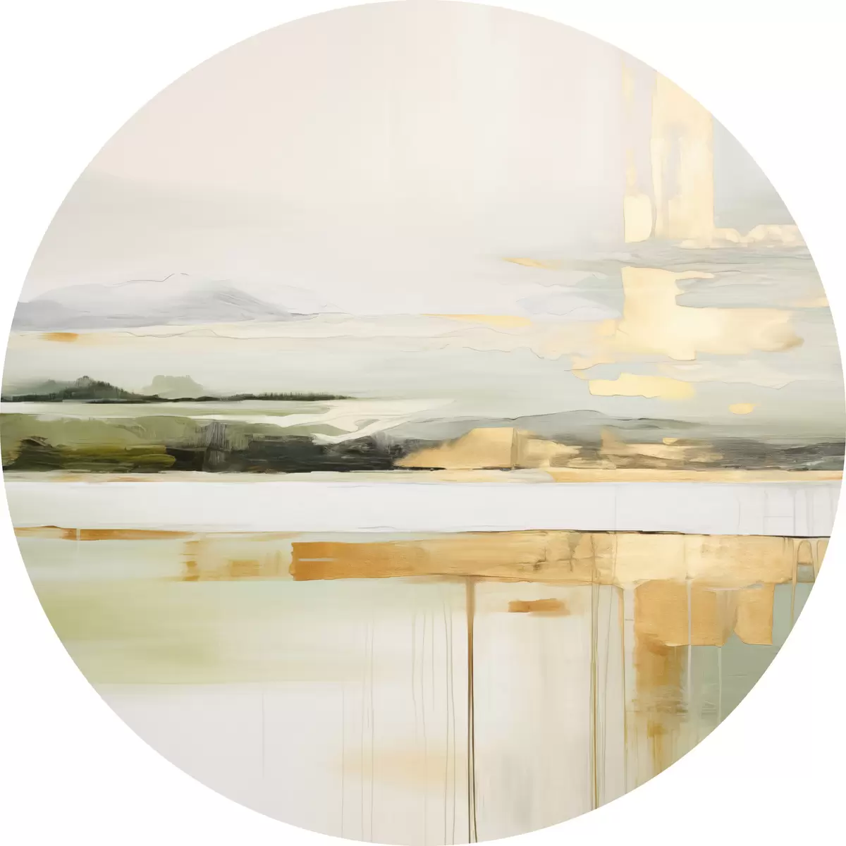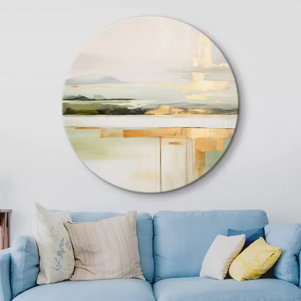 Runde Gemälde Abstrakte Landschaft mit gelben Akzenten, eine minimalistische Komposition aus Land, Wasser und Himmel, mit gedämpften Farben r46268