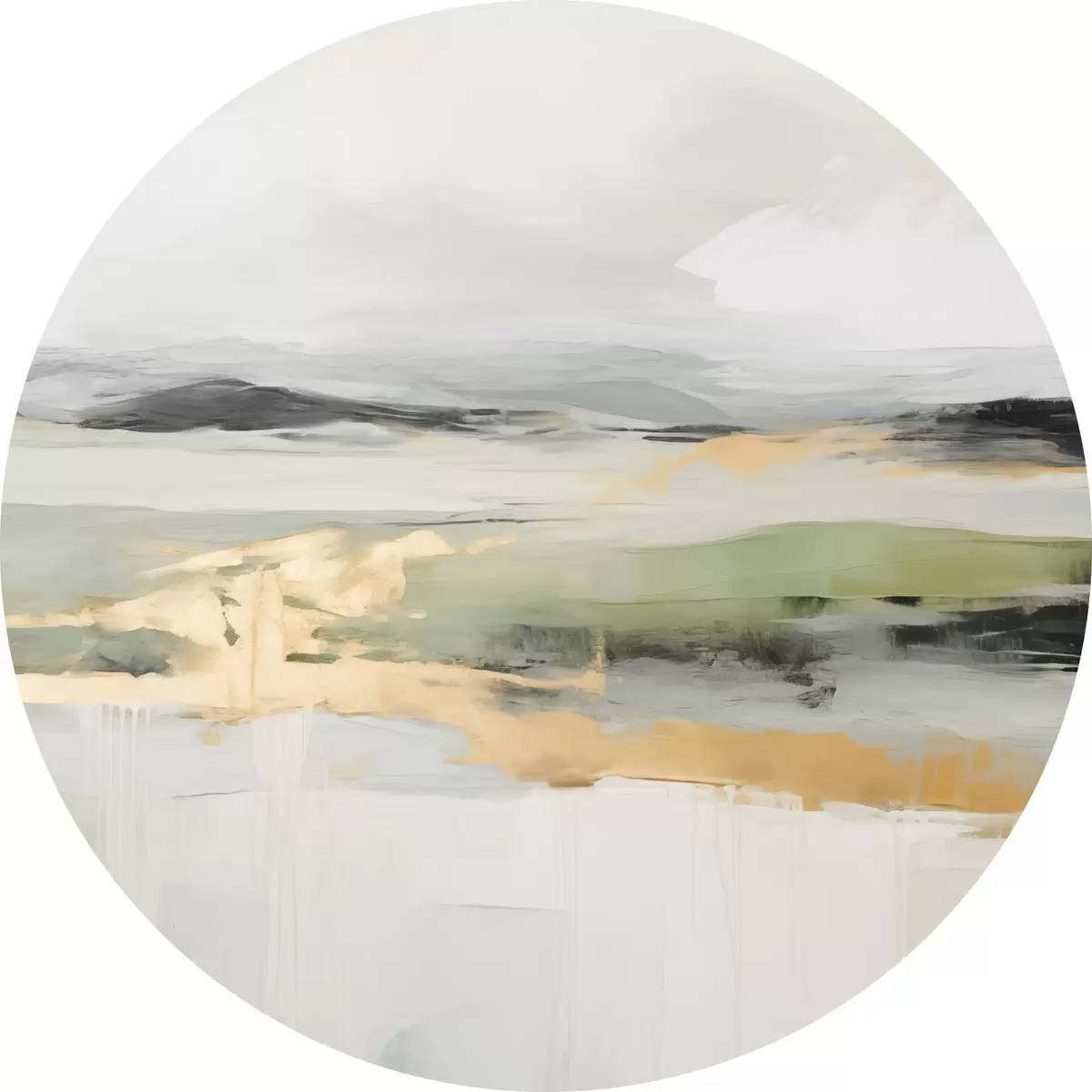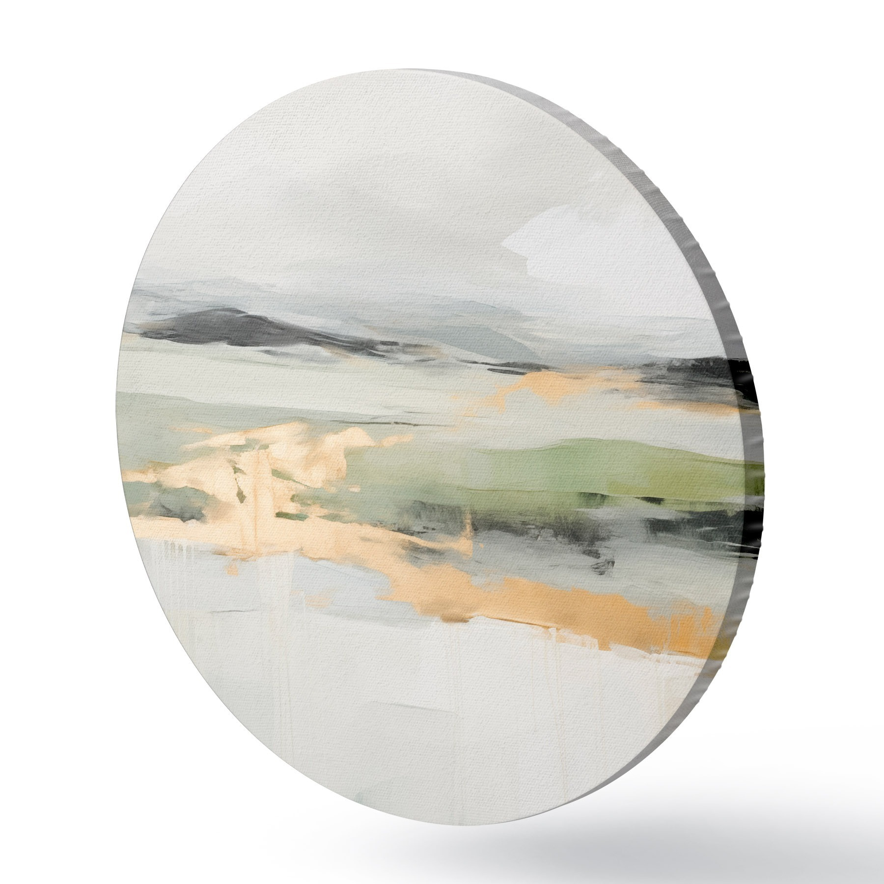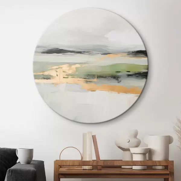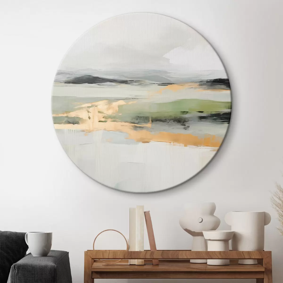 Runde Gemälde Abstrakte Landschaft mit gelben Akzenten, eine minimalistische Komposition aus Land, Wasser und Himmel, mit gedämpften Farben r46269