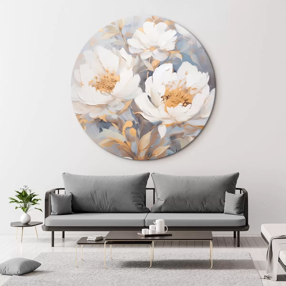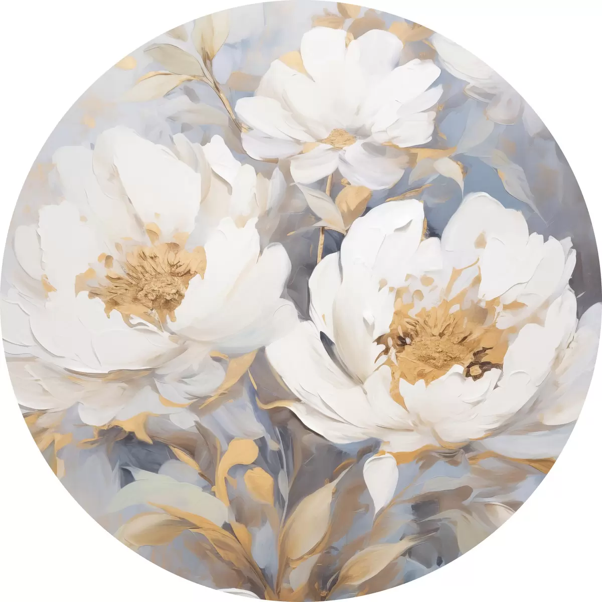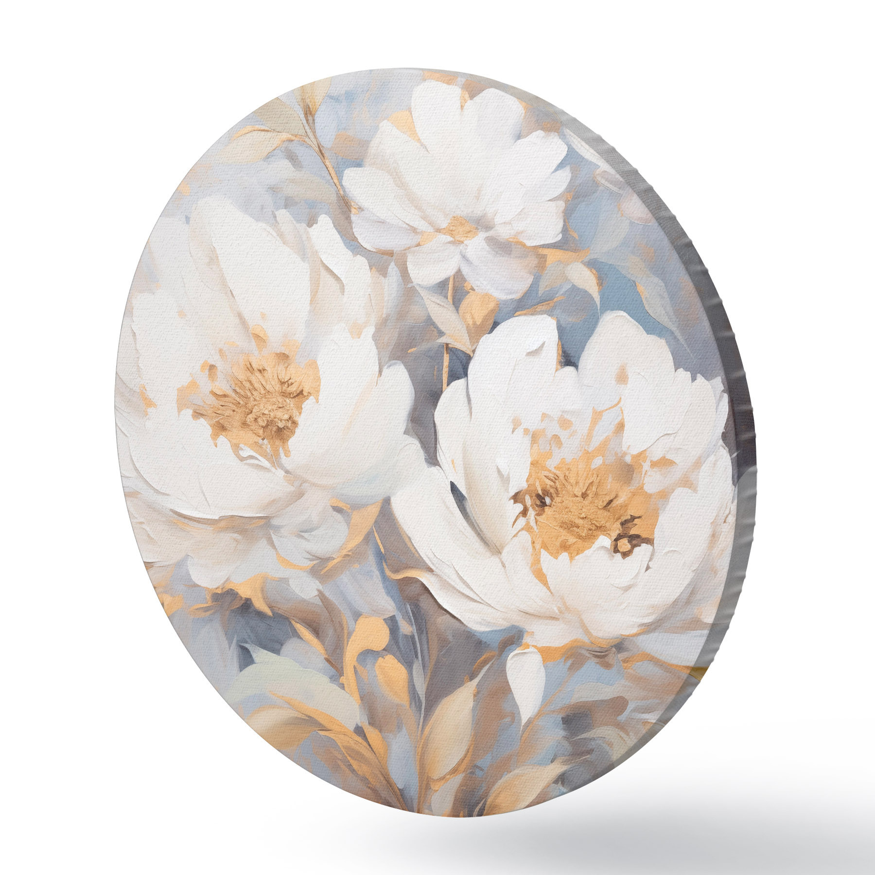 Runde Gemälde Weiße Pfingstrosen mit blauen Blütenkernen und Blättern, sanfte Pinselstriche, hellblauer Hintergrund, Blumenarrangement r46270