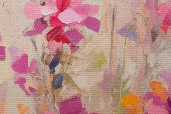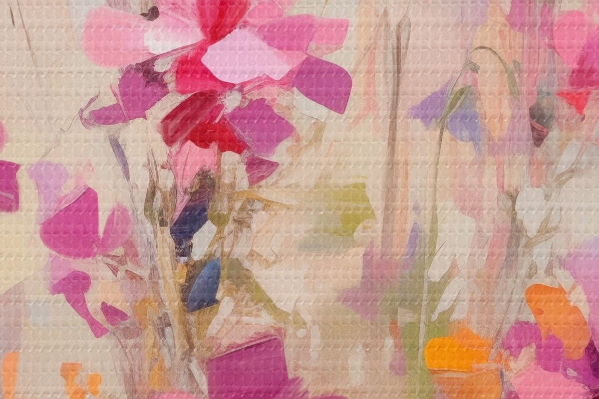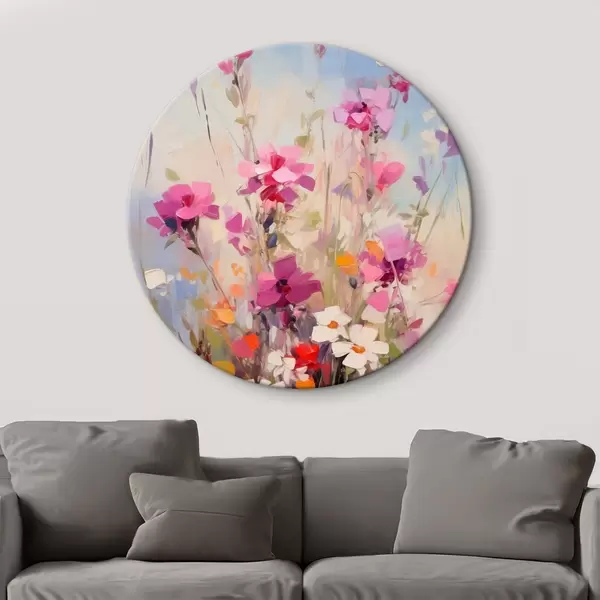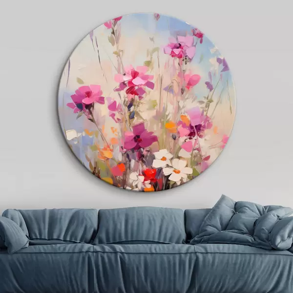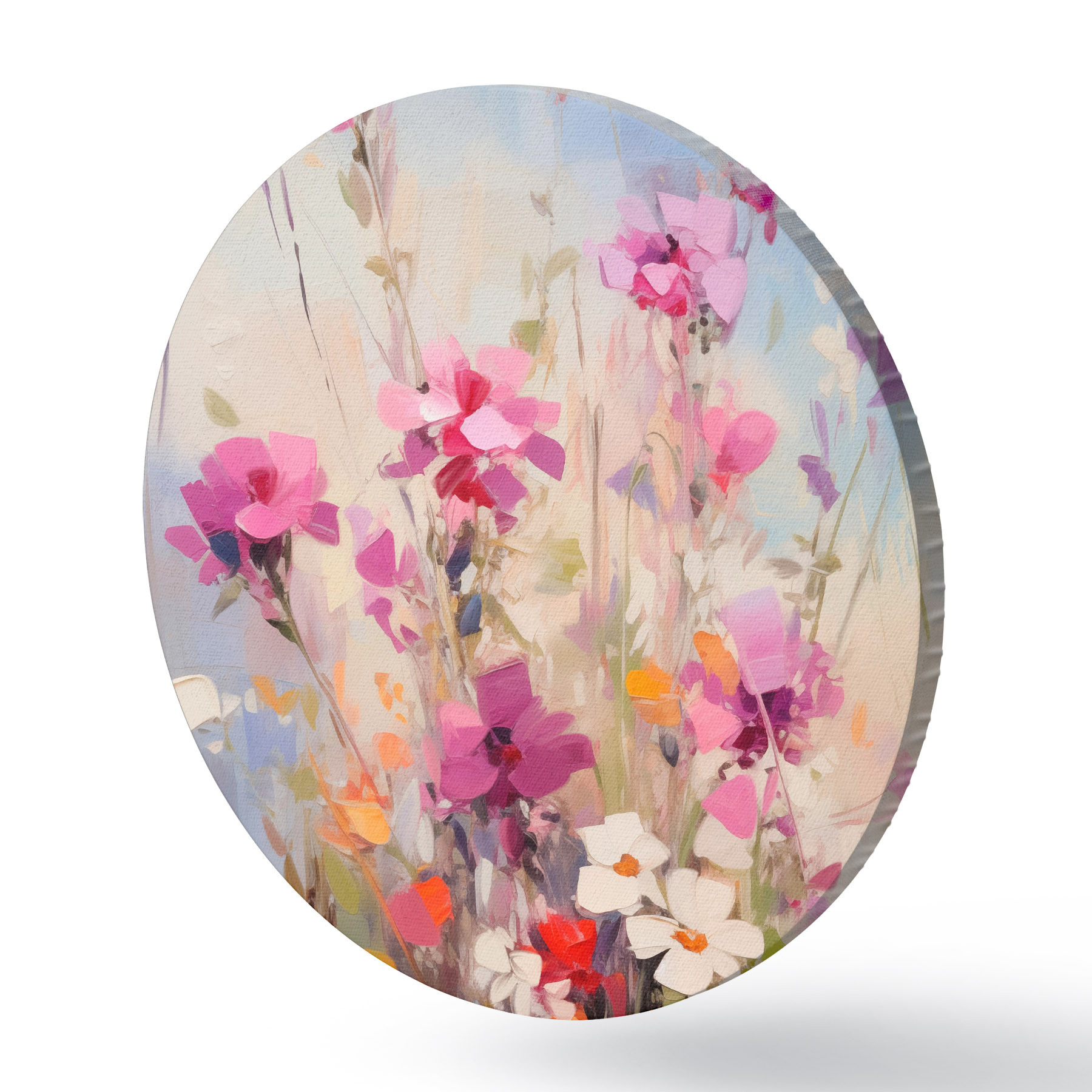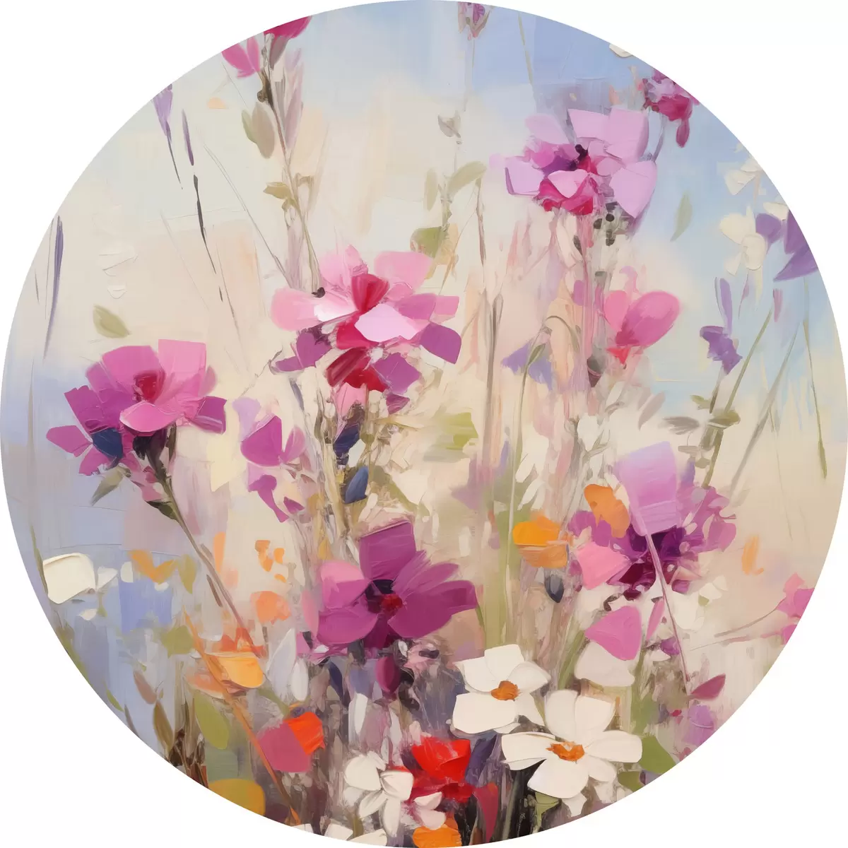 Runde Gemälde Leuchtend rosa, weiße und grüne Blumen vor einem sanften, pastellfarbenen Hintergrund r46278