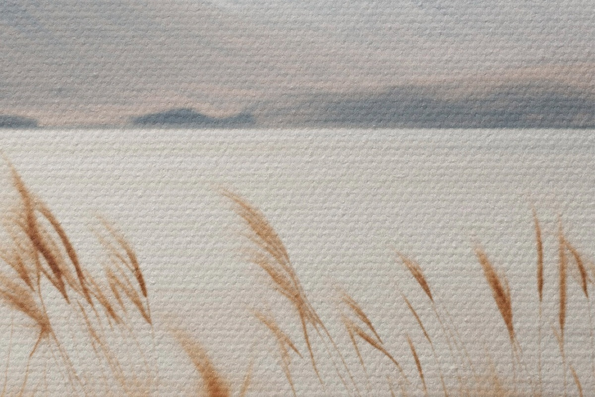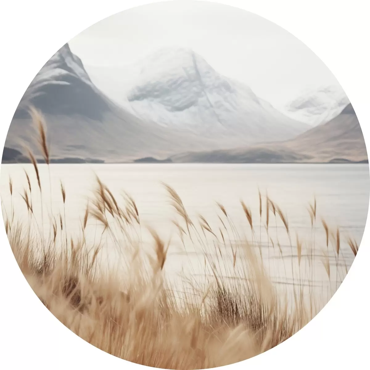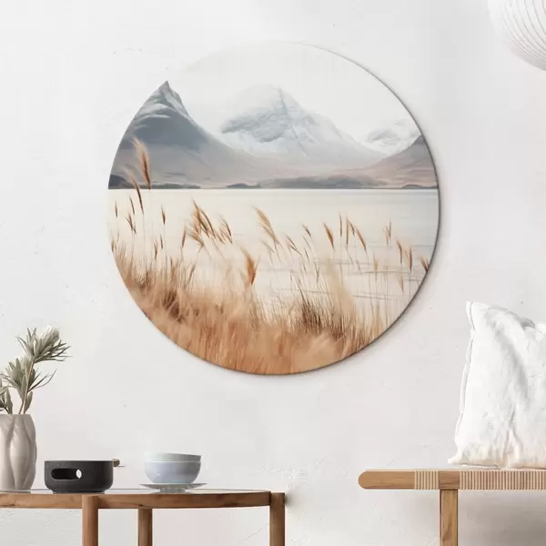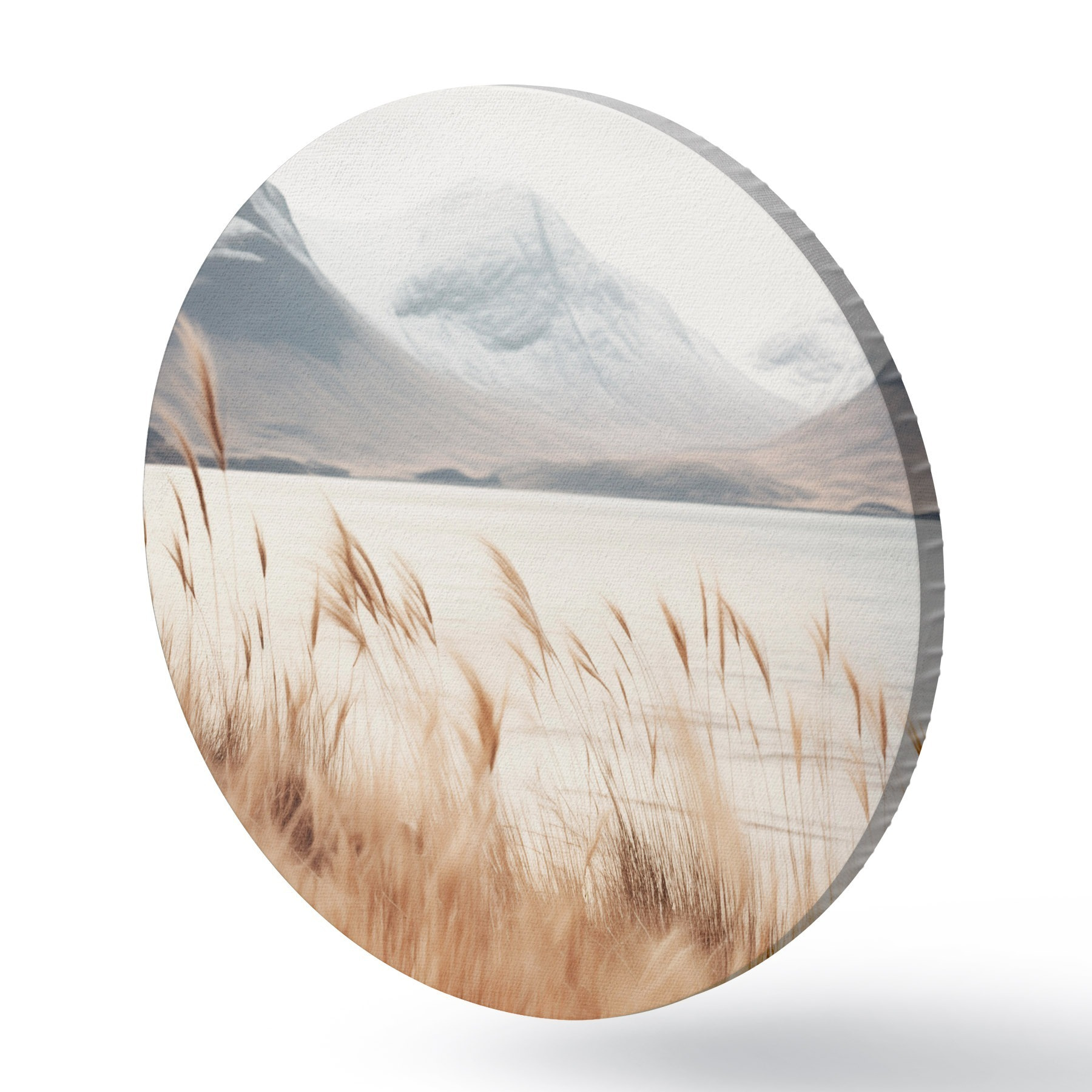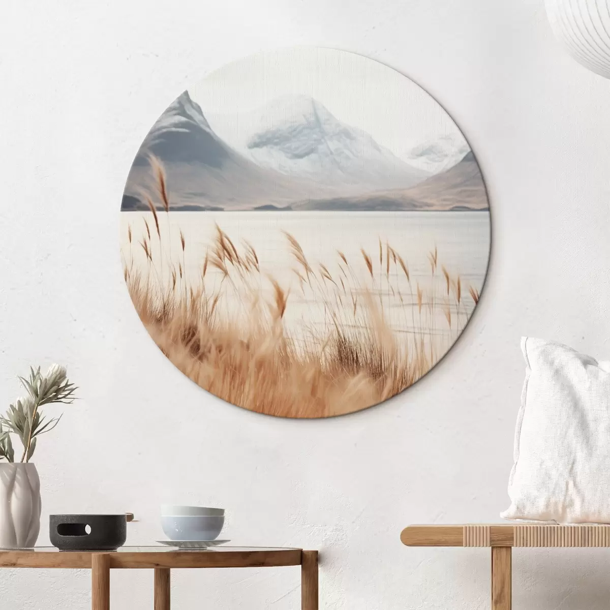 Runde Gemälde Pampasgrasfeld vor einer Seenlandschaft mit schneebedeckten Bergen im Hintergrund, weiches Licht r46282