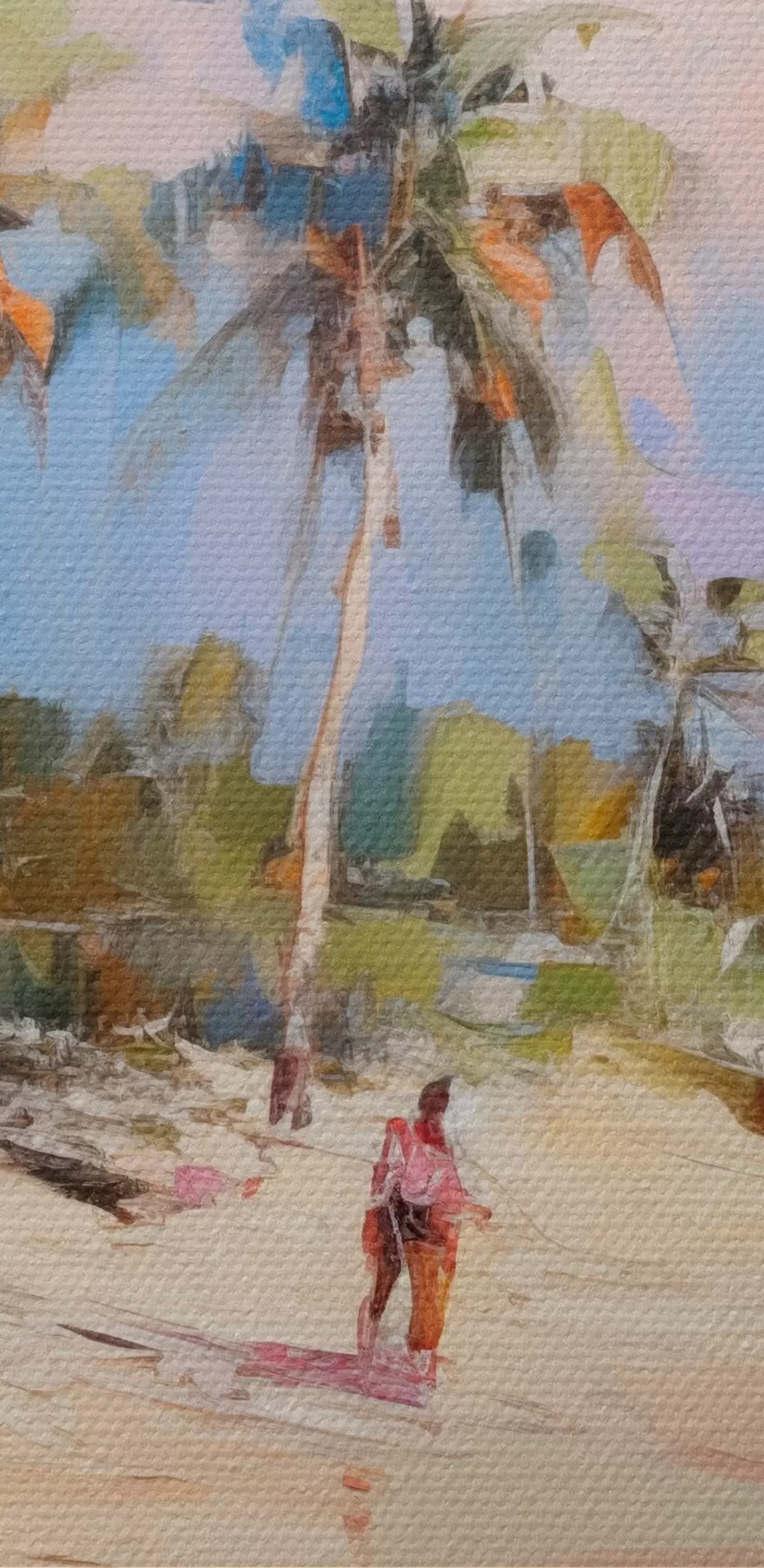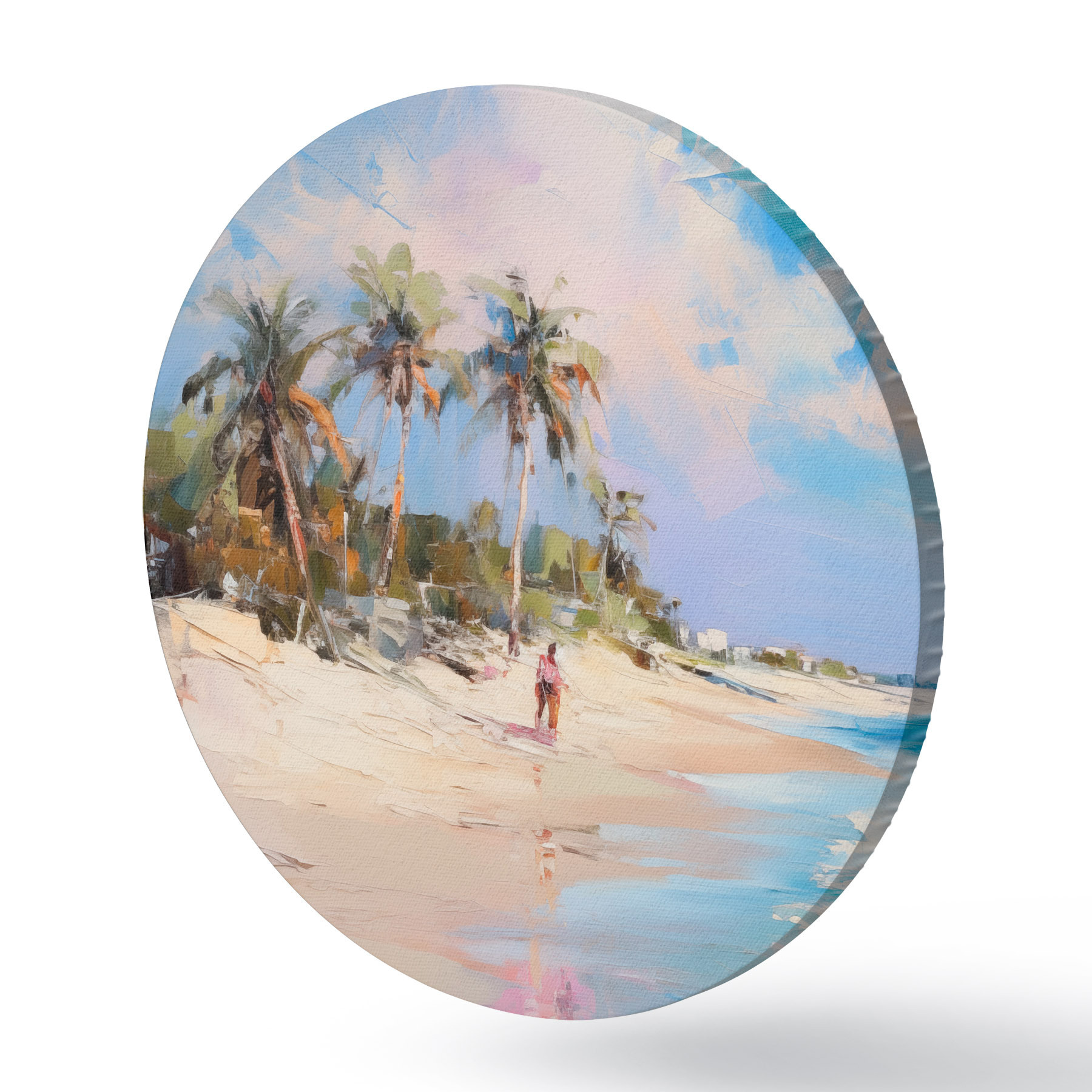 Runde Gemälde Abstrakte Landschaft, ein Strand mit Palmen, strahlender Sonnenschein mit blauem Himmel und einigen Wolken r46284