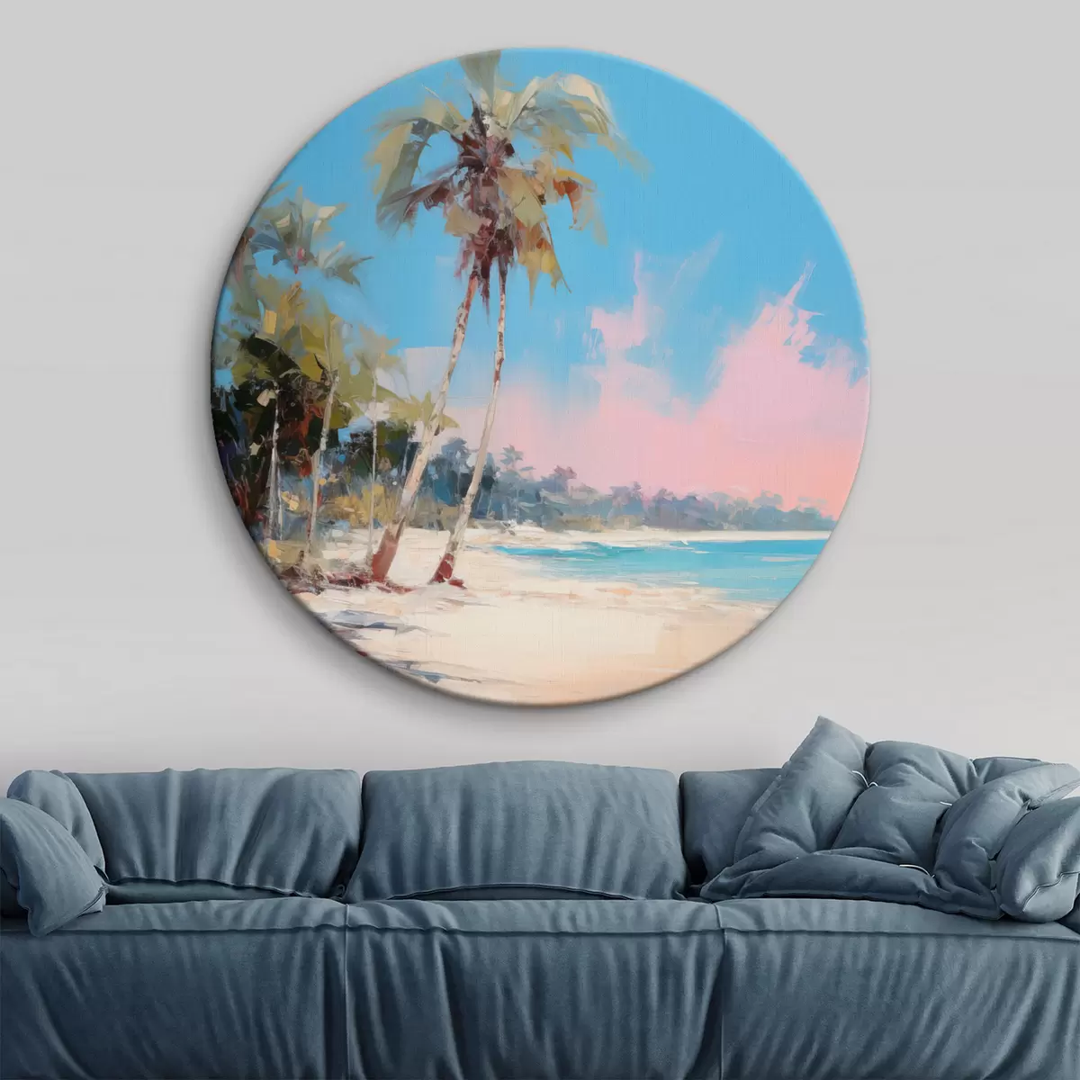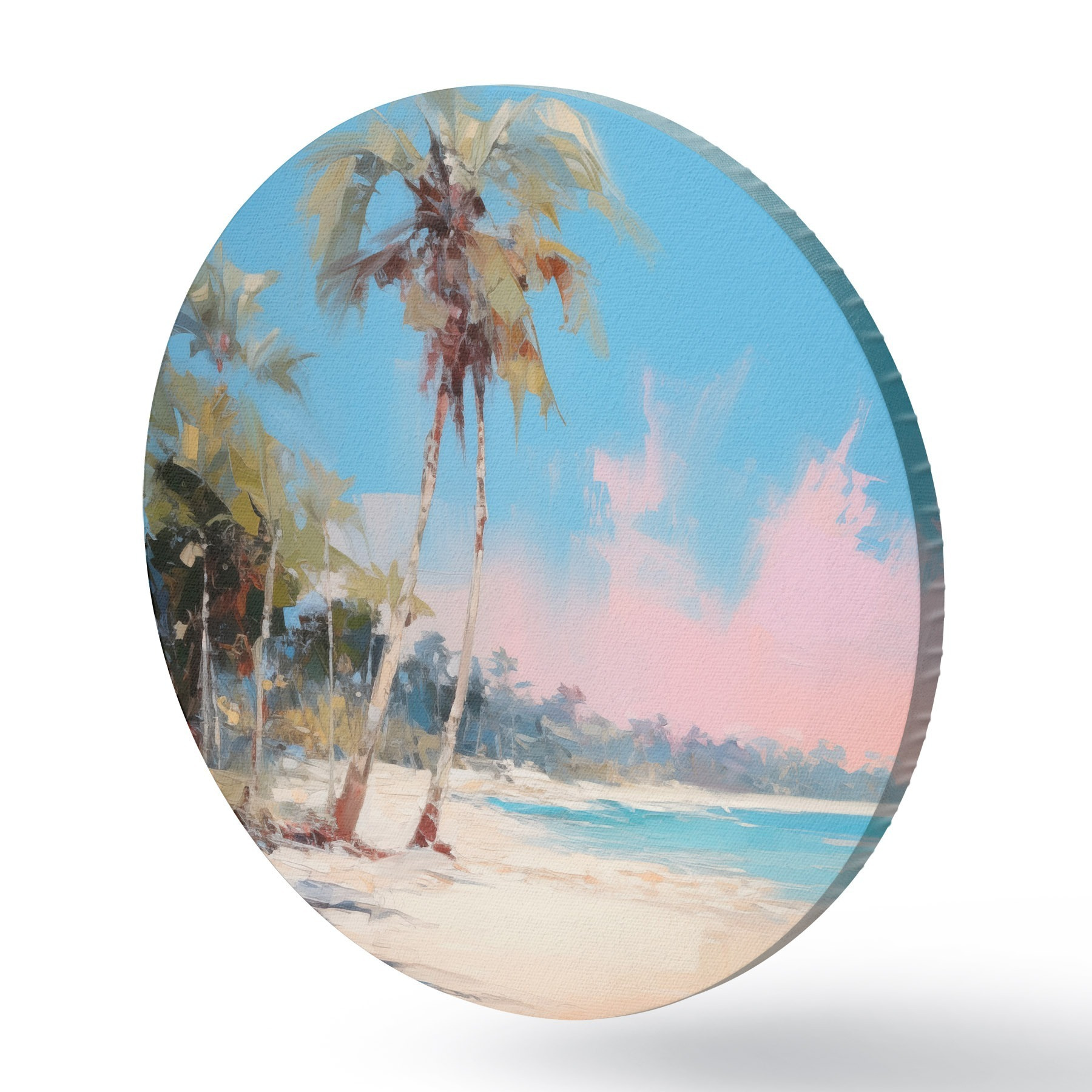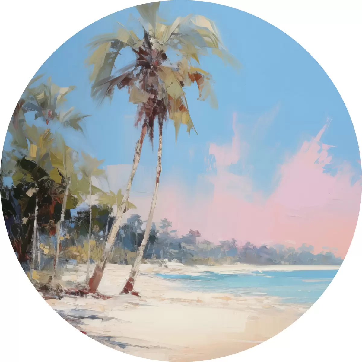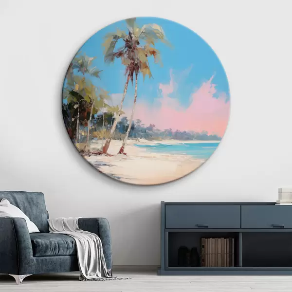 Runde Gemälde Abstrakter tropischer Strand mit weißem Sand und Palmen, blauer Himmel mit weißen Wolken r46285