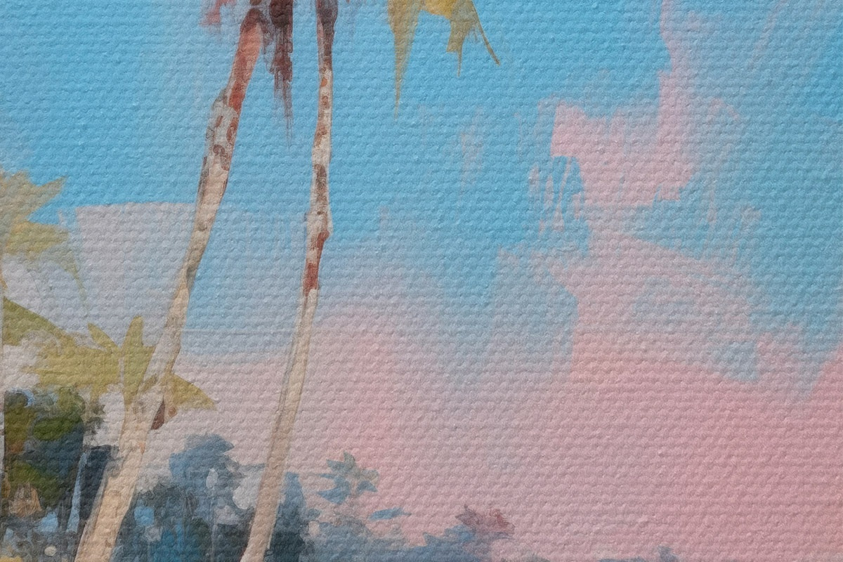 Bild Abstrakter tropischer Strand mit weißem Sand und Palmen, blauer Himmel mit weißen Wolken Nr r46285