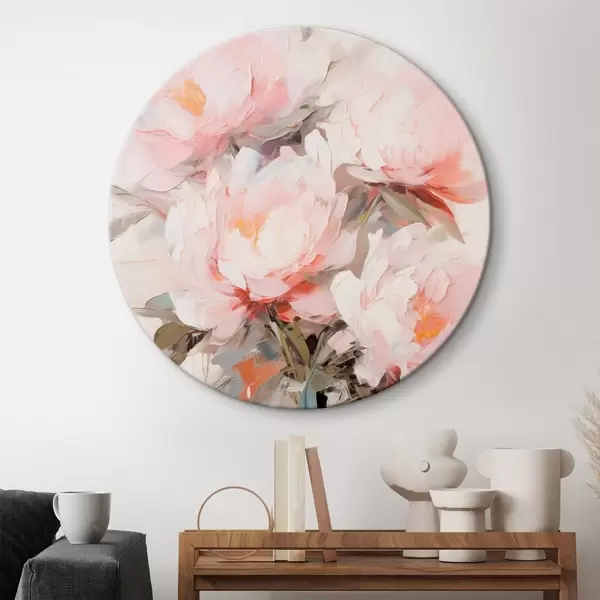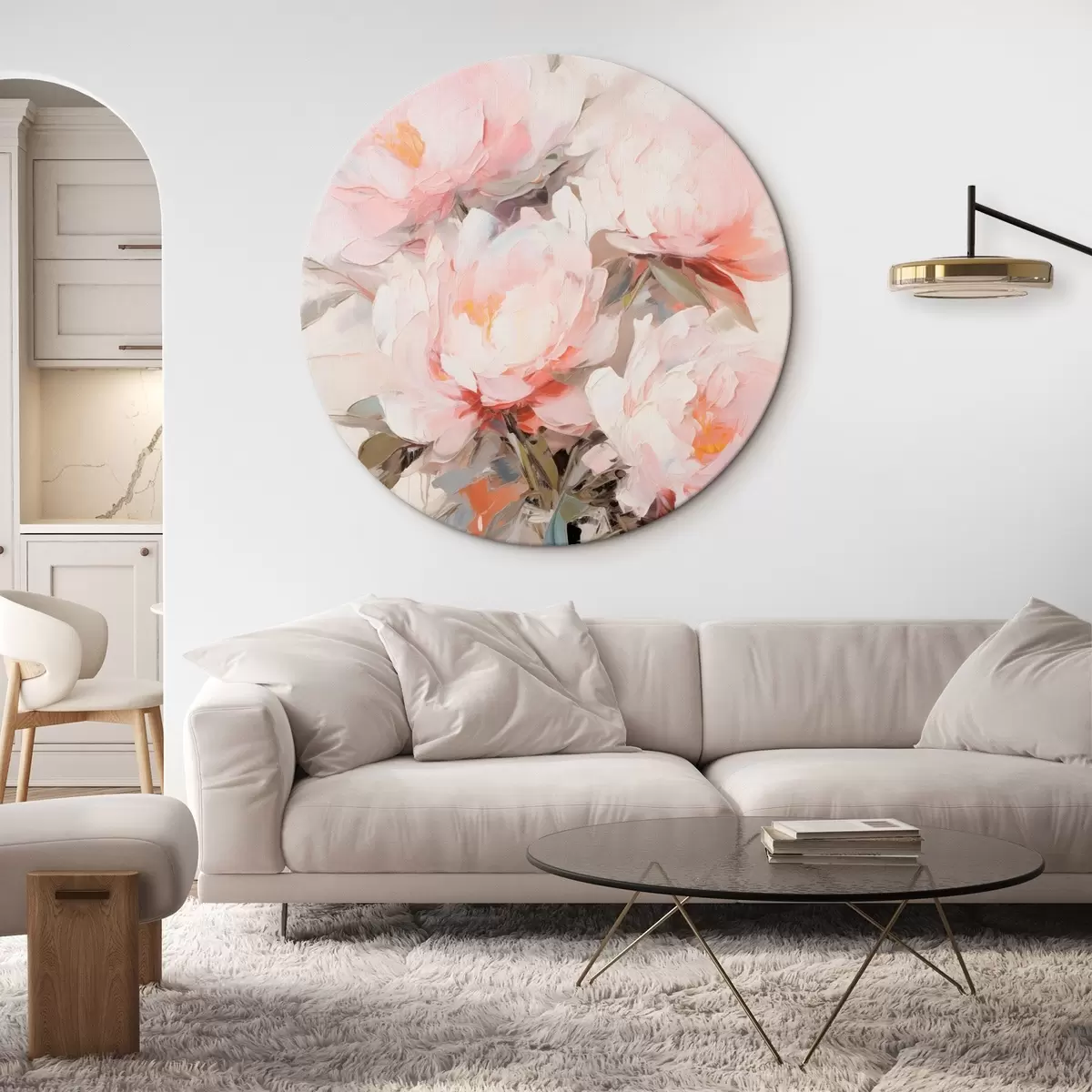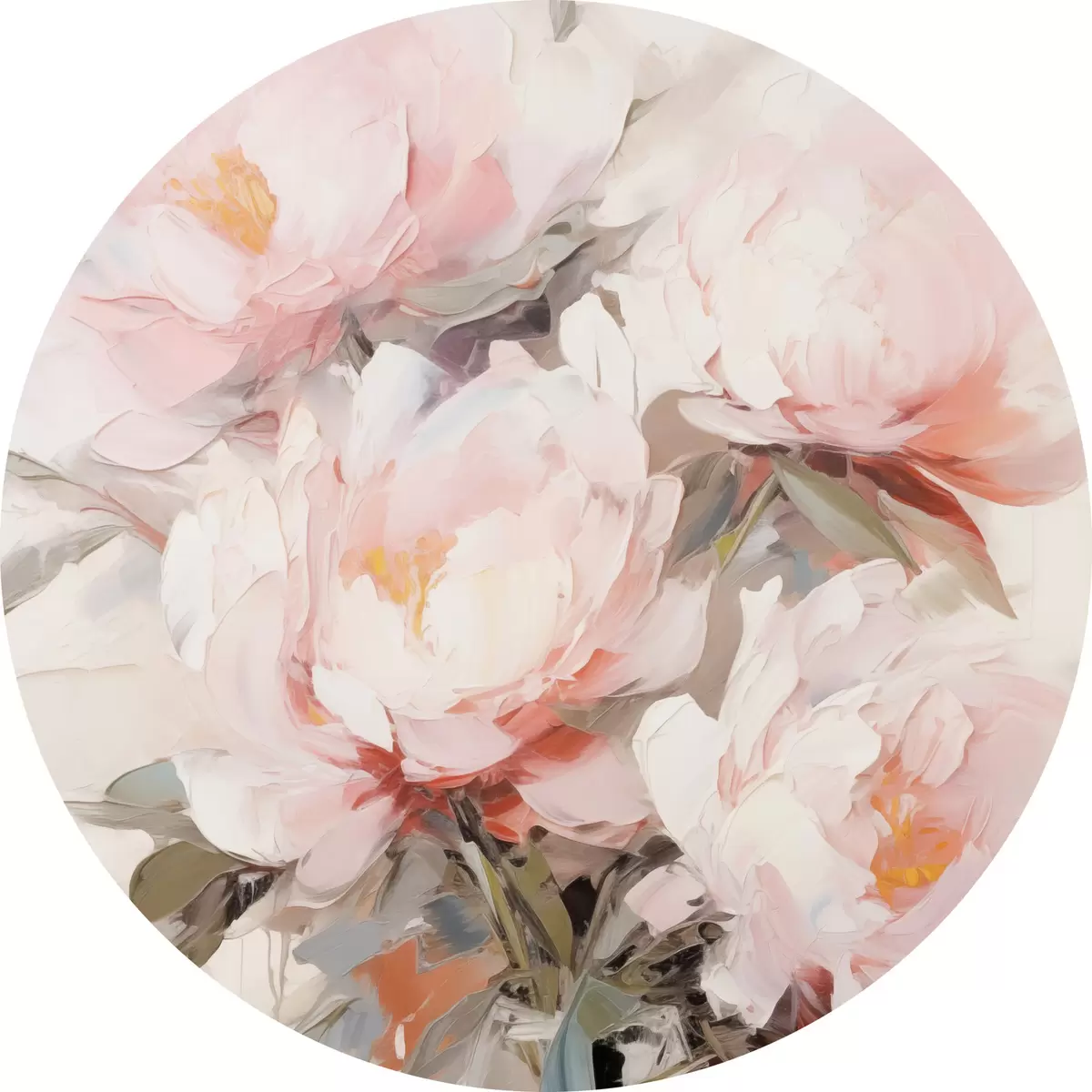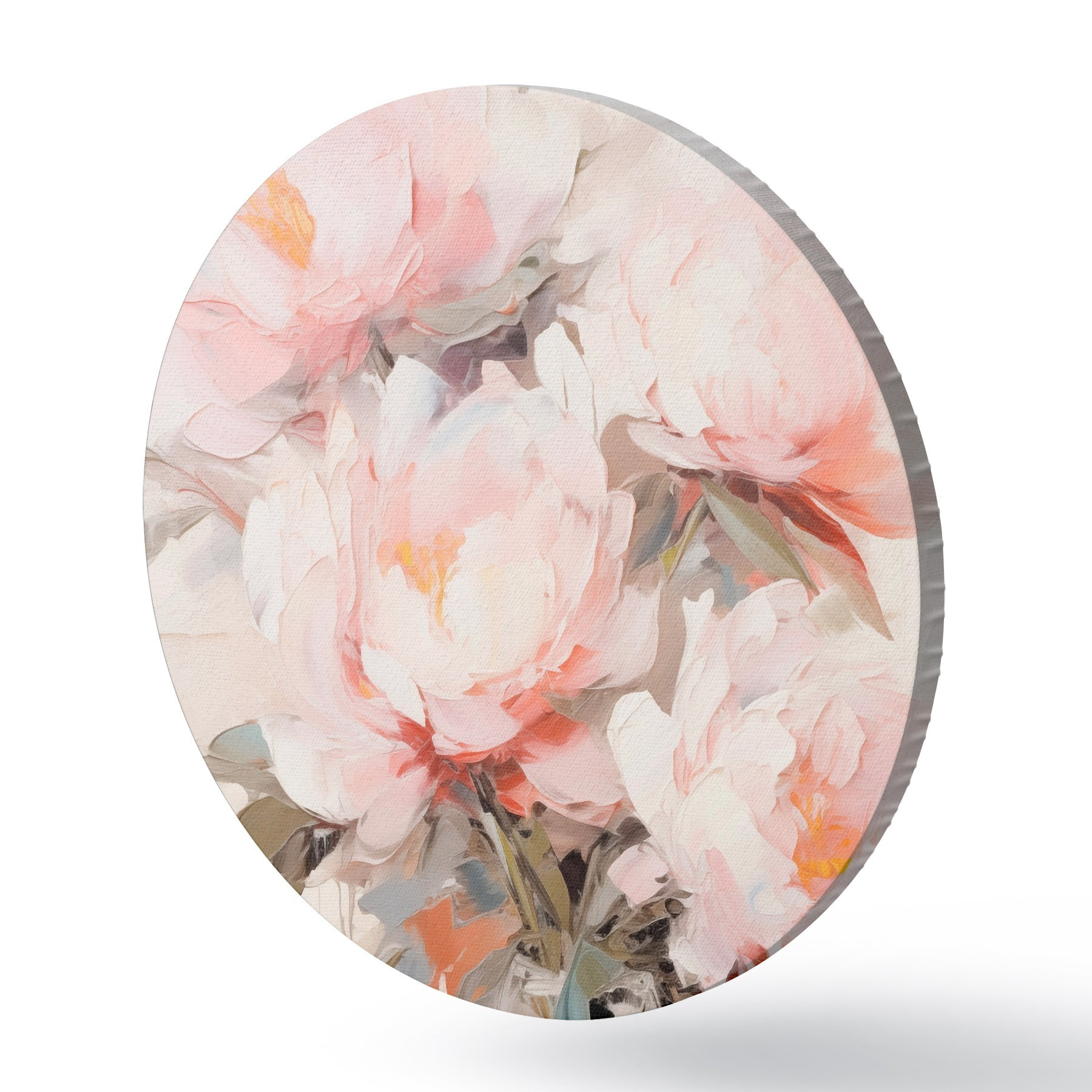 Runde Gemälde Ein Strauß aus rosa und weißen Pfingstrosen in einer Glasvase, sanfte Pinselstriche, Pastellfarben, neutraler Hintergrund r46295