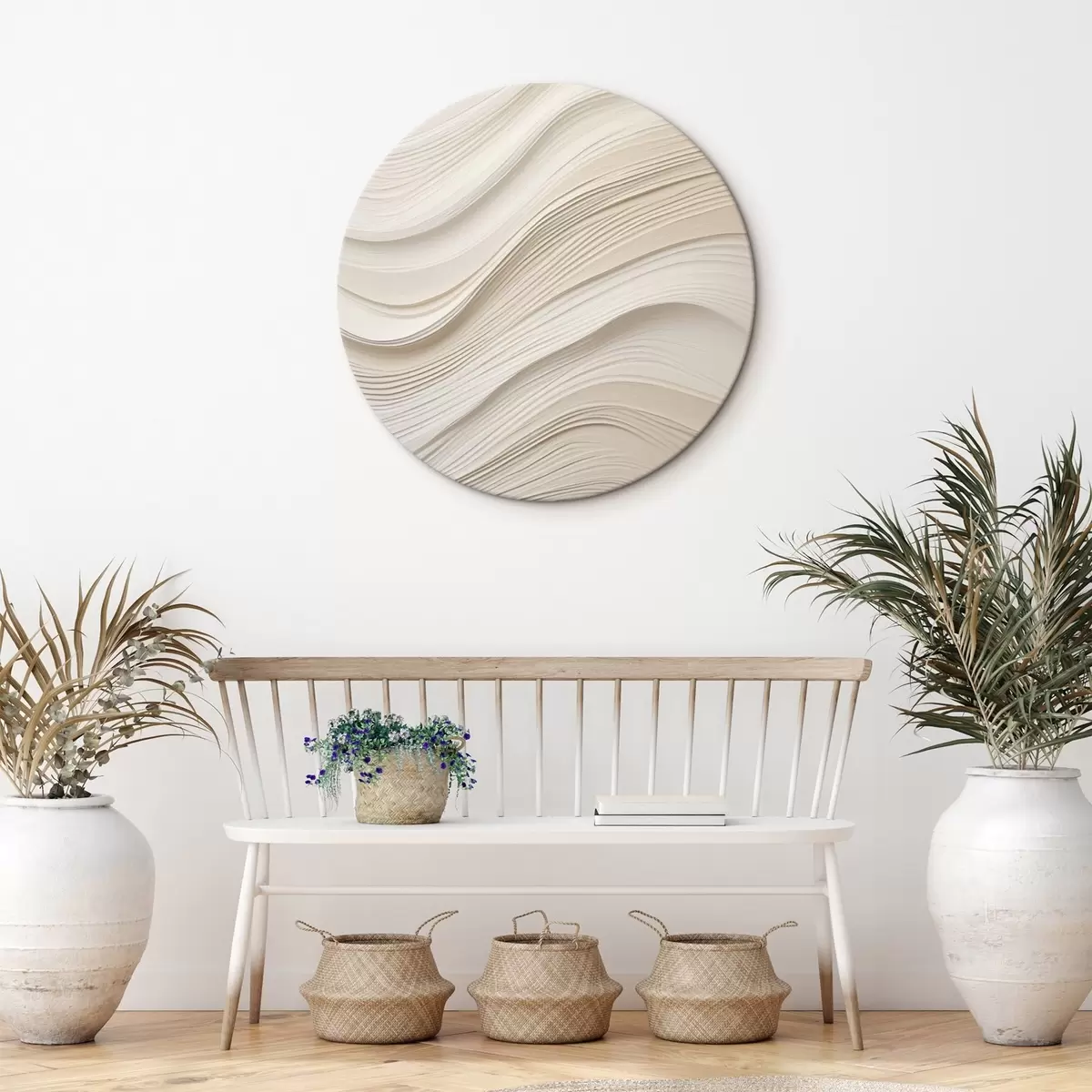 Runde Gemälde Geschichtete Reliefwellen in Sandfarben, weiche Textur r46484
