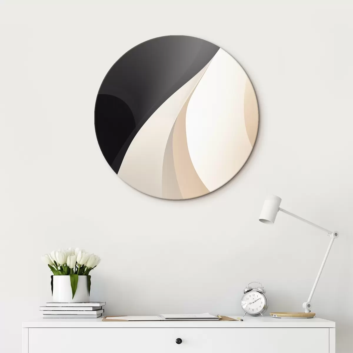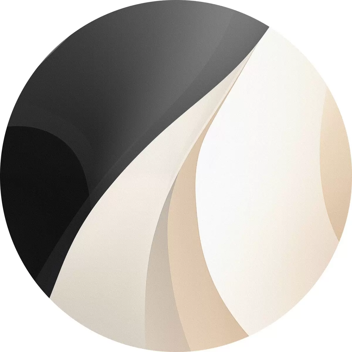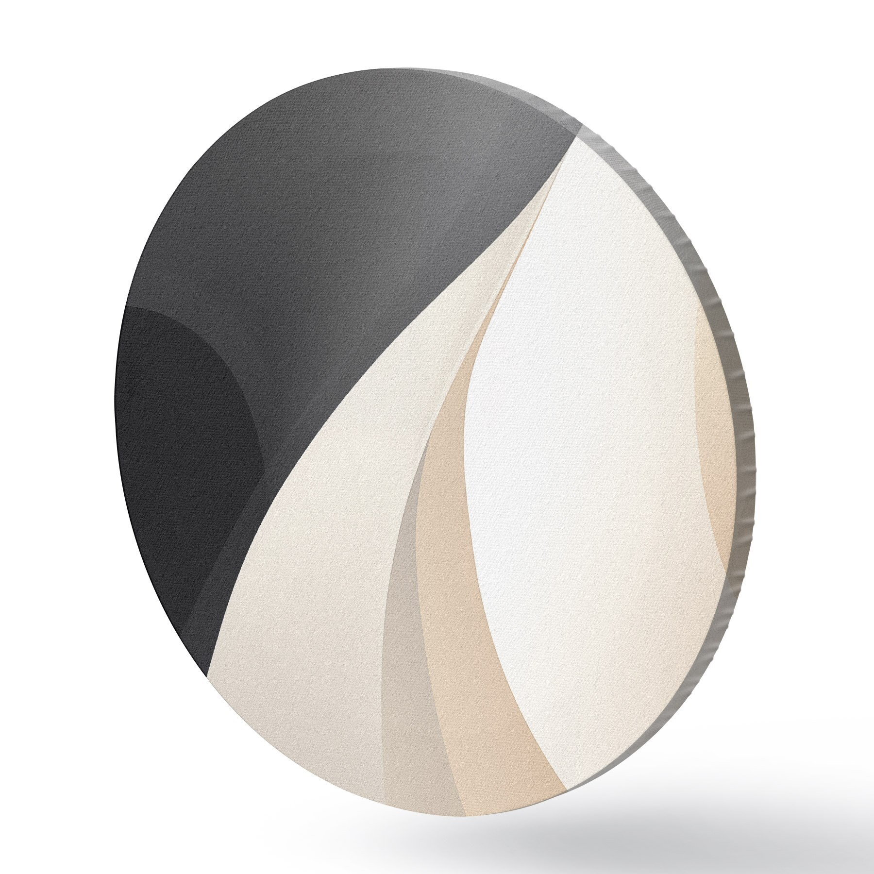 Runde Gemälde Elegante, sich überlappende Kurven in Anthrazit, Elfenbein und Sand r46493