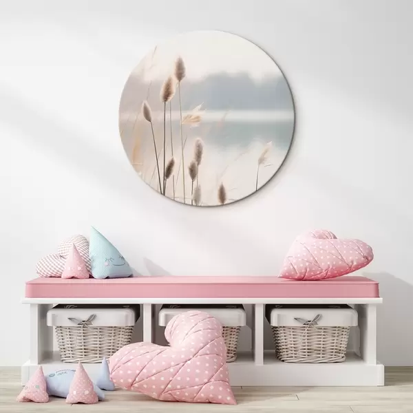 Runde Gemälde Weiche Schilfrohre an einem nebligen Seeufer, pastellbeige Farbtöne r46504