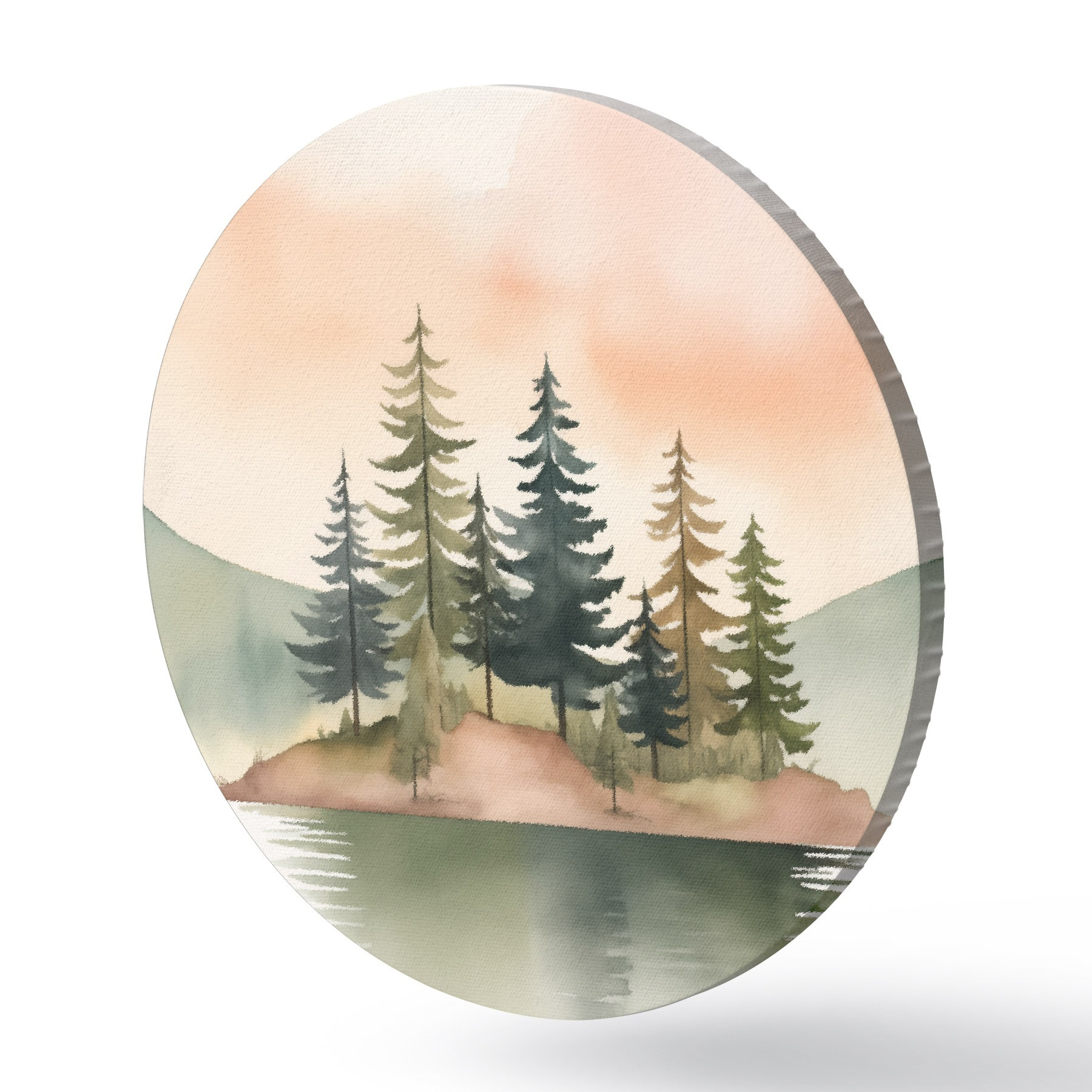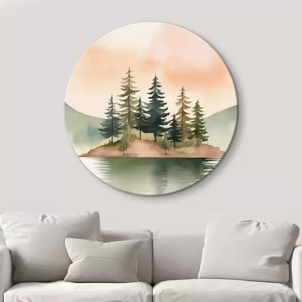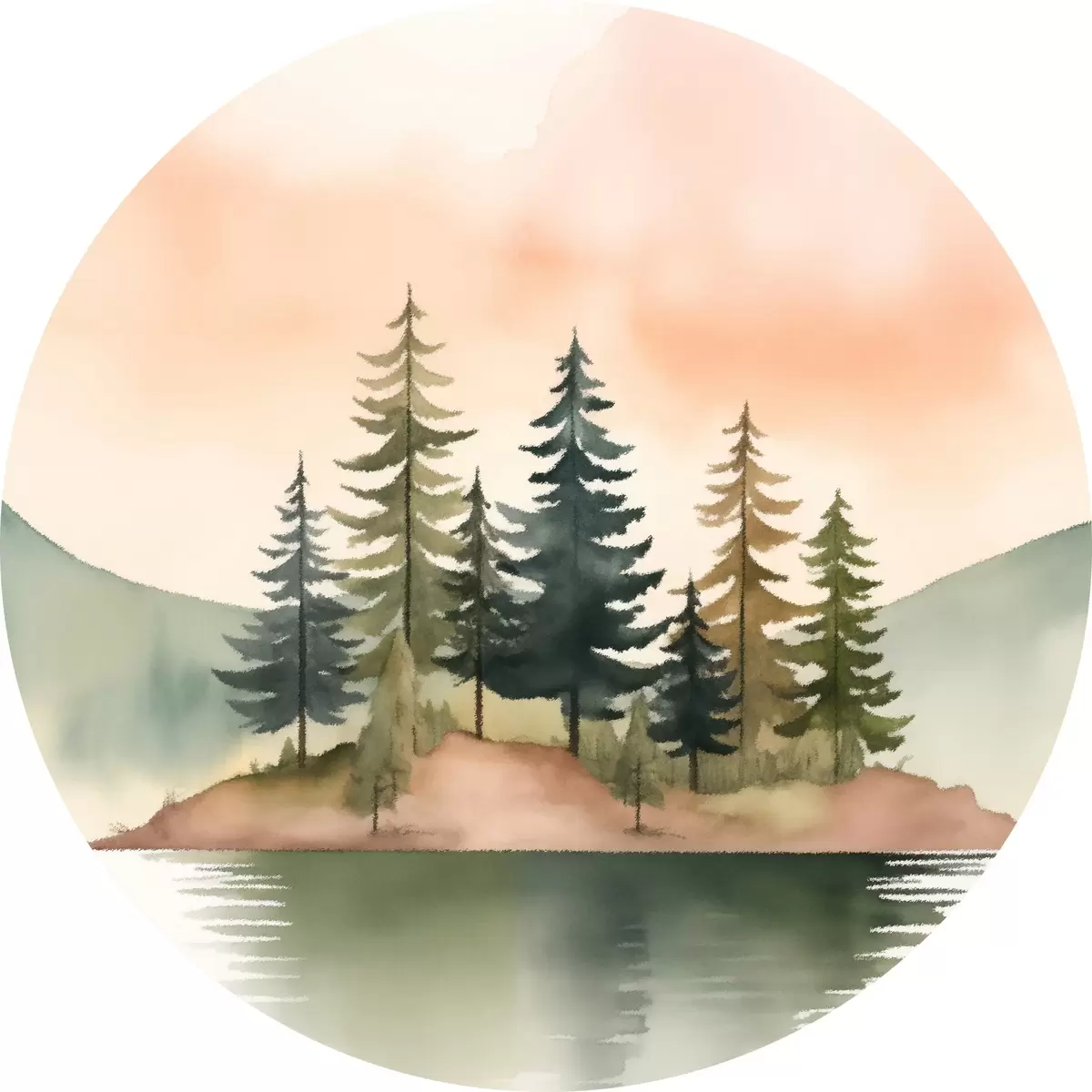 Runde Gemälde Aquarellkiefern auf einer nebligen Insel, sanfter pfirsichfarbener Himmel r46505