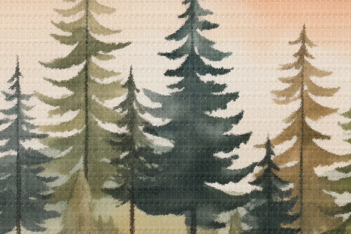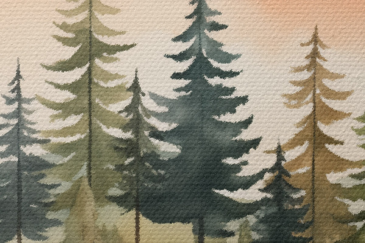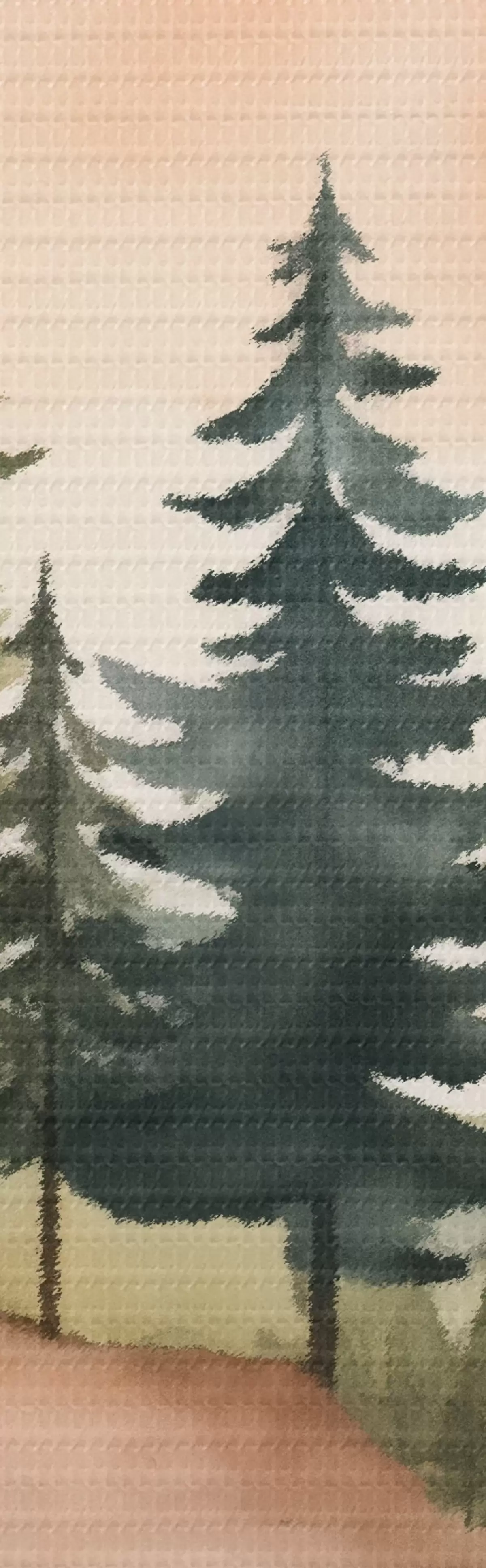 Bild Aquarellkiefern auf einer nebligen Insel, sanfter pfirsichfarbener Himmel Nr r46505