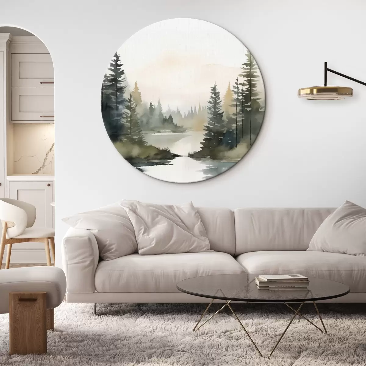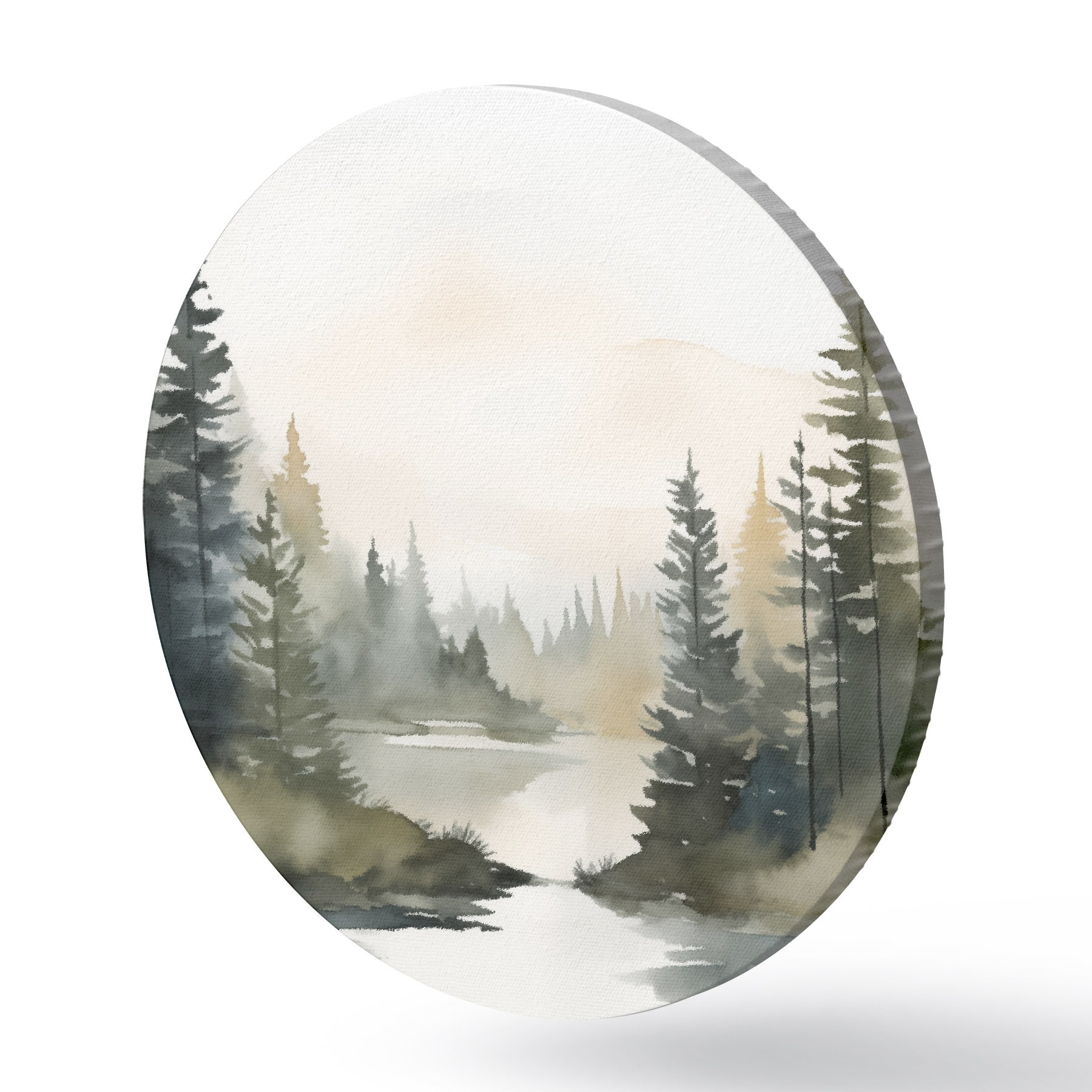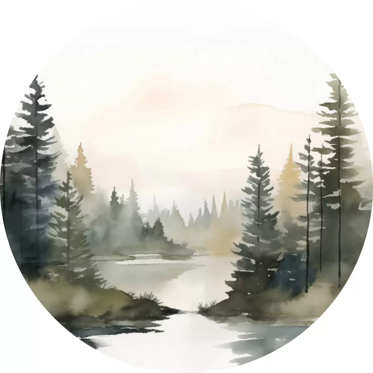 Runde Gemälde Nebelverhangener Nadelwald über einem ruhigen Fluss, Aquarellstil r46507