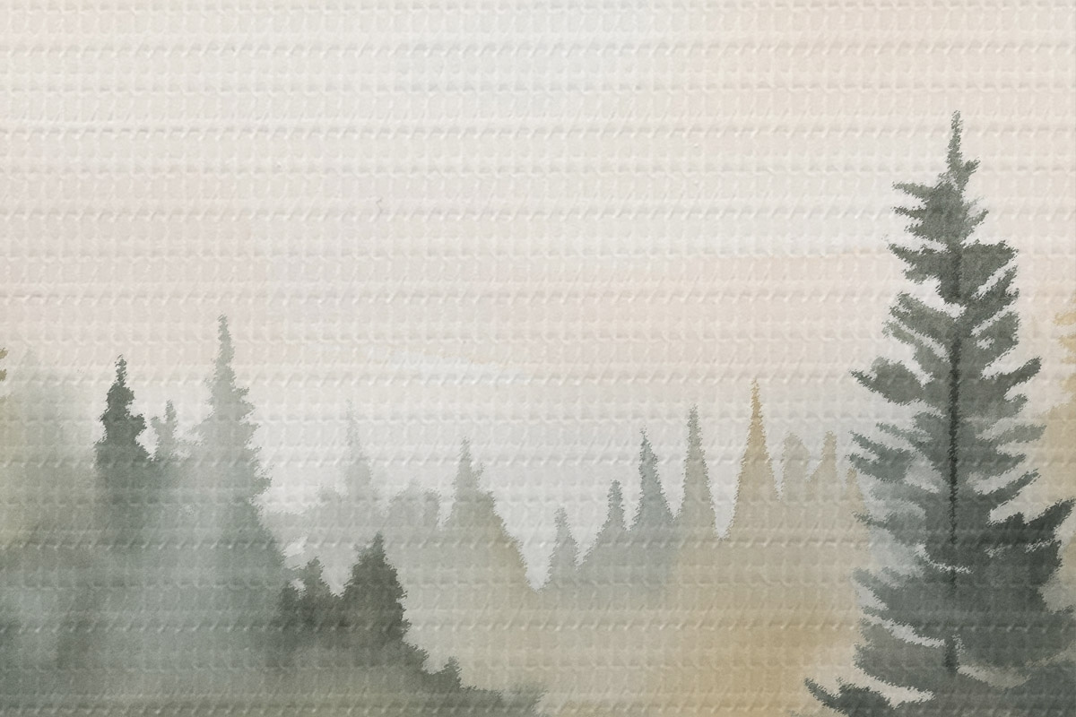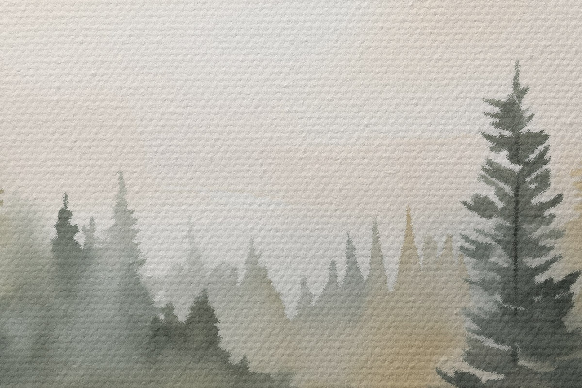 Bild Nebelverhangener Nadelwald über einem ruhigen Fluss, Aquarellstil Nr r46507