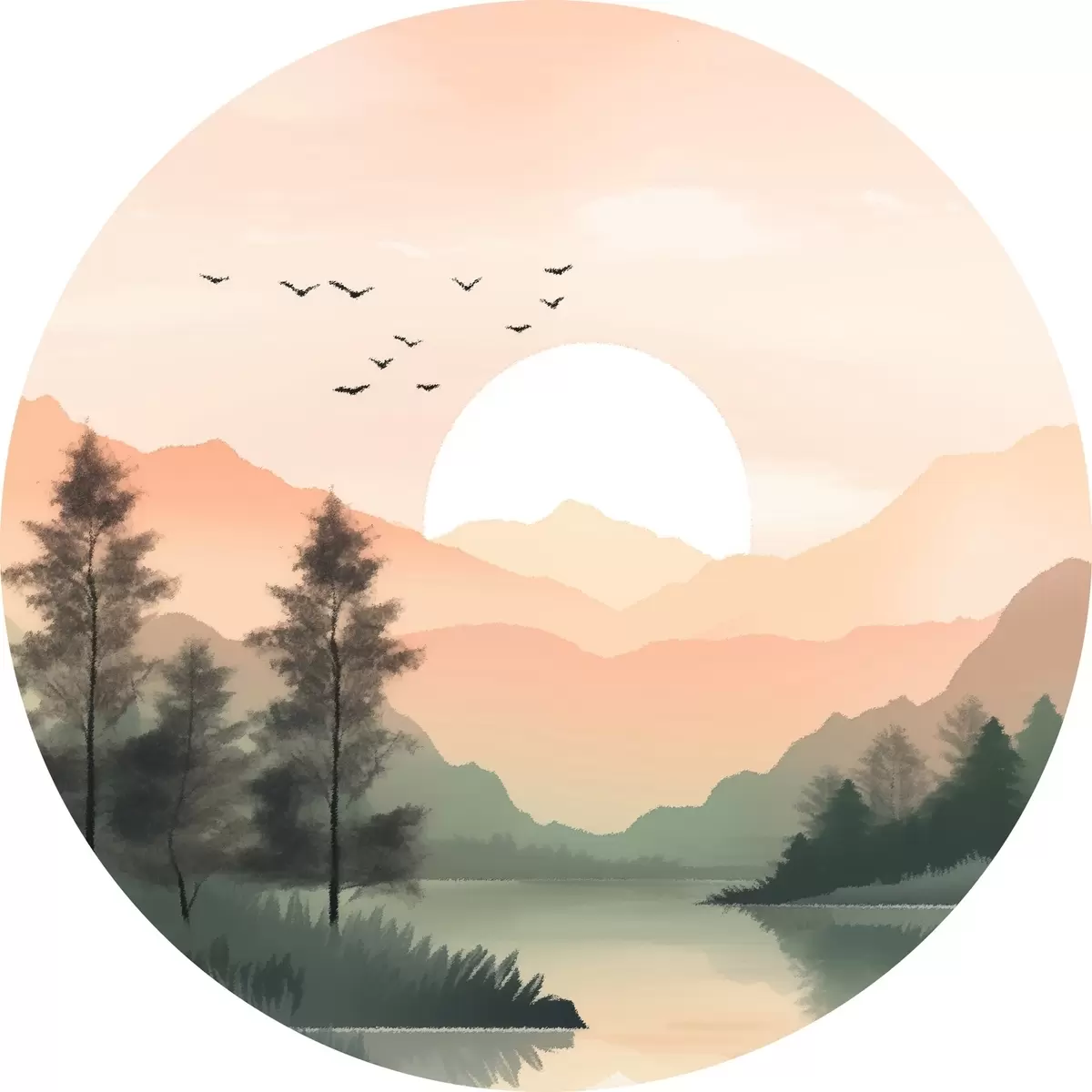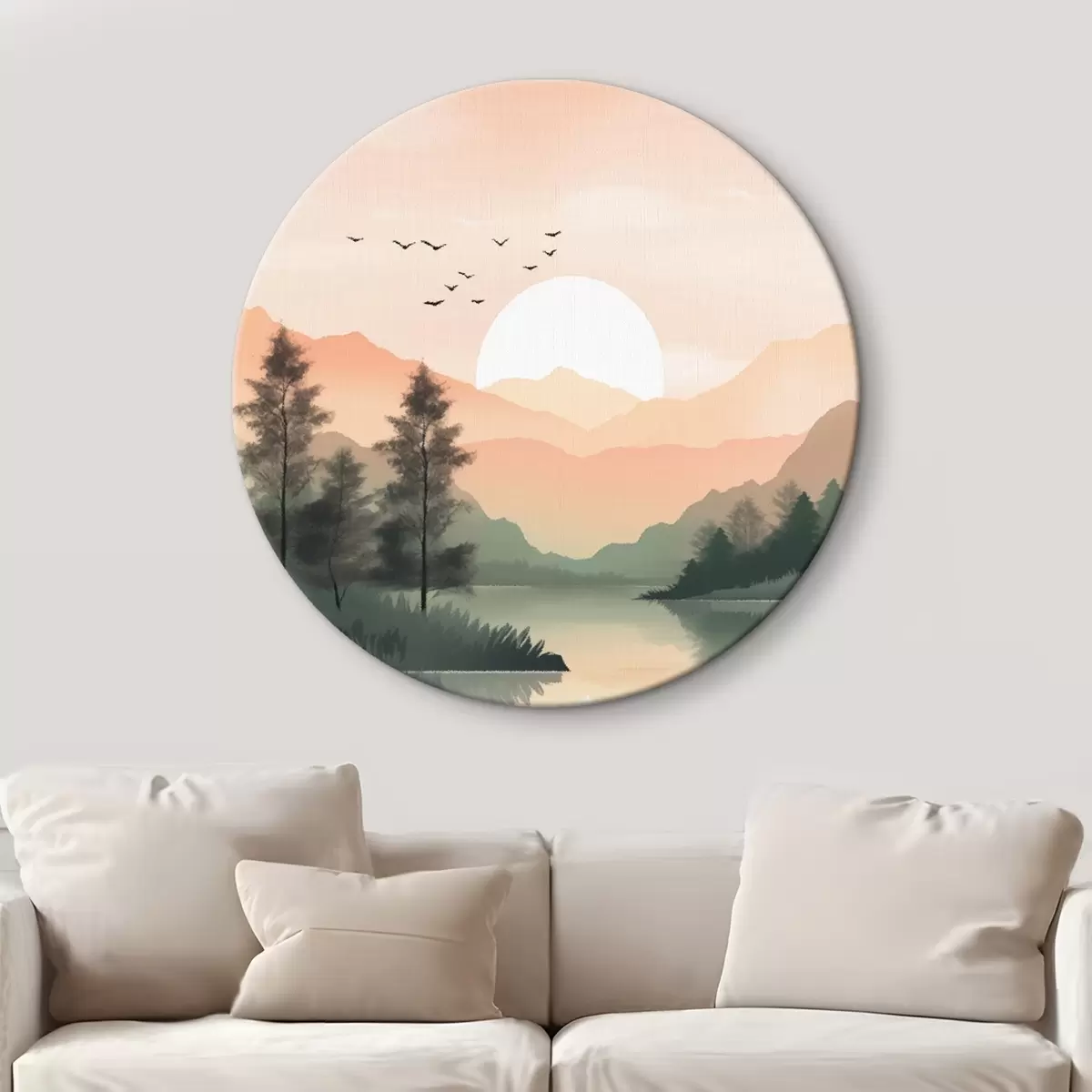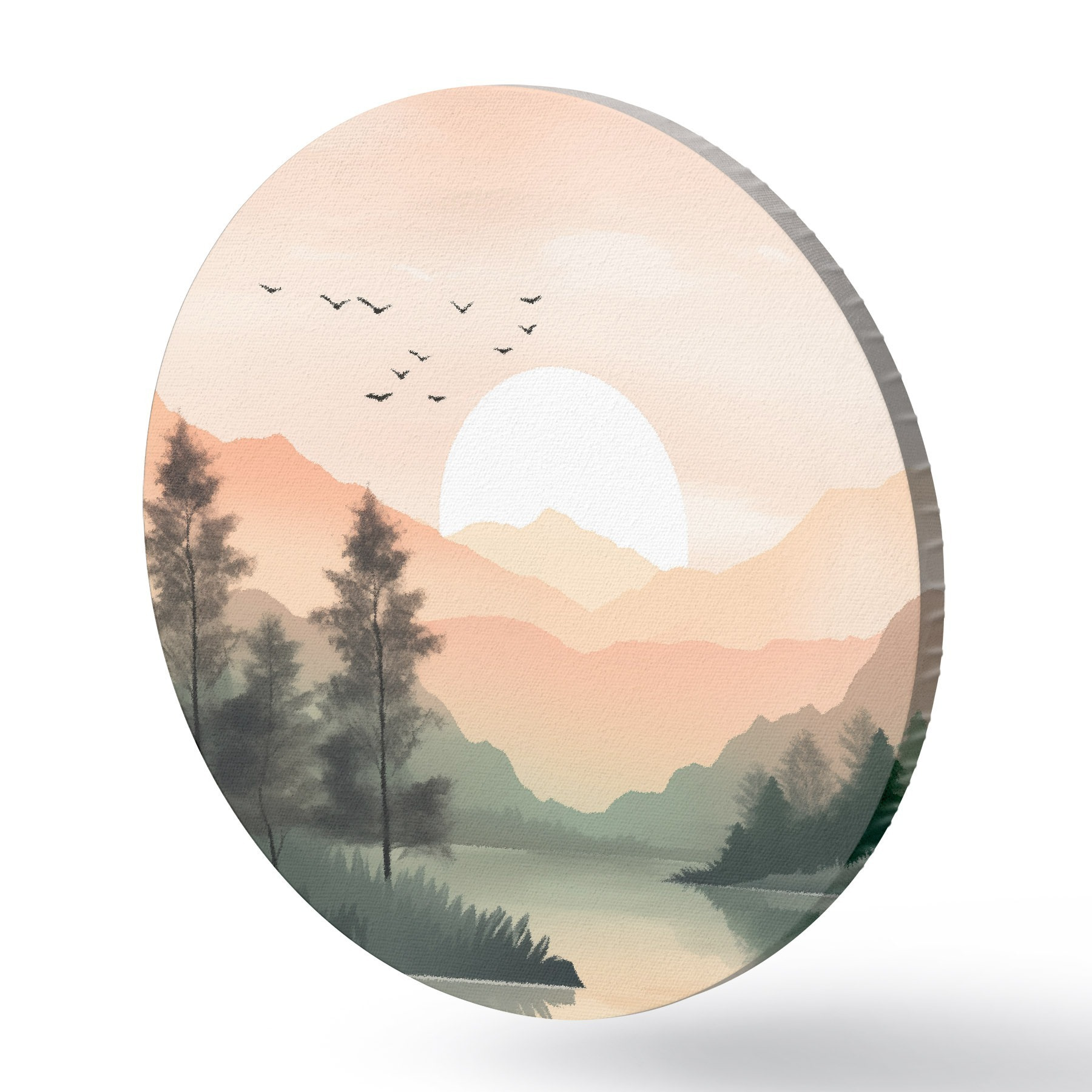 Runde Gemälde Pastellfarbener Sonnenuntergang über einem ruhigen See mit fernen Hügeln und Vögeln r46508