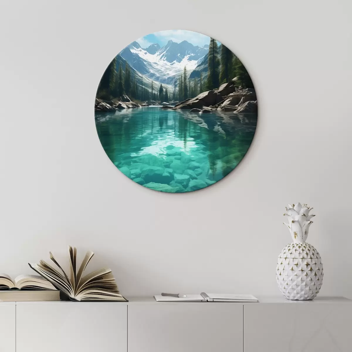 Runde Gemälde Klarer Gebirgsfluss mit felsigem Bett und schneebedeckten Gipfeln r46514