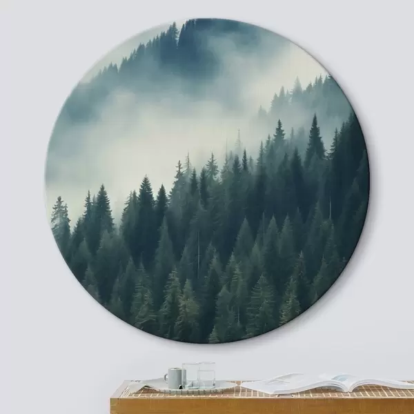 Runde Gemälde Nebel über Nadelbaumhängen, tiefe Grüntöne r46516