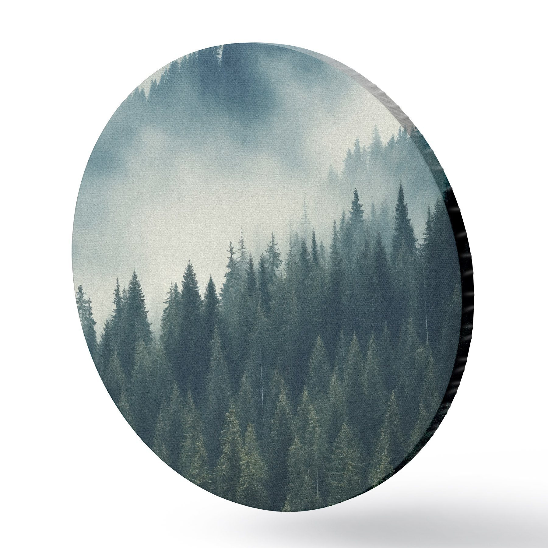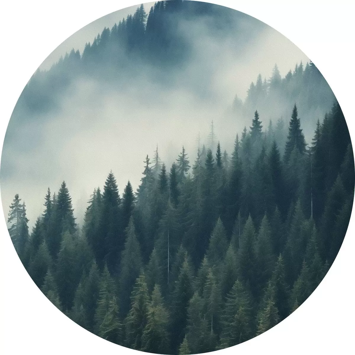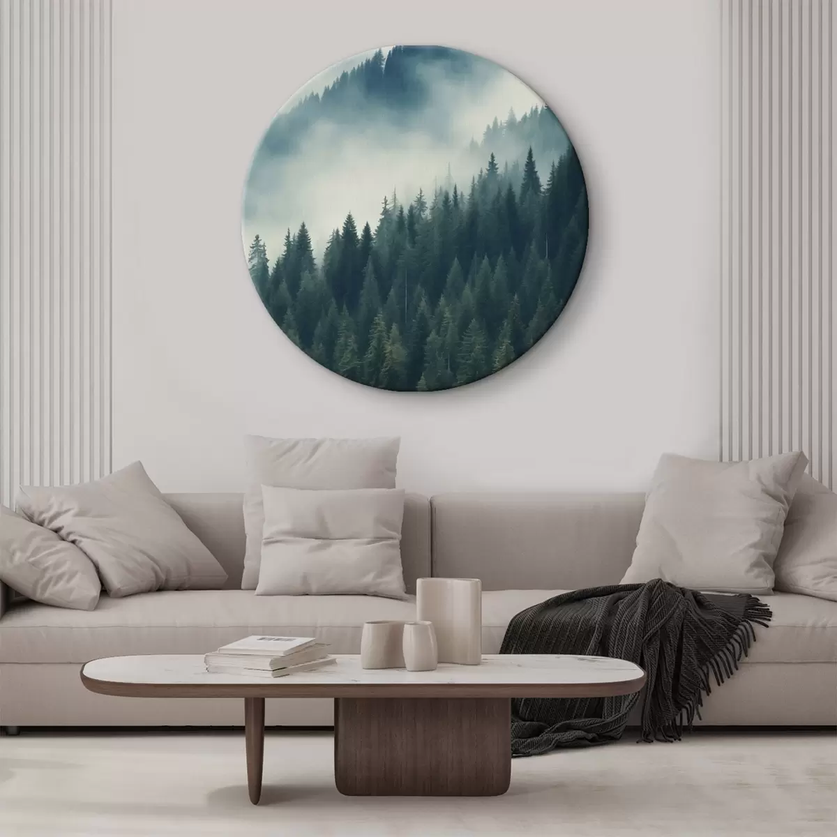 Runde Gemälde Nebel über Nadelbaumhängen, tiefe Grüntöne r46516