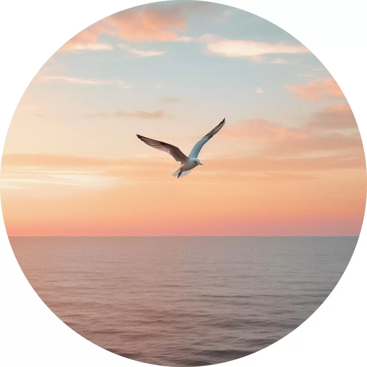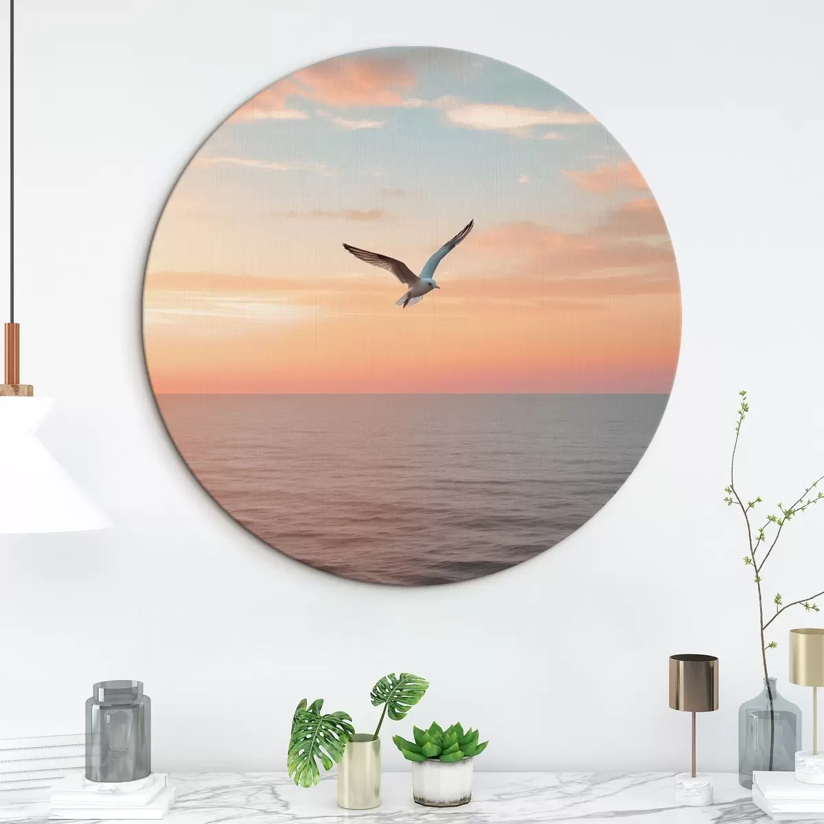 Runde Gemälde Möwe über dem Meer bei einem rosa-pfirsichfarbenen Sonnenuntergang r46520