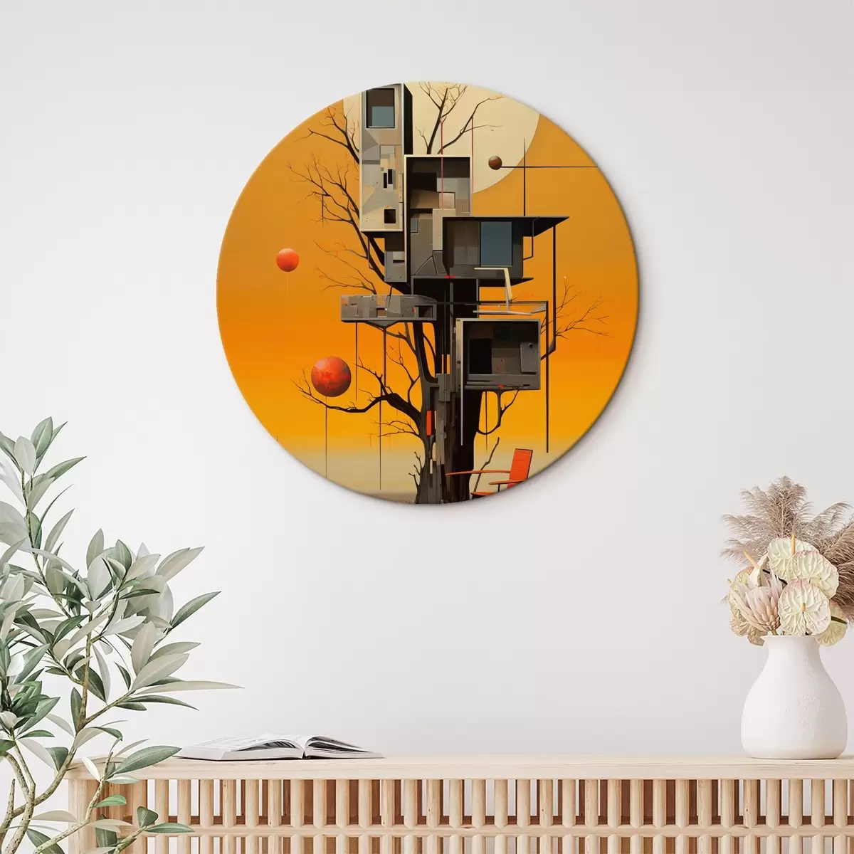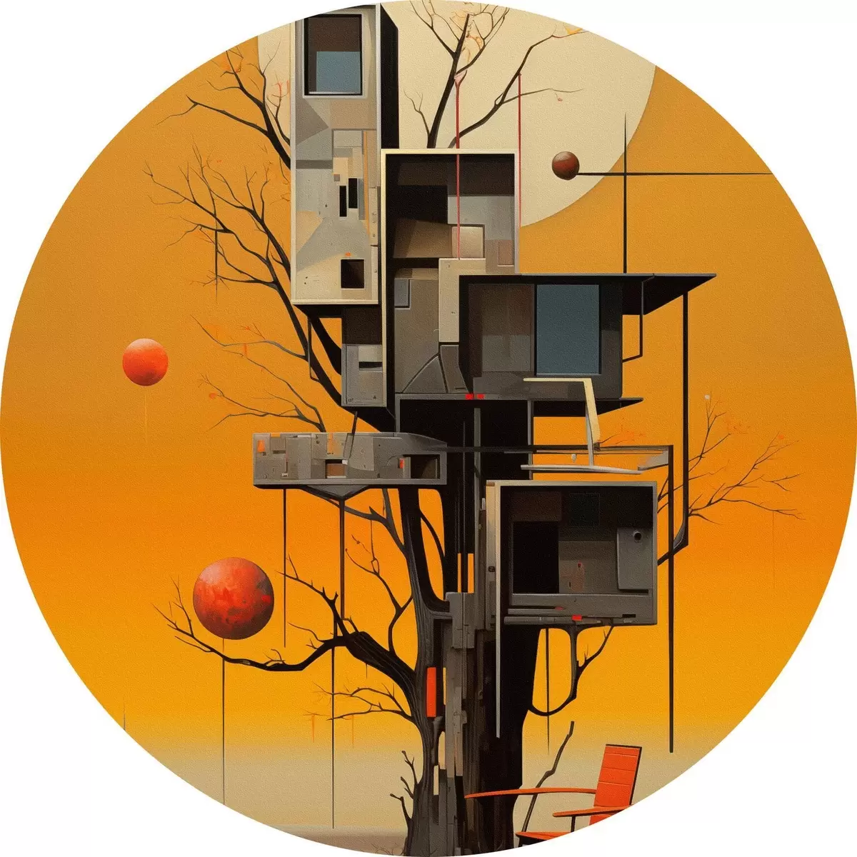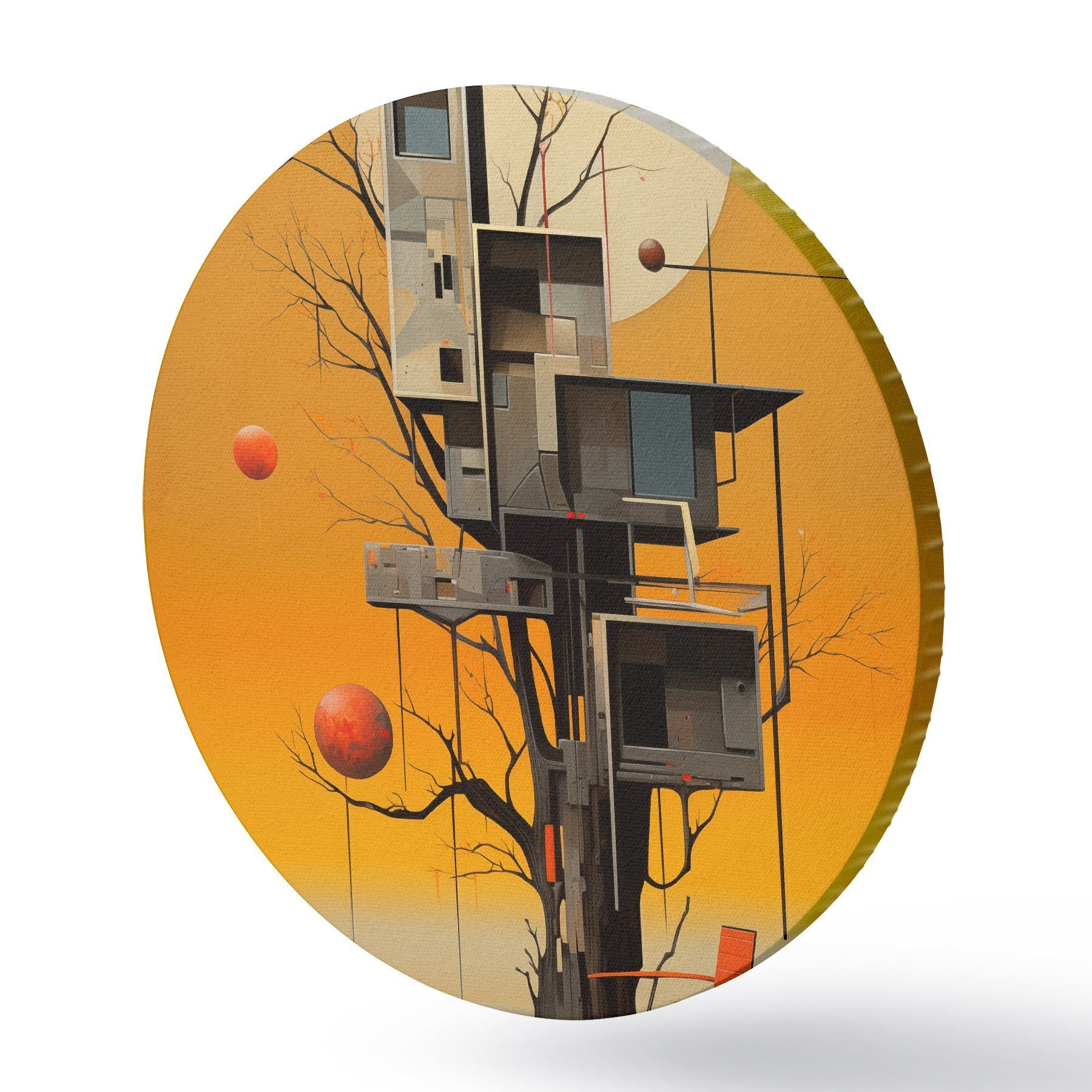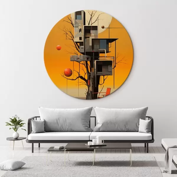 Runde Gemälde Surreales Baumhaus vor orangefarbenem Hintergrund r46526