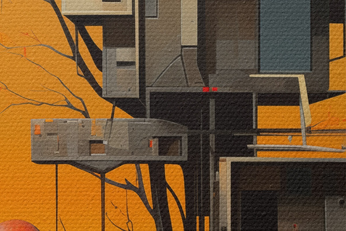 Bild Surreales Baumhaus vor orangefarbenem Hintergrund Nr r46526
