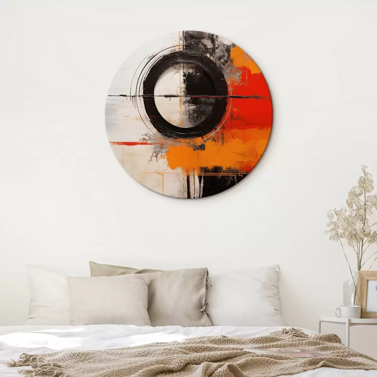 Runde Gemälde Schwarzer Kreis auf weißem Hintergrund, orangefarbene Striche und Spritzer r46549