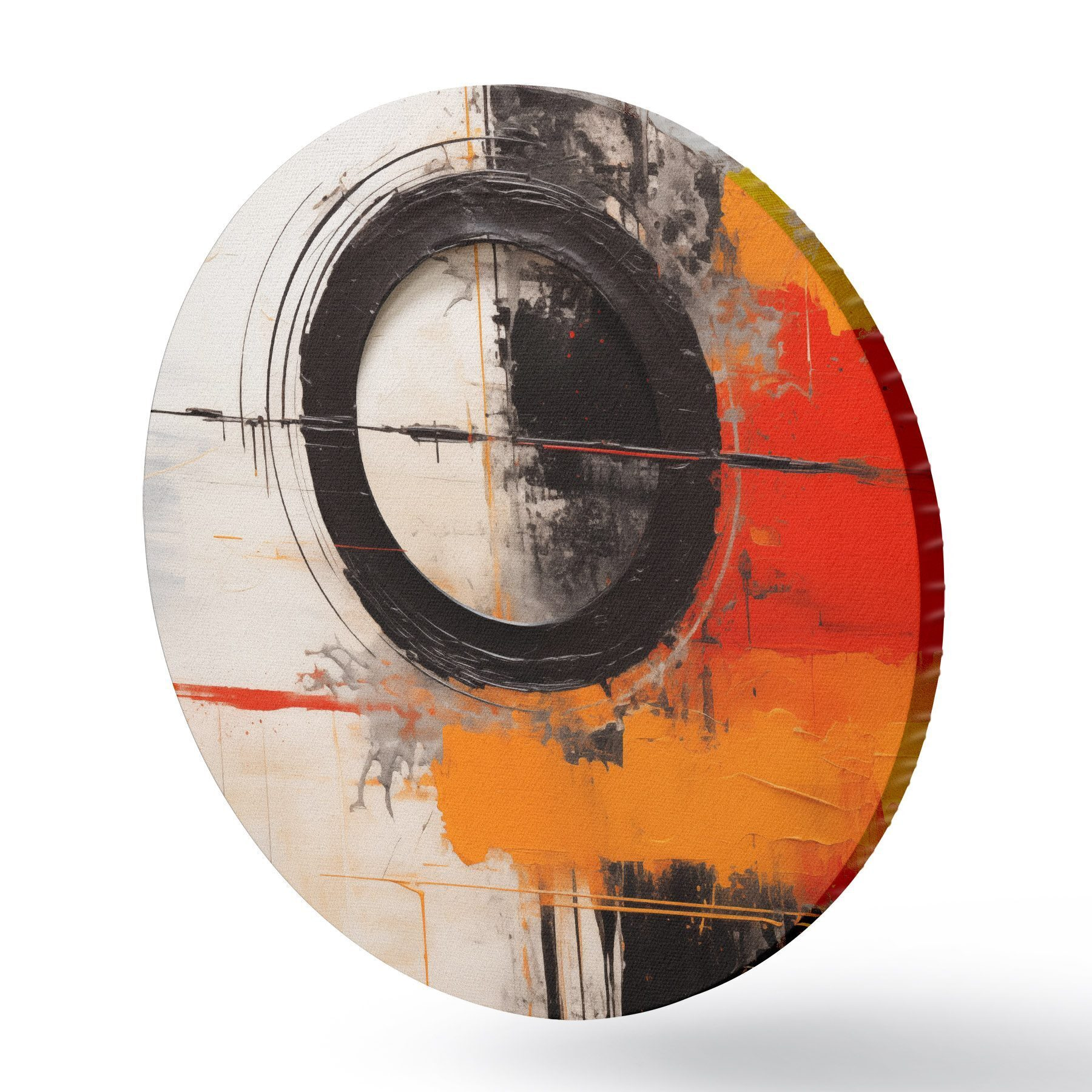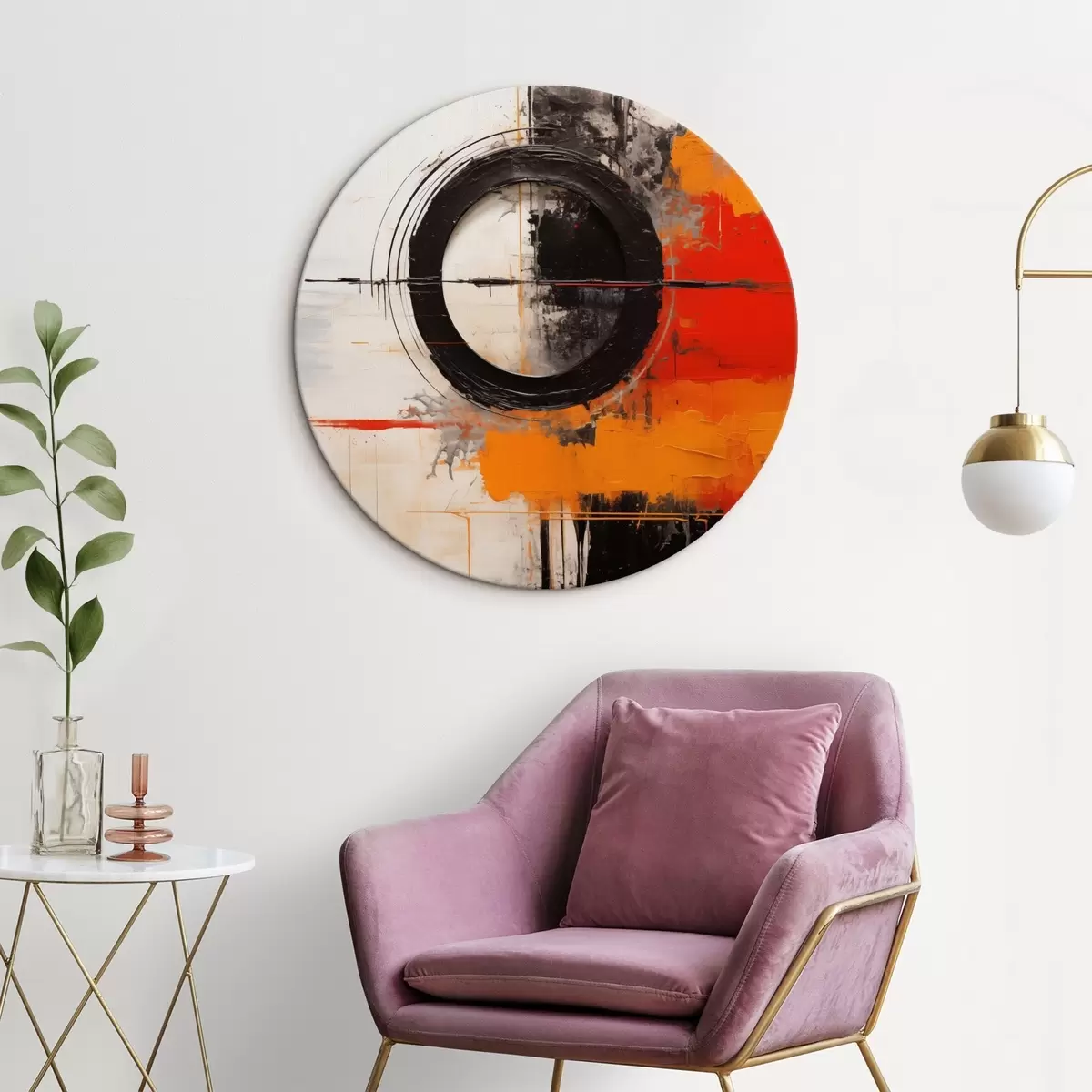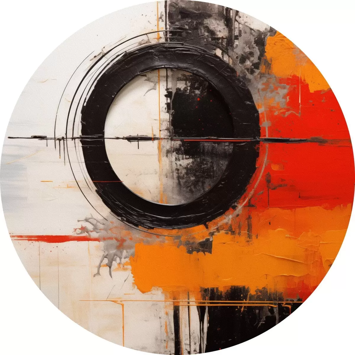 Runde Gemälde Schwarzer Kreis auf weißem Hintergrund, orangefarbene Striche und Spritzer r46549
