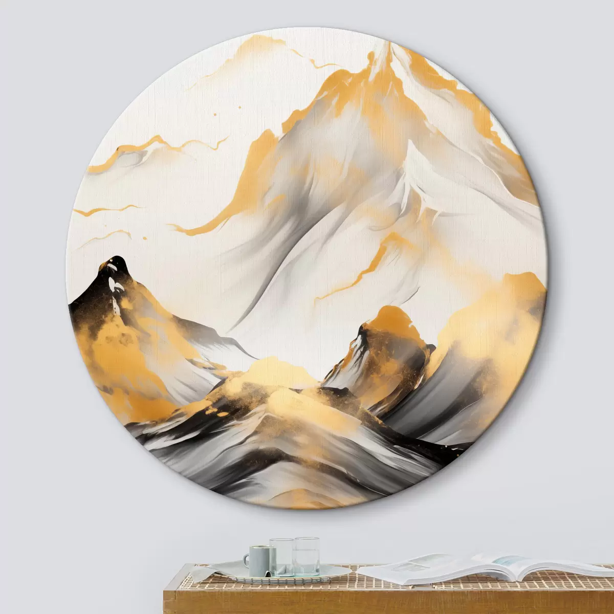 Runde Gemälde Strukturierte gelbe und schwarze Berge mit schneebedeckten Gipfeln, Tuschemalerei-Stil, minimalistische Bergkette r46683