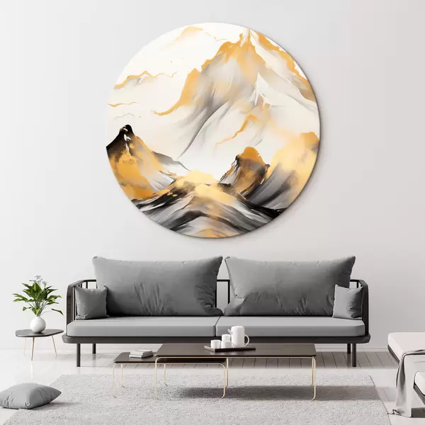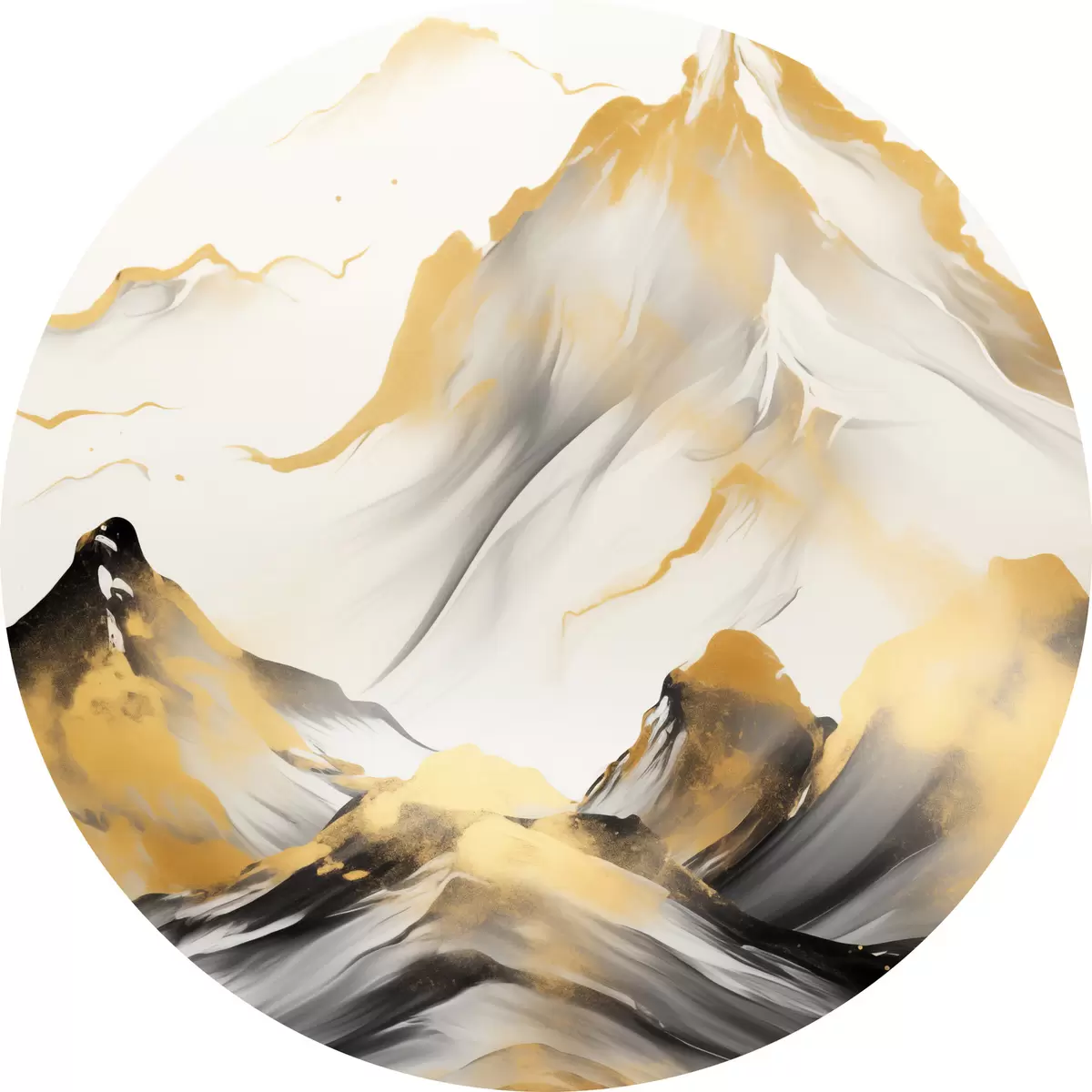 Runde Gemälde Strukturierte gelbe und schwarze Berge mit schneebedeckten Gipfeln, Tuschemalerei-Stil, minimalistische Bergkette r46683