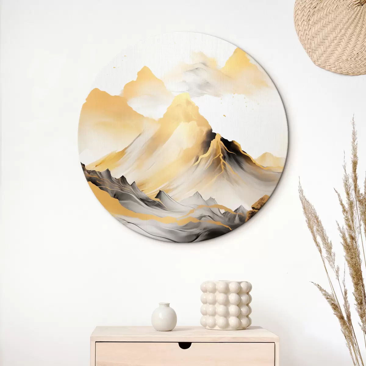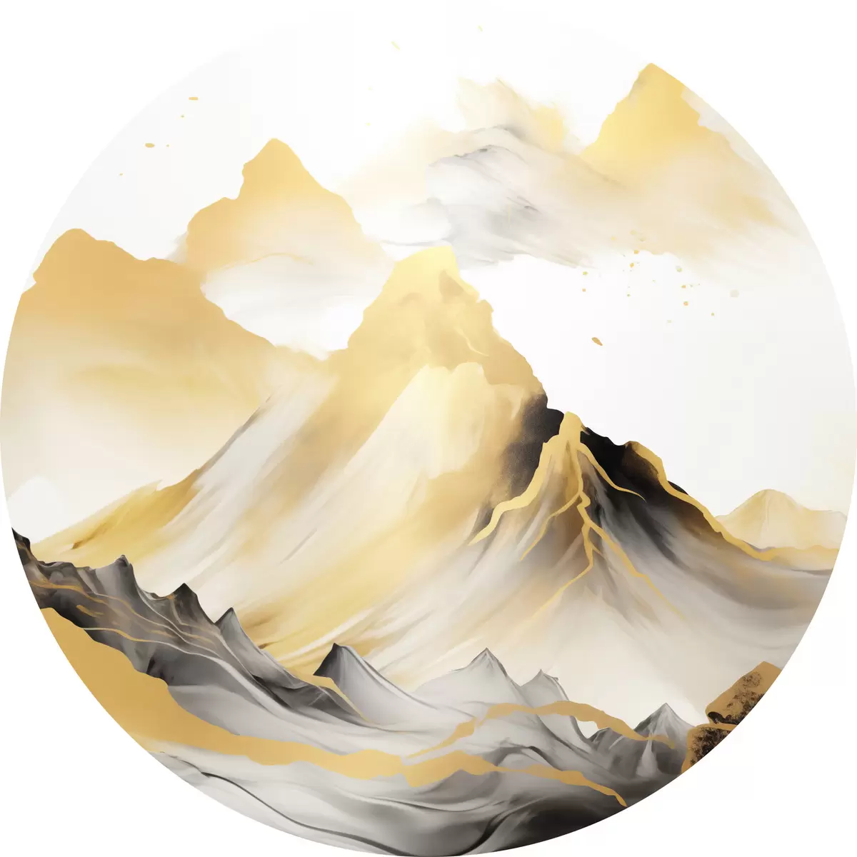 Runde Gemälde Strukturierte gelbe und schwarze Berge mit schneebedeckten Gipfeln, Tuschemalerei-Stil, minimalistische Bergkette r46684