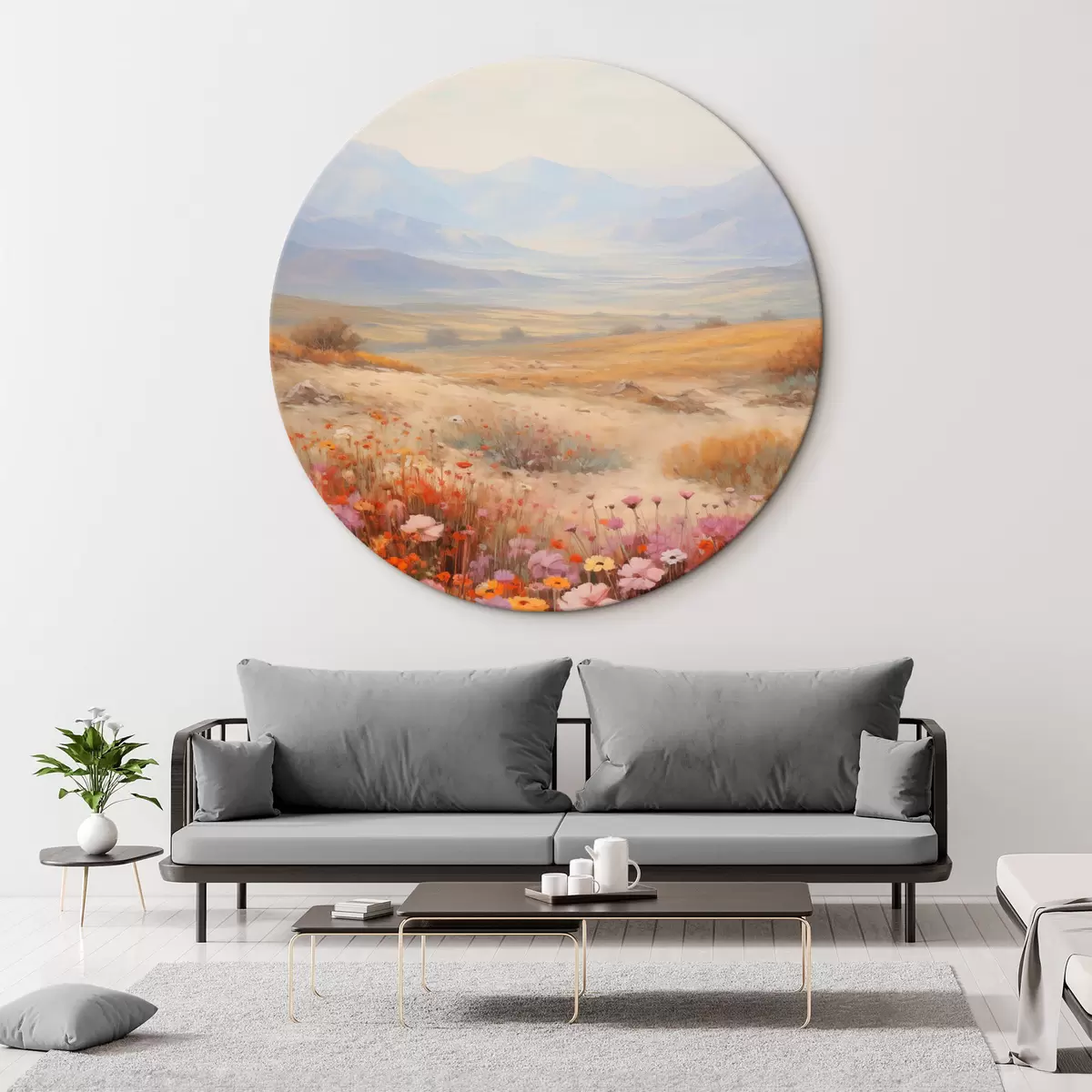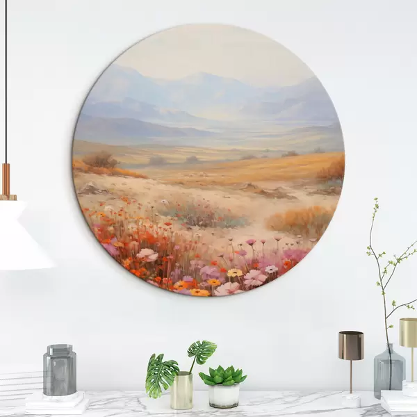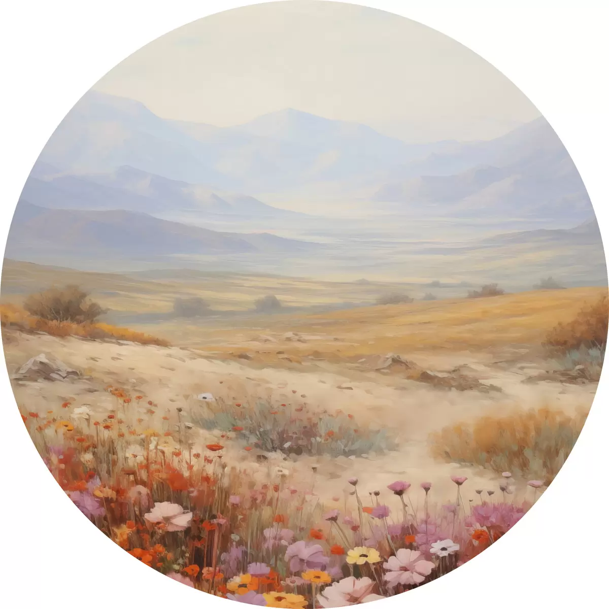 Runde Gemälde Landschaft, ein Feld voller bunter Blumen mit Bergen im Hintergrund, sanfte Pastellfarben r46685