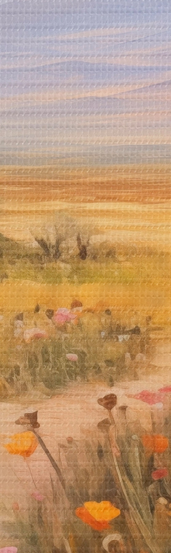 Runde Gemälde Landschaft, ein Feld voller bunter Blumen mit Bergen im Hintergrund, sanfte Pastellfarben r46686