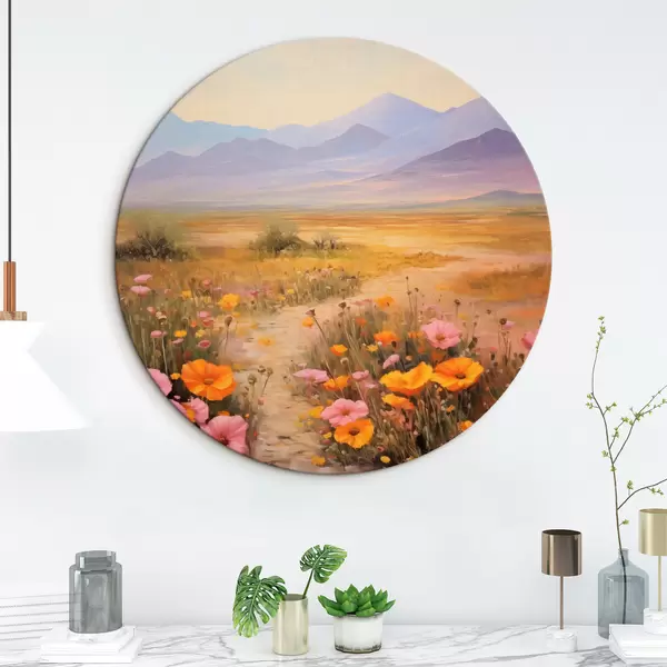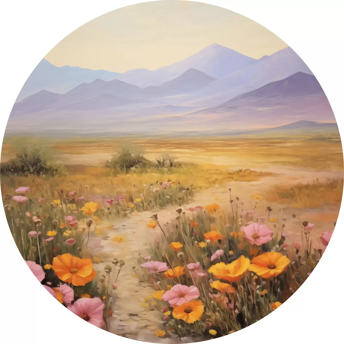 Runde Gemälde Landschaft, ein Feld voller bunter Blumen mit Bergen im Hintergrund, sanfte Pastellfarben r46686