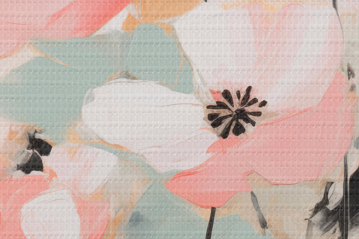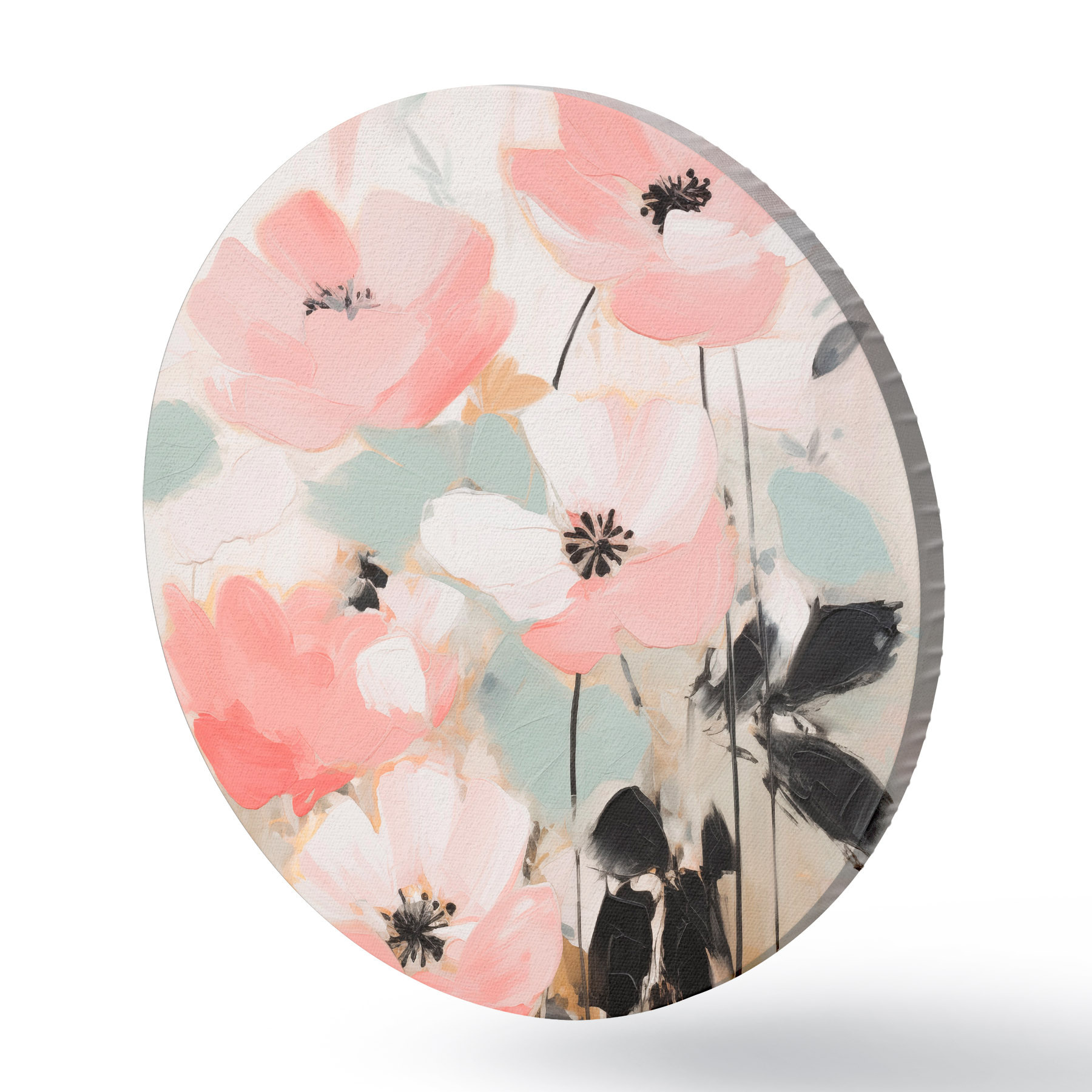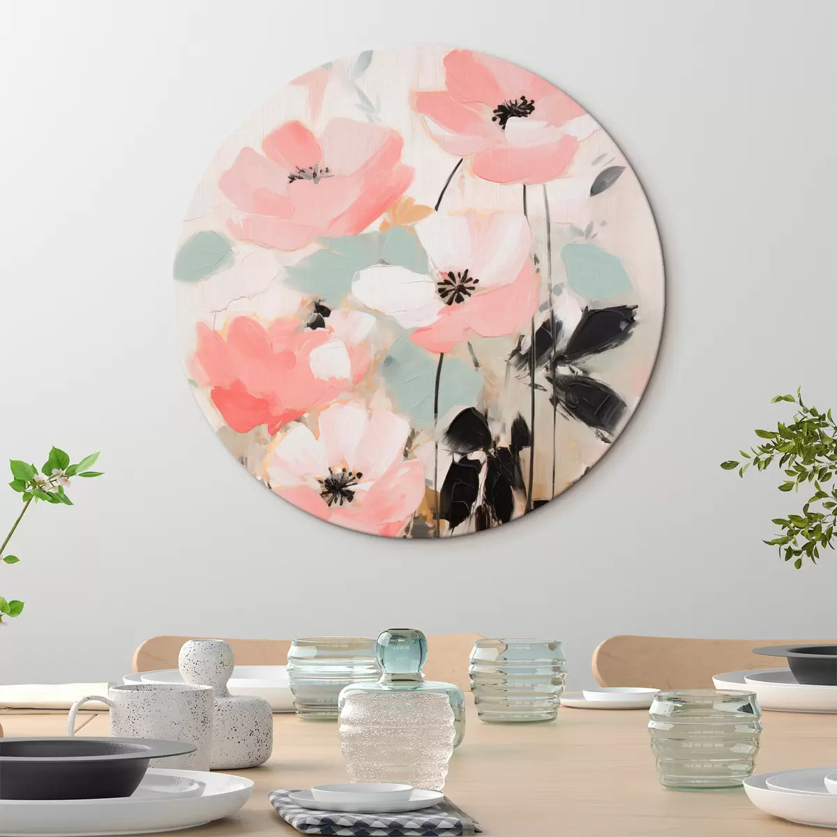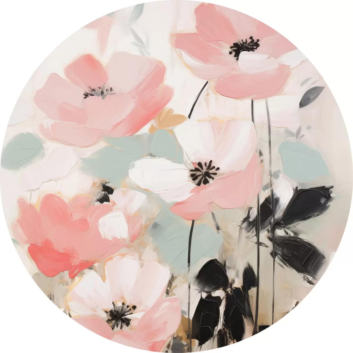 Runde Gemälde Rosa und schwarze Blumen mit Blättern, sanfte Pastellfarben, abstraktes Blumenarrangement, minimalistische Kunst r46688