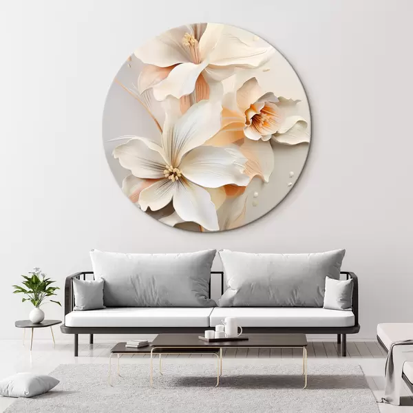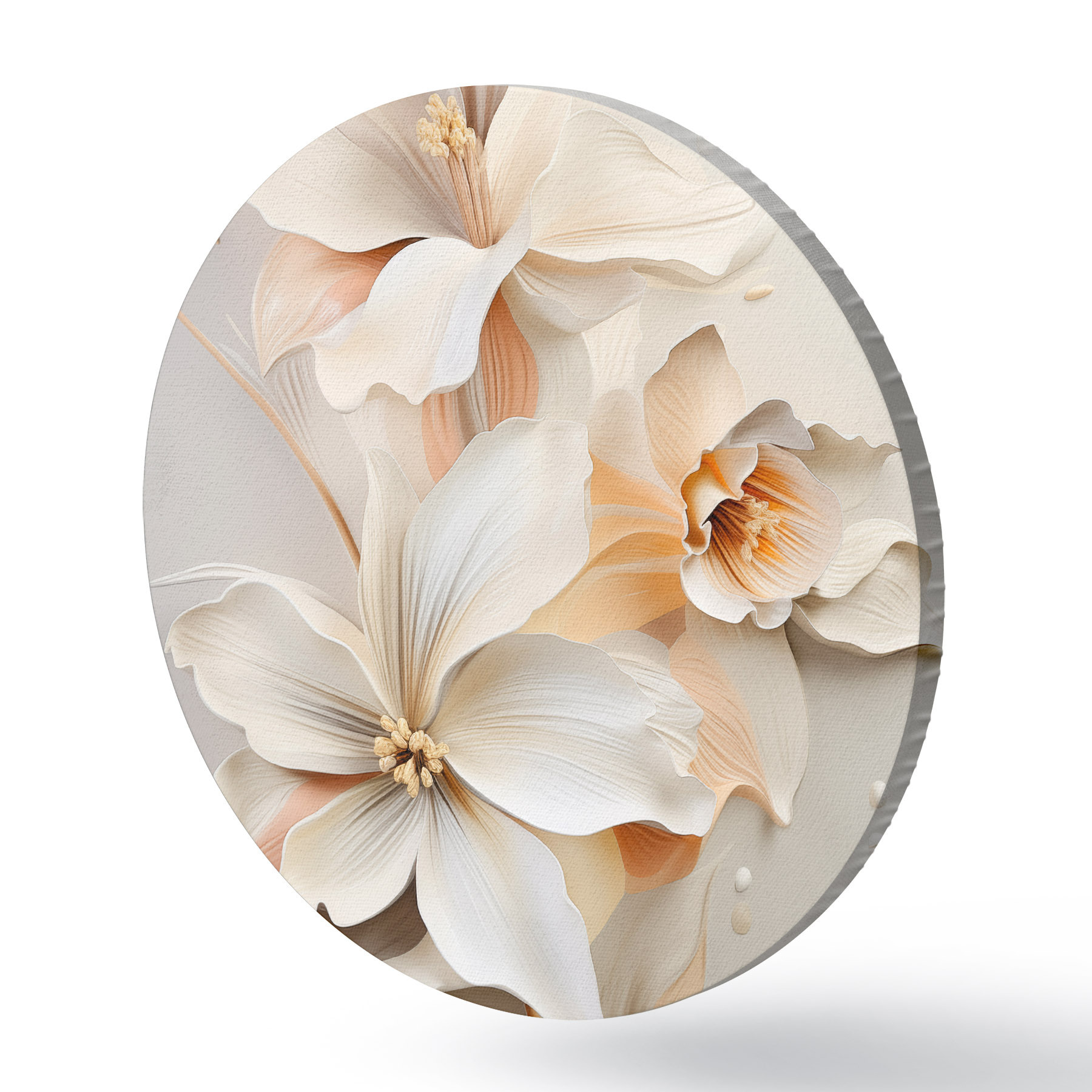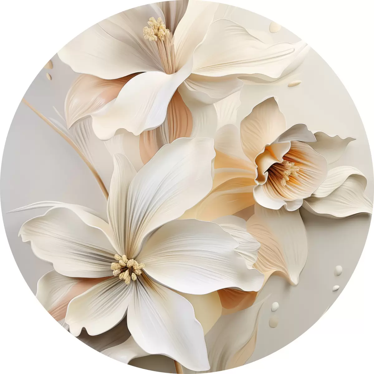 Runde Gemälde Weiße Blumen, Blütenblätter mit sanften Schatten, hellbeiger Hintergrund, elegante Komposition, minimalistischer Stil r46699