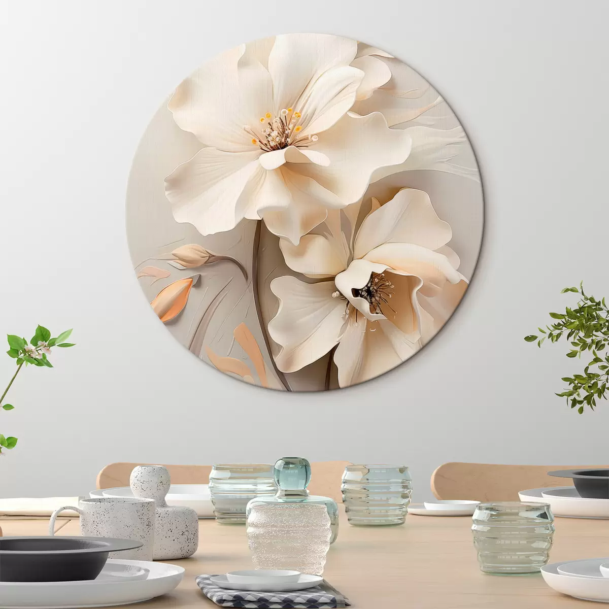 Runde Gemälde Weiße Blumen, Blütenblätter mit sanften Schatten, hellbeiger Hintergrund, elegante Komposition, minimalistischer Stil r46700