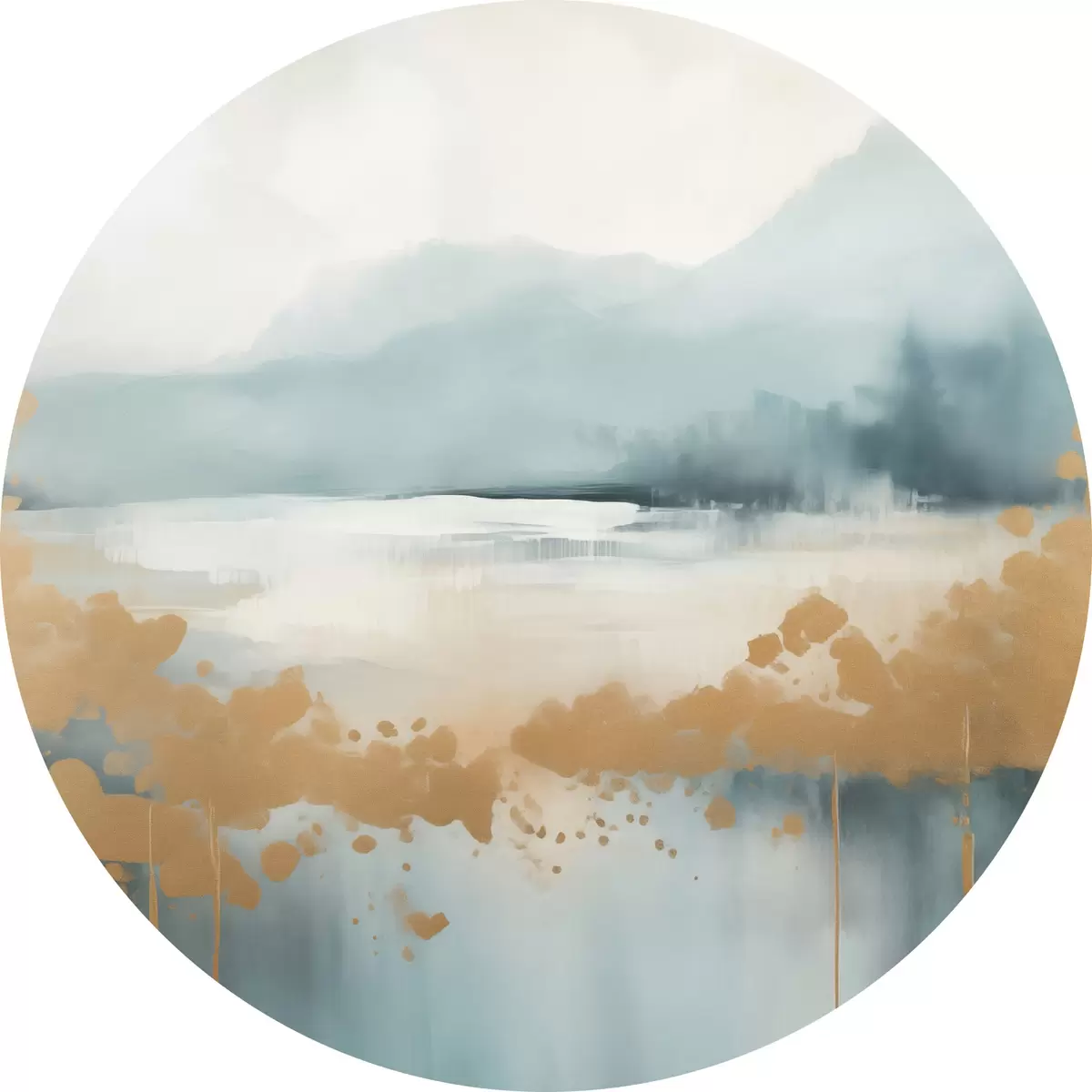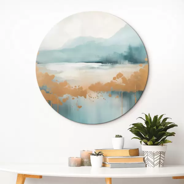 Runde Gemälde Abstrakte Landschaft mit Bergen und See in Blaugrün und strukturiertem Gelb, weiche Pinselstriche, minimalistisches Kunstwerk r46703