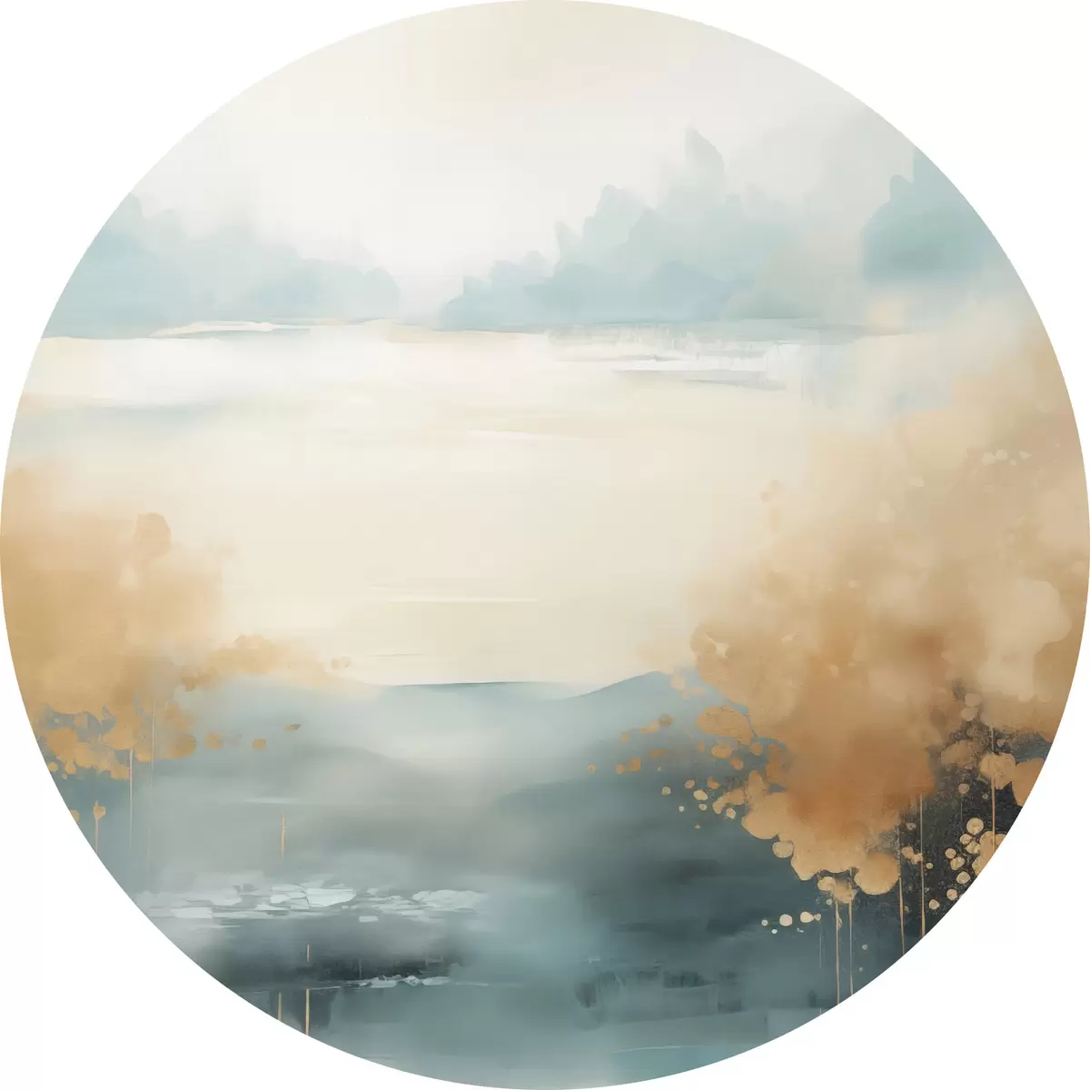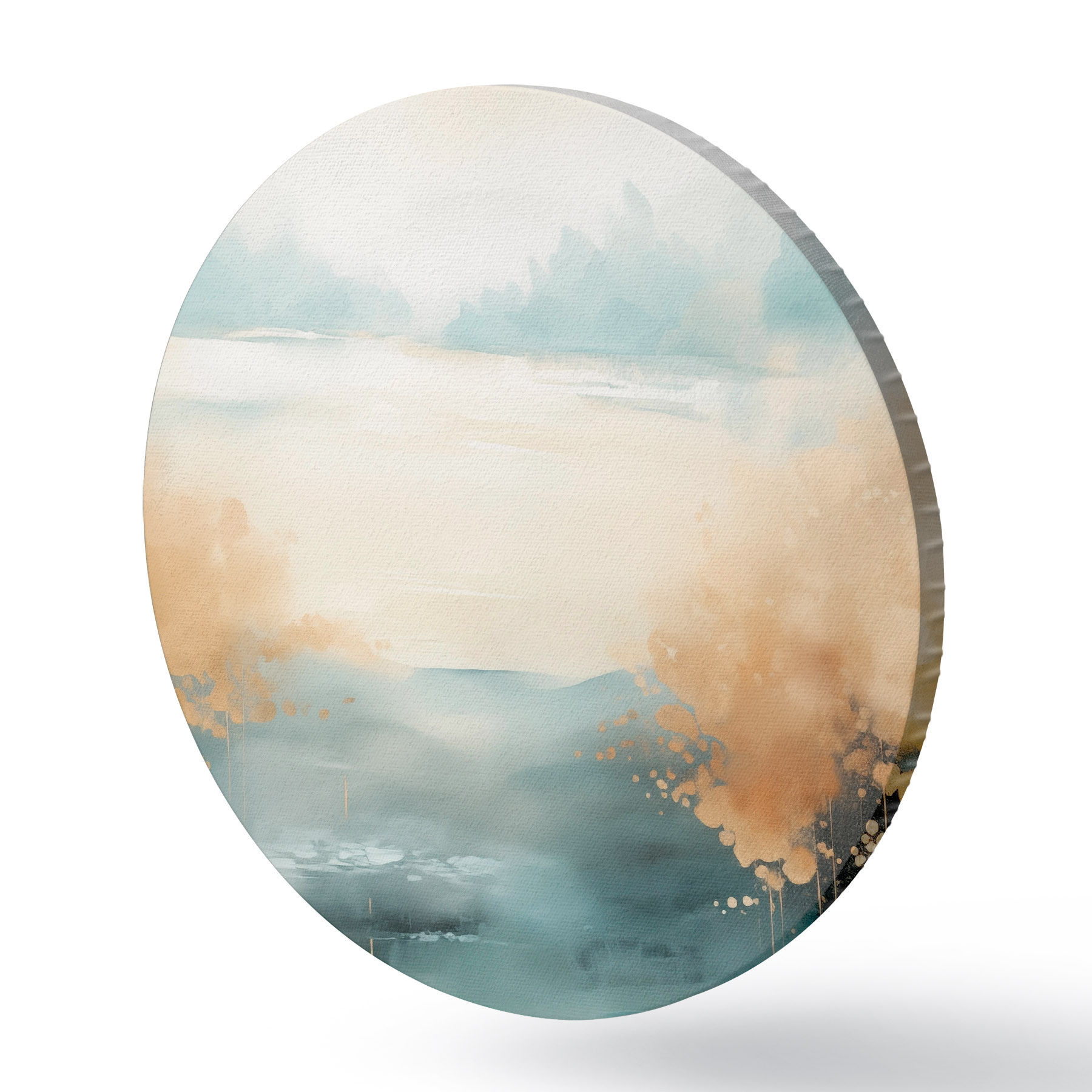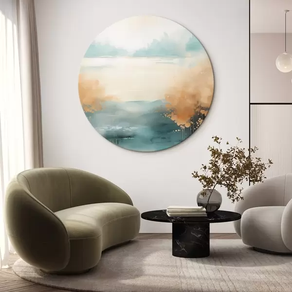 Runde Gemälde Abstrakte Landschaft mit Bergen und See in Blaugrün und strukturiertem Gelb, weiche Pinselstriche, minimalistisches Kunstwerk r46704