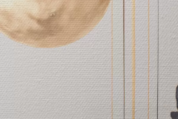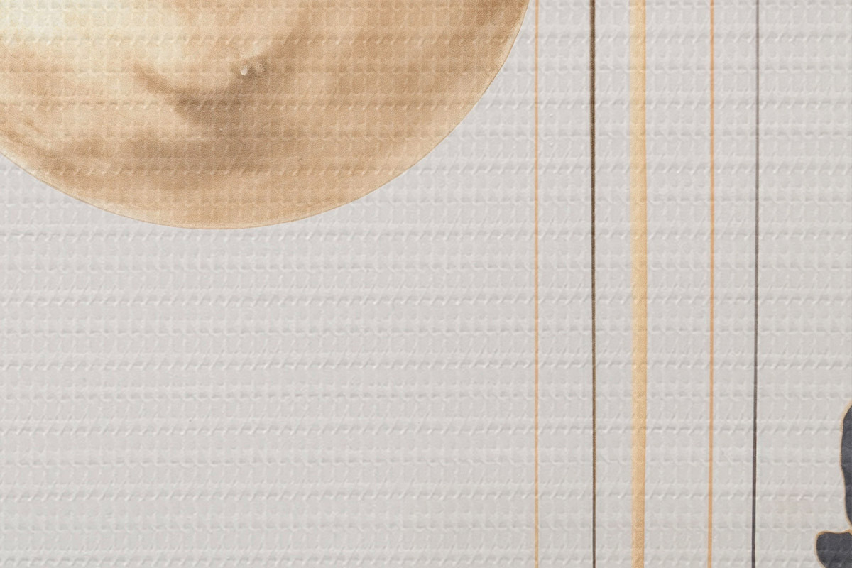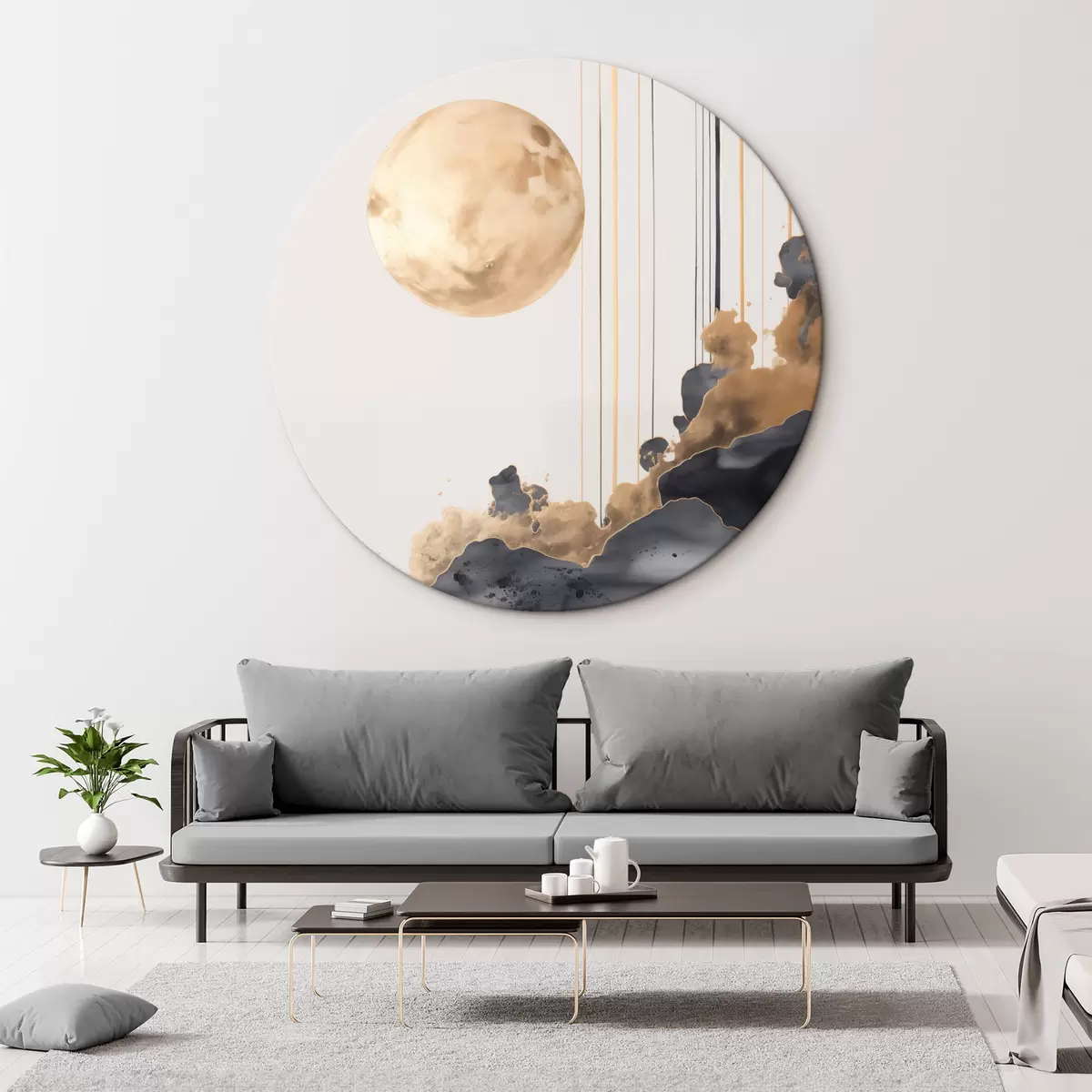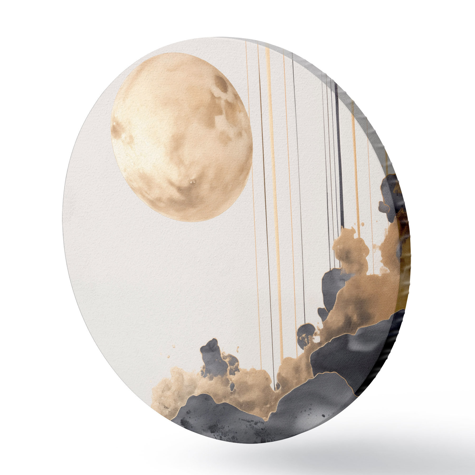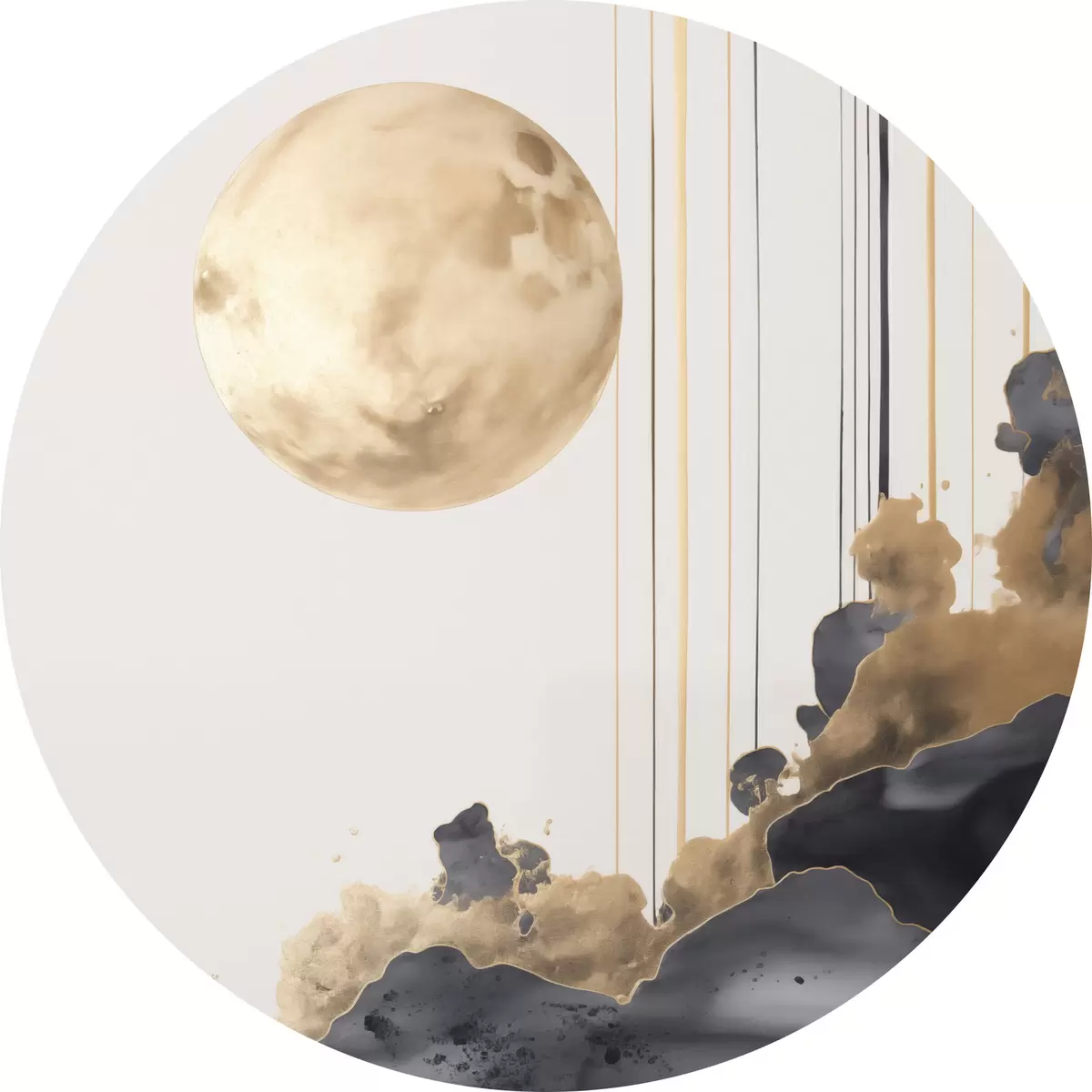 Runde Gemälde Vollmond mit schwarzen und strukturierten gelben Wolken, vertikalen Linien, abstrakter Stil, minimalistisch und modern r46707