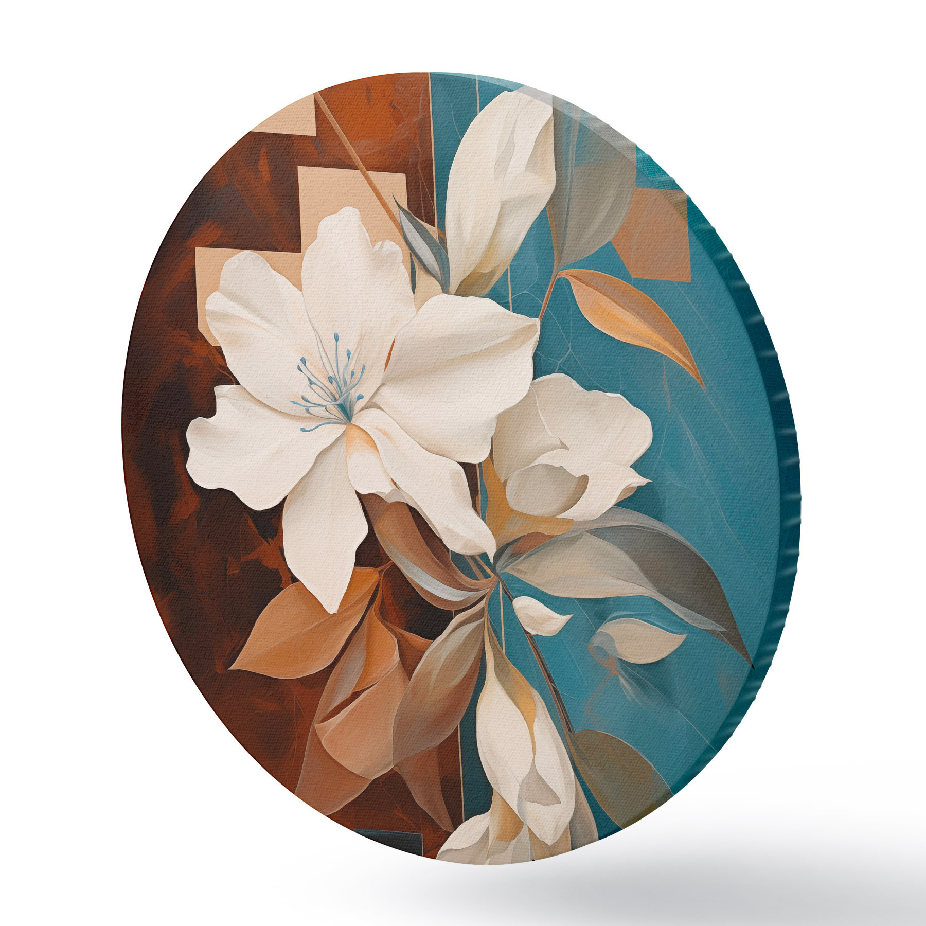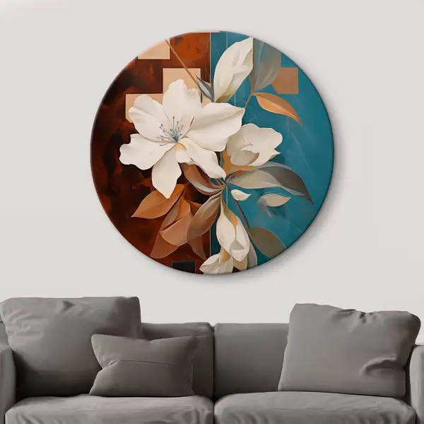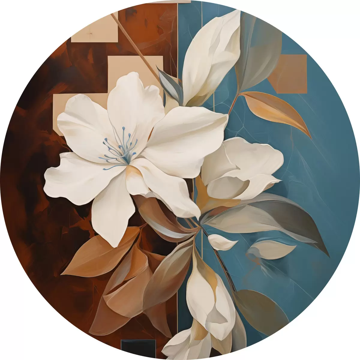 Runde Gemälde Abstrakte weiße Blumen und Blätter vor einem Hintergrund aus Braun und Blau mit abstrakten Formen, in minimalistischem Stil r46709