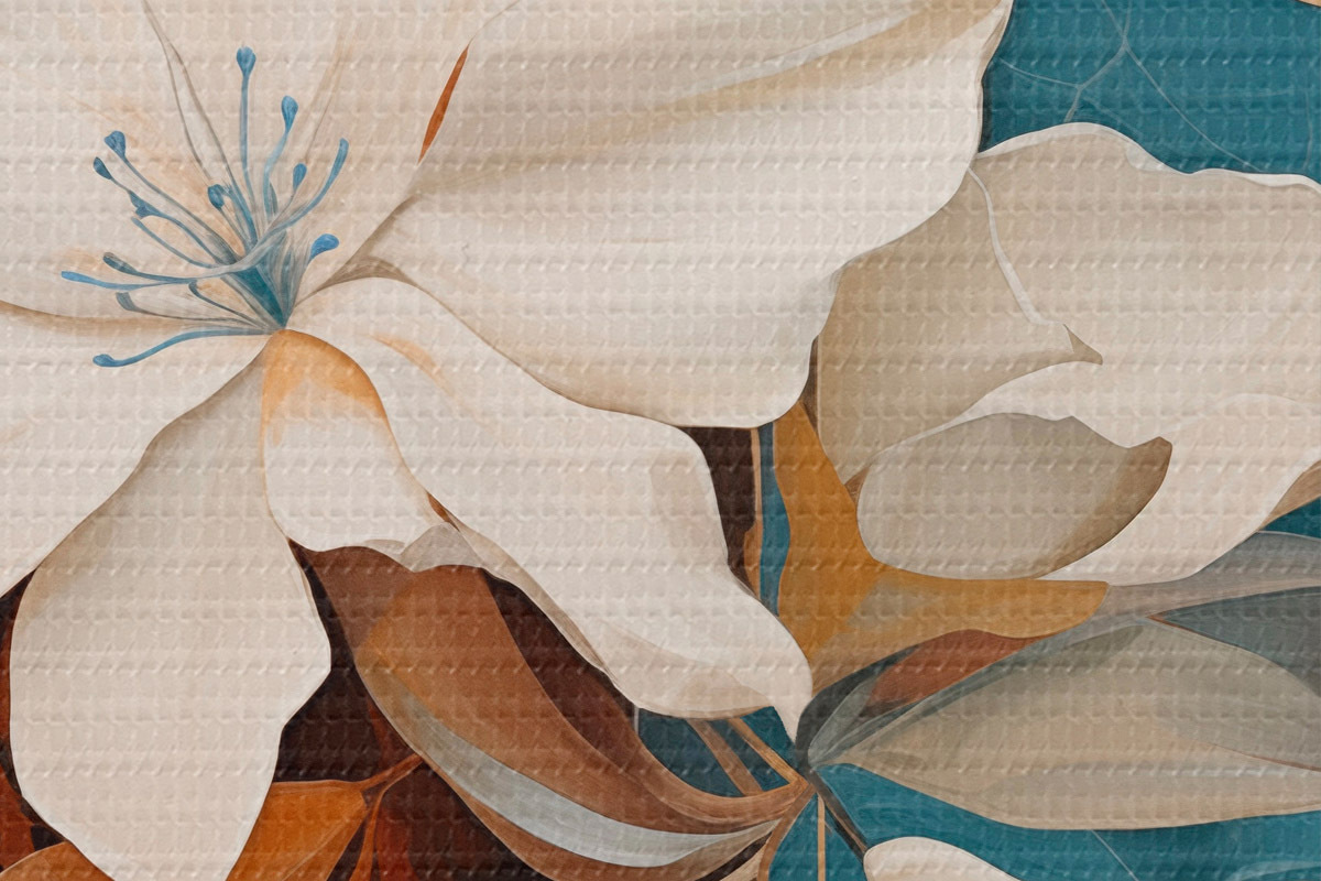 Bild Abstrakte weiße Blumen und Blätter vor einem Hintergrund aus Braun und Blau mit abstrakten Formen, in minimalistischem Stil Nr r46709