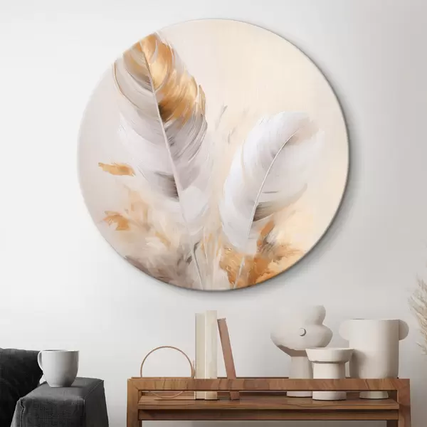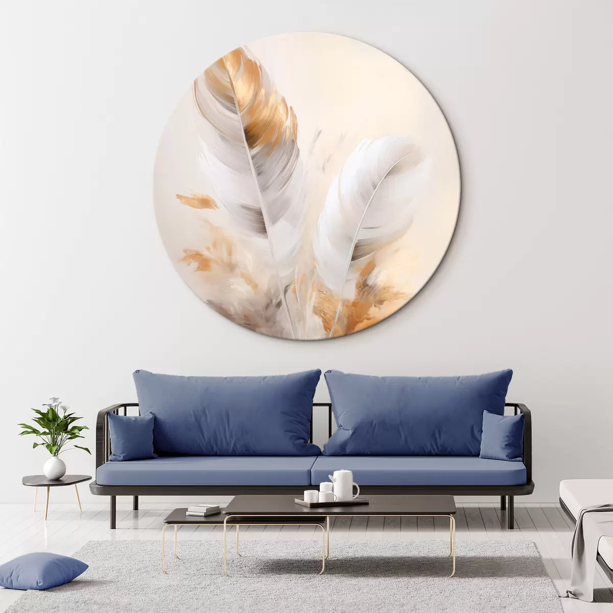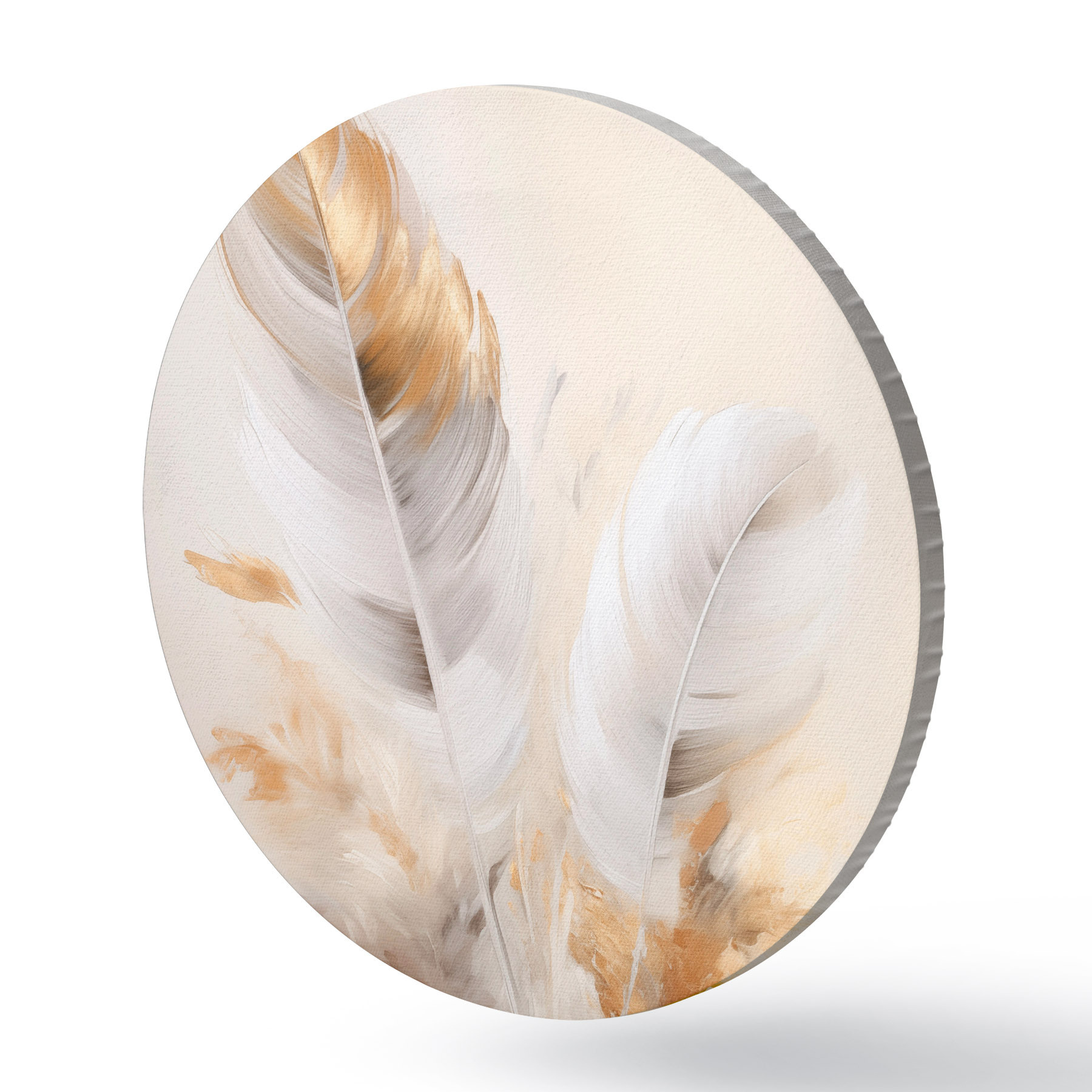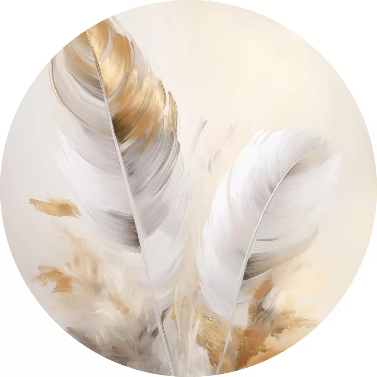 Runde Gemälde Abstrakte Federn, umgeben von beigen und braunen Federn, weich und zart, auf hellbeigem Hintergrund r46711