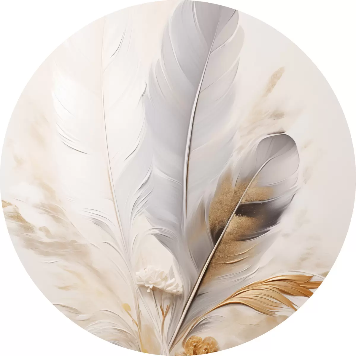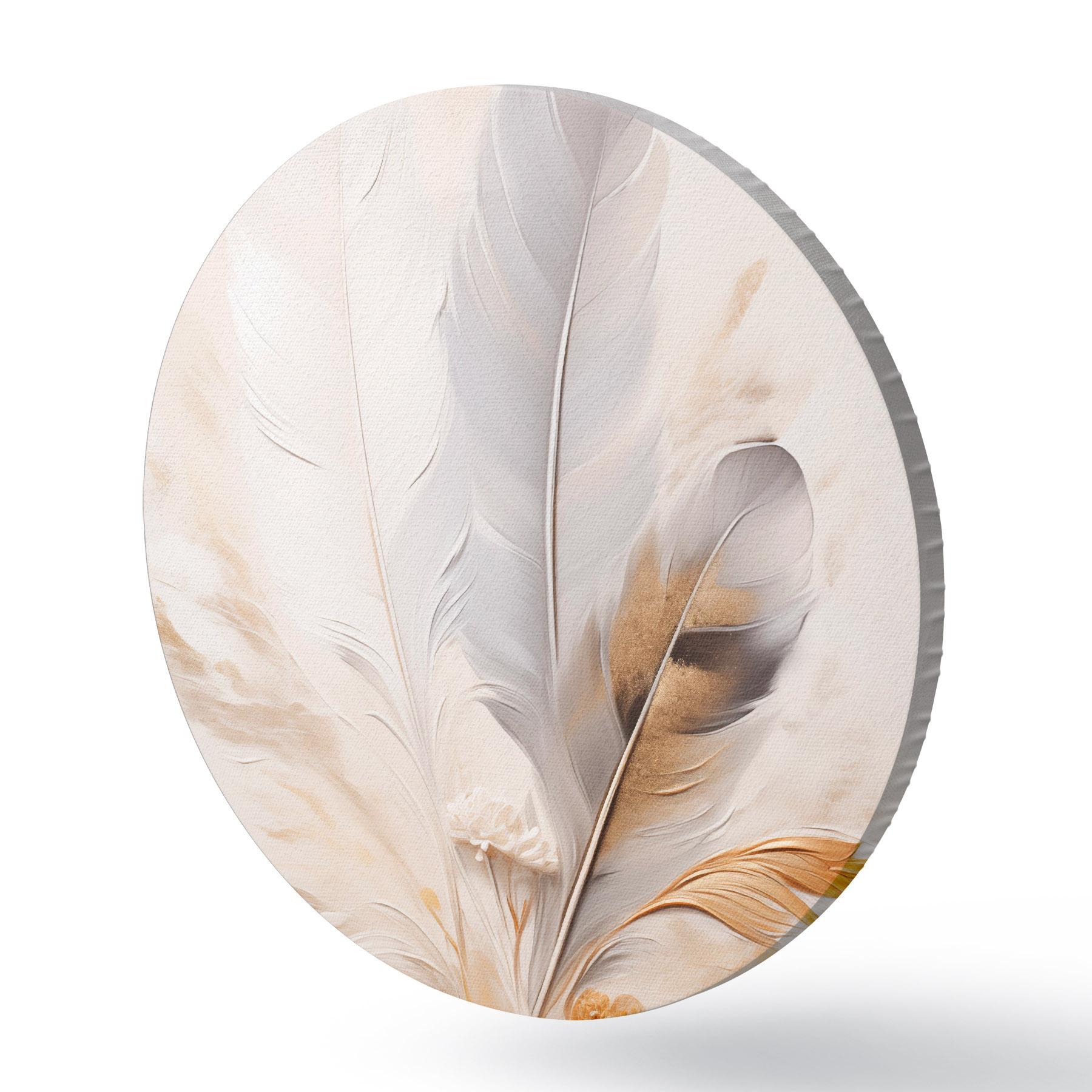 Runde Gemälde Abstrakte Federn, umgeben von beigen und braunen Federn, weich und zart, auf hellbeigem Hintergrund r46712