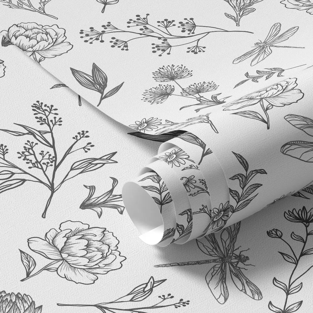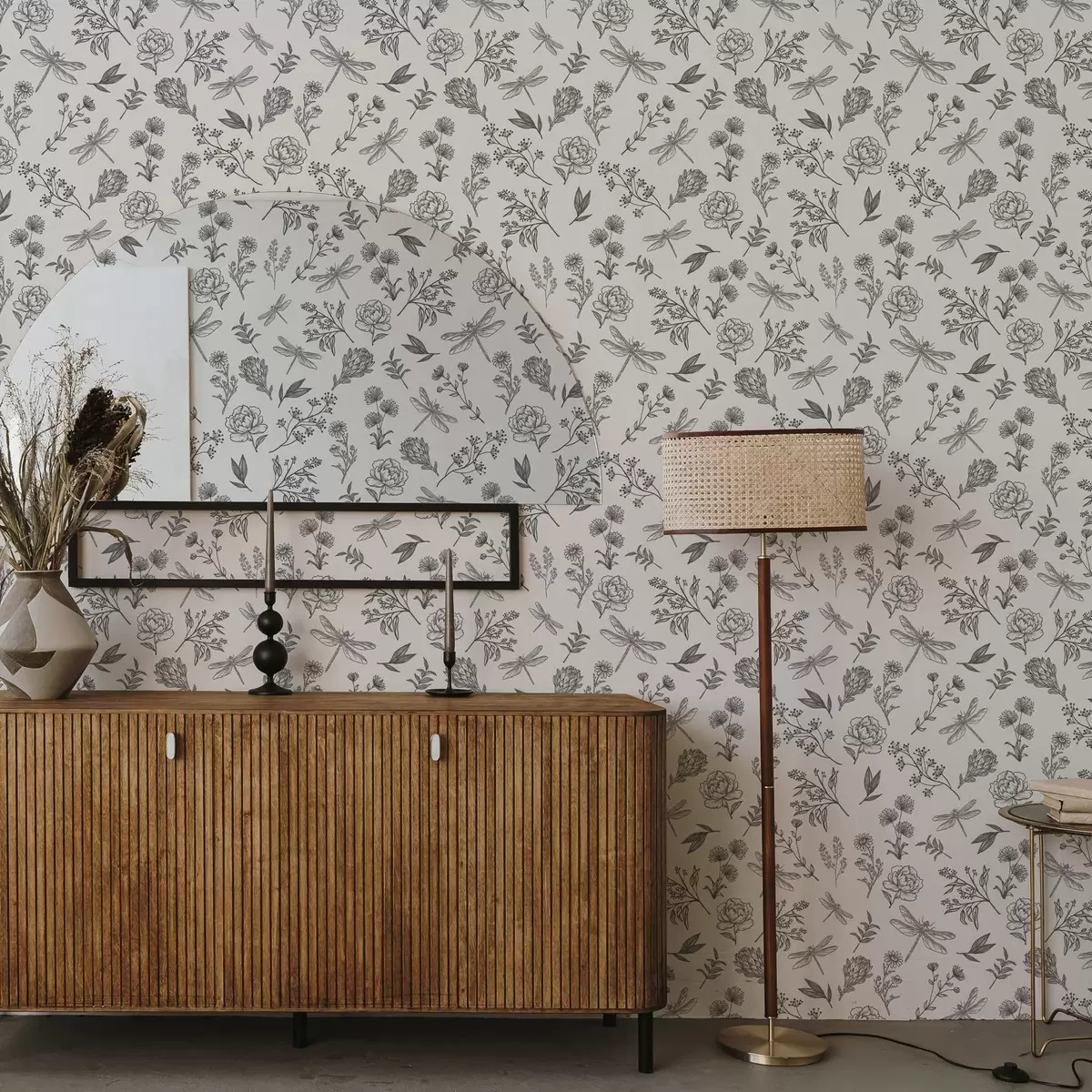 Tapete Blumen, Blätter und Libellen auf weißem Hintergrund Nr. a00025v1