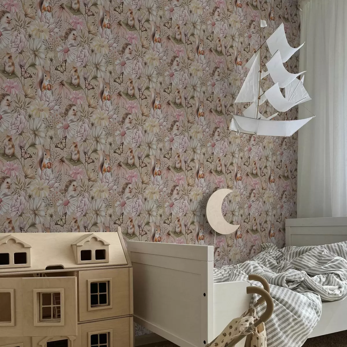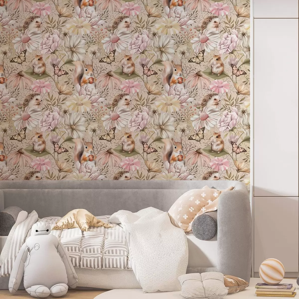 Tapete Niedlicher Igel, Eichhörnchen, Hamster und Schmetterlinge mit Blumen in Pastellfarben Nr. a00051