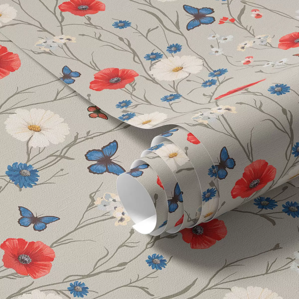 Tapete Mohnblumen, Gänseblümchen und Schmetterlinge auf hellgrauem Hintergrund Nr. a00072v1
