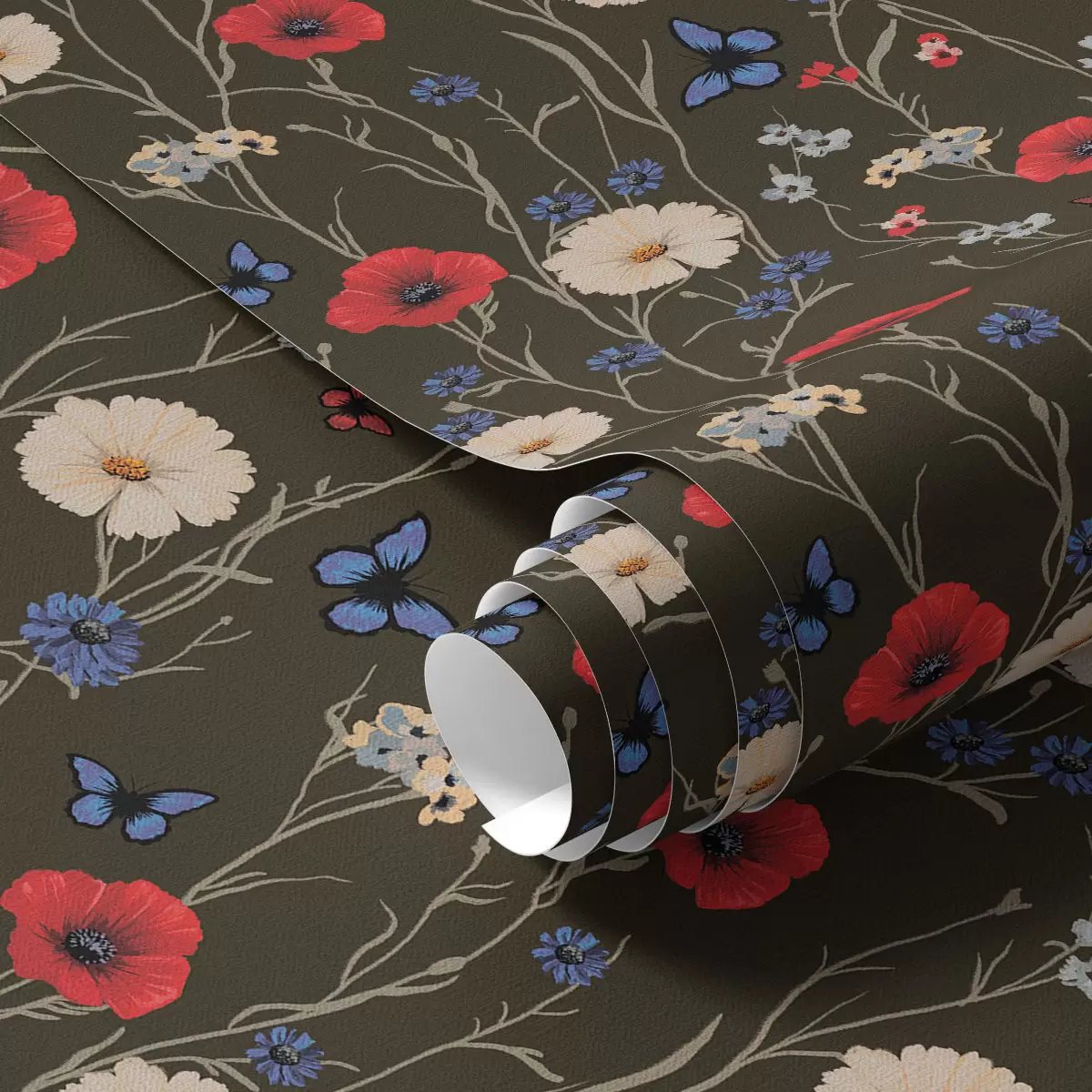 Tapete Mohnblumen, Gänseblümchen und Schmetterlinge auf einem dunklen Hintergrund Nr. a00072v2